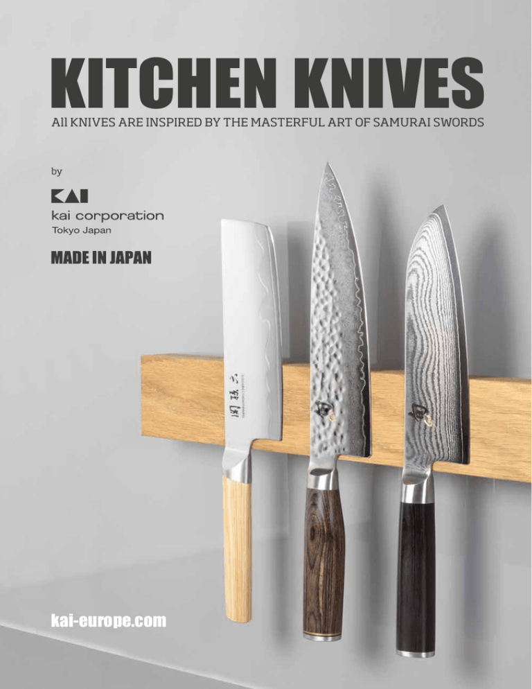 KITCHEN KNIVES All KNIVES ARE INSPIRED BY THE MASTERFUL ART OF SAMURAI SWORDS by kai-europe.com kai – a japanese brand. Fashion, lifestyle, media world – Japan is ahead of time. Whatever is going to develop, Tokyo already has it. Japanese products are also in great demand around the world. The Far Eastern blend of harmony, minimalism and function combined with convincing quality leads to a magic formula of a great number of popular lifestyle products. kai products have long had cult status in Japan with an unmistakable degree of recognition. Founded in Seki in 1908, the company has for 100 years developed and sold cutlery and related products of excellent sharpness and function. One of the company’s specialities are Japanese chef’s knives of outstanding quality and origins. The common denominator is based on the centuries old art of Japanese Samurai sword forging. Technical innovations and the constant drive for aesthetic design give kai chef’s knives their unmistakable and global recognition. The kai Group is based in Tokyo with subsidiaries in Hong Kong, Portland/ USA and Solingen/Germany. The company employs more than 1.000 staff world-wide. A touch of far eastern dining culture. Japan is known for its versatile culture, economy and history. Thinking about Japanese cuisine inevitably leads to the world-famous Sushi and with it a very distinct image: rice and raw fish are indispensable ingredients. The Japanese love fresh ingredients and are adverse to long cooking times; they prefer the natural taste. Each Japanese region has its own culinary specialties. Owing to centuries of isolation, the Japanese have learned to perfect seasonal cuisine and to make the most of local ingredients. Apart from fresh ingredients the aesthetic presentation of food is of outstanding importance. Even the smallest culinary delights are artfully prepared. The Japanese think holistically, thus cooking, art and philosophy are inseparable. The right choice of knife is an essential part of the joy of cooking. 06 16 18 22 26 Shun Classic Series Shun Accessories Shun Pro Sho Series Shun Kaji Series Shun Premier Tim Mälzer Series 32 Tim Mälzer Junior Kitchen Knife 36 Seki Magoroku - Composite Serie s 40 Seki Magoroku - Vintage Series 44 Seki Magoroku - Red Wood Series 48 Wasabi Black Series 54 60 66 70 72 73 78 Michel Bras Tools Knife Blocks/Cutting Boards Grinding Accessories Blade protector Select Utilities Blendia Handy Food Processor All-Purpose Scissors 84 Notes to the Knives www.kai-europe.com SHUN CLASSIC SERIES WITH 28 SHAPES The Shun series of chef‘s knives is one of the most comprehensive damask steel series worldwide and highly appreciated by top class professionals as well as ambitious hobby chefs. Shun professional chef’s knives are made from specific stainless damask steel with 32 layers. The core layer is made from VG-MAX steel. This is an extremely hard (61±1 HRC, 1.0% carbon, 1.5% cobalt) and corrosion-resistant steel that gives the blade a sharpness that is second to none. The convex cut of the blade together with the manual honing of each Shun knife delivers an unrivalled sharpness that allows the knife to cut through even the toughest material. This sharpness together with the well-balanced weight of the knife makes for tireless work. Each Shun knife gets its unique and individual character by refining the natural beauty of the damask grain. This way every Shun knife is unmistakable and unique – a piece of art, united by craftsmanship, technology and design. Inspired by the masterful art of Samurai swords the technique for manufacturing the finest chef’s knives enables the Shun series even to deliver knives with western blade shapes. Each Shun knife gets its unique and individual character by refining the natural beauty of the damask grain. This way every Shun knife is unmistakable and unique – a piece of art, united by craftsmanship, technology and design. Inspired by the masterful art of Samurai swords the technique for manufacturing the finest chef’s knives enables the Shun series even to deliver knives with western blade shapes. 06 Vegetable knife DM-0715, Blade 2.5“ / 6,0 cm, Handle 10,4 cm Vegetable knife DM-0714, Blade 3.5“ / 9,0 cm, Handle 10,4 cm Office knife DM-0700, Blade 3.5“ / 9,0 cm, Handle 10,4 cm Steak knife DM-0711, Blade 4.75“ / 12,0 cm, Handle 10,4 cm Steak Boning knife DM-0710, Blade 6.0“ / 15,0 cm, Handle 12,2 cm Gokujo Boning knife DM-0743, Blade 6.0“ / 15,0 cm, Handle 11,2 cm SHUN CLASSIC SERIES | 08 Utility knife DM-0716, Blade 4.0“ / 10,0 cm, Handle 10,4 cm Utility knife DM-0701, Blade 6.0“ / 15,0 cm, Handle 10,4 cm Tomato knife DM-0722, Blade 6.0“ / 15,0 cm, Handle 10,4 cm Bread knife DM-0705, Blade 9.0“ / 23,0 cm, Handle 12,2 cm Chinese chef’s knife DM-0712, Blade 7.0“ / 18,0 cm, Handle 12,2 cm 09 Small Santoku DM-0727, Blade 5.5“ / 14,0 cm, Handle 11,2 cm Santoku DM-0702, Blade 7.0“ / 18,0 cm, Handle 12,2 cm Santoku, hollow ground DM-0718, Blade 7.0“ / 18,0 cm, Handle 12,2 cm Santoku DM-0717, Blade 7.5“ / 19,0 cm, Handle 12,2 cm Nakiri DM-0728, Blade 6.5“ / 16,5 cm, Handle 12,2 cm SHUN CLASSIC SERIES | 10 Chef’s knife DM-0746, Blade 4.25“ / 11,0 cm, Handle 11,2 cm Chef’s knife DM-0723, Blade 6.0“ / 15,0 cm, Handle 11,2 cm Chef’s knife DM-0706, Blade 8.0“ / 20,0 cm, Handle 12,2 cm Chef’s knife, hollow ground DM-0719, Blade 8.0“ / 20,0 cm, Handle 12,2 cm Chef’s knife DM-0707, Blade 10.0“ / 25,5 cm, Handle 12,2 cm 11 Carving knife DM-0703, Blade 8.0“ / 20,0 cm, Handle 12,2 cm Carving fork DM-0709, Blade 6.5“ / 16,5 cm, Handle 11,6 cm Small slicing knife DM-0768, Blade 7.0“ / 18,0 cm, Handle 12,2 cm Slicing knife DM-0704, Blade 9.0“ / 23,0 cm, Handle 12,2 cm Slicing knife, hollow ground DM-0720, Blade 9.0“ / 23,0 cm, Handle 12,2 cm SHUN CLASSIC SERIES | 12 Small slicing knife / flexible AUS8A steel (no damask) DM-0761, Blade 7.0“ / 18,0 cm, Handle 12,2 cm Ham slicer / flexible AUS8