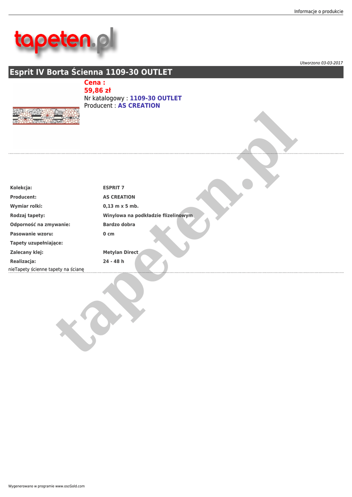 Informacje o produkcie Utworzono 03-03-2017 Esprit IV Borta Ścienna 1109-30 OUTLET Cena : 59,86 zł .p l Nr katalogowy : 1109-30 OUTLET Producent : AS CREATION tapety winylowe tapety ścienne winylowe tapety ścienne nowoczesne tapety ścienne aranżacje tapety ścienne wzory tapety scienne tapety na sciane tapety flizelinowe tapety ścienne winylowe na flizeli Producent: Wymiar rolki: Rodzaj tapety: ESPRIT 7 pe te n Kolekcja: AS CREATION 0,13 m x 5 mb. Winylowa na podkładzie flizelinowym Odporność na zmywanie: Bardzo dobra Pasowanie wzoru: 0 cm Tapety uzupełniające: Zalecany klej: Realizacja: Metylan Direct 24 - 48 h ta nieTapety ścienne tapety na ścianę Wygenerowano w programie www.oscGold.com