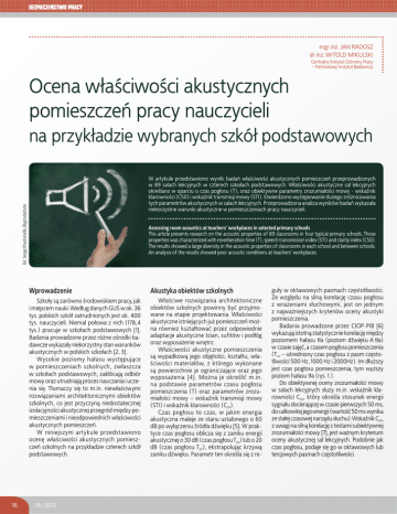 mgr in¿. JAN RADOSZ dr in¿. WITOLD MIKULSKI Centralny Instytut Ochrony Pracy – Pañstwowy Instytut Badawczy Ocena w³aściwości akustycznych pomieszczeñ pracy nauczycieli na przyk³adzie wybranych szkó³ podstawowych Fot. Sergej Khackimullin/Bigstockphoto W artykule przedstawiono wyniki badañ w³aściwości akustycznych pomieszczeñ przeprowadzonych w 89 salach lekcyjnych w czterech szko³ach podstawowych. W³aściwości akustyczne sal lekcyjnych określano w oparciu o czas pog³osu (T), oraz obiektywne parametry zrozumia³ości mowy - wskaźnik klarowności (C50) i wskaźnik transmisji mowy (STI). Stwierdzono wystêpowanie du¿ego zró¿nicowania tych parametrów akustycznych w salach lekcyjnych. Przeprowadzona analiza wyników badañ wykaza³a niekorzystne warunki akustyczne w pomieszczeniach pracy nauczycieli. 16 Assessing room acoustics at teachers’ workplaces in selected primary schools This article presents research on the acoustic properties of 89 classrooms in four typical primary schools. Those properties was characterized with reverberation time (T), speech transmission index (STI) and clarity index (C50). The results showed a large diversity in the acoustic properties of classrooms in each school and between schools. An analysis of the results showed poor acoustic conditions at teachers’ workplaces. Wprowadzenie Akustyka obiektów szkolnych Szko³y s¹ zarówno środowiskiem pracy, jak i miejscem nauki. Wed³ug danych GUS w ok. 36 tys. polskich szkó³ zatrudnionych jest ok. 400 tys. nauczycieli. Niemal po³owa z nich (178,4 tys.) pracuje w szko³ach podstawowych [1]. Badania prowadzone przez ró¿ne ośrodki badawcze wykaza³y niekorzystny stan warunków akustycznych w polskich szko³ach [2, 3]. Wysokie poziomy ha³asu wystêpuj¹ce w pomieszczeniach szkolnych, zw³aszcza w szko³ach podstawowych, zak³ócaj¹ odbiór mowy oraz utrudniaj¹ proces nauczania i uczenia siê. T³umaczy siê to m.in. niew³aściwymi rozwi¹zaniami architektonicznymi obiektów szkolnych, co jest przyczyn¹ niedostatecznej izolacyjności akustycznej przegród miêdzy pomieszczeniami i nieodpowiednich w³aściwości akustycznych pomieszczeñ. W niniejszym artykule przedstawiono ocenê w³aściwości akustycznych pomieszczeñ szkolnych na przyk³adzie czterech szkó³ podstawowych. W³aściwe rozwi¹zania architektoniczne obiektów szkolnych powinny byæ przyjmowane na etapie projektowania. W³aściwości akustyczne istniej¹cych ju¿ pomieszczeñ mo¿na równie¿ kszta³towaæ przez odpowiednie adaptacje akustyczne ścian, sufitów i pod³óg oraz wyposa¿enie wnêtrz. W³aściwości akustyczne pomieszczenia s¹ wypadkow¹ jego objêtości, kszta³tu, w³aściwości materia³ów, z którego wykonane s¹ powierzchnie je ograniczaj¹ce oraz jego wyposa¿enia [4]. Mo¿na je określiæ m.in. na podstawie parametrów czasu pog³osu pomieszczenia (T) oraz parametrów zrozumia³ości mowy – wskaźnik transmisji mowy (STI) i wskaźnik klarowności (C50). Czas pog³osu to czas, w jakim energia akustyczna maleje ze stanu ustalonego o 60 dB po wy³¹czeniu źród³a dźwiêku [5]. W praktyce czas pog³osu oblicza siê z zaniku energii akustycznej o 30 dB (czas pog³osu T30) lub o 20 dB (czas pog³osu T20), ekstrapoluj¹c krzyw¹ zaniku dźwiêku. Parametr ten określa siê z re- 06/2012 gu³y w oktawowych pasmach czêstotliwości. Ze wzglêdu na siln¹ korelacjê czasu pog³osu z wra¿eniami s³uchowymi, jest on jednym z najwa¿niejszych kryteriów oceny akustyki pomieszczenia. Badania prowadzone przez CIOP-PIB [6] wykazuj¹ istotn¹ statystycznie korelacjê miêdzy poziomem ha³asu t³a (poziom dźwiêku A t³a) w czasie zajêæ, a czasem pog³osu pomieszczenia (Tmf – uśredniony czas pog³osu z pasm czêstotliwości 500 Hz, 1000 Hz i 2000Hz). Im d³u¿szy jest czas pog³osu pomieszczenia, tym wy¿szy poziom ha³asu t³a (rys. 1.). Do obiektywnej oceny zrozumia³ości mowy w salach lekcyjnych s³u¿y m.in. wskaźnik klarowności C50, który określa stosunek energii sygna³u docieraj¹cej w czasie pierwszych 50 ms, do ca³kowitej jego energii (wartośæ 50 ms wynika ze sta³ej czasowej narz¹du s³uchu).Wskaźnik C50, z uwagi na siln¹ korelacjê z testami subiektywnej zrozumia³ości mowy [7], jest wa¿nym kryterium oceny akustycznej sal lekcyjnych. Podobnie jak czas pog³osu, podaje siê go w oktawowych lub tercjowych pasmach czêstotliwości. 62 60 58 56 54 52 50 48 46 44 42 40 38 0,5 100 99 Wsp. korelacji liniowej Pearsona 0.82 (p<0.05) 98 97 SI [%] Poziom ha³asu t³a w czasie zajêæ [dB] WIBROAKUSTYKA 96 95 94 93 92 91 0,7 0,9 1,1 Tmf [s] 1,3 1,5 -5 1,7 -4 0 – 0,3 0,3 – 0,45 0,45 – 0,6 0,60 – 0,75 0,75 – 1,0 Brak zrozumia³ości S³aba Dostateczna Dobra Znakomita Tab. 2. Dopuszczalne wartości czasu pog³osu i wskaźnika transmisji mowy w szko³ach podstawowych Tab. 2. Admissible values of reverberation time and speech transmission index (STI) in primary school classrooms Kraj Dokument Czas pog³osu [s] STI Francja Holandia Dekret 1995 Wytyczne NEN 5077 0,4-0,8 0,8 – – Szwecja Norma SS025268 0,5-0,6 – Norwegia Norma NS 8175 – Portugalia Norma NBR 12179, 1992 USA Norma ANSI S.12.60 Wielka Brytania Wytyczne BB93 0,6 0,6-0,8 (250-4000 Hz) 1 (125-250 Hz) Tmf < 0,6 (dla V < 283 m3) Tmf < 0,7 (dla V > 283m3 i V 566m3) Tmf < 0,6 szko³a podstawowa Tmf < 0,8 szko³a średnia Australia i Nowa Zelandia Norma AS/NZS 2107 Tmf < 0,4-0,5 – Finlandia Norma SFS 5907:en 0,6-0,8 (w zakresie 250 – 4000 Hz) o 50% wy¿szy dla 125 Hz Klasa A i B: STI0,8 Klasa C: STI0,7 – – STI0,6 Tab. 3. Zalecane wartości czasów pog³osu wg projektu normy prPN-B-02151-4 [14] Tab. 3. Recommended values for reverberation time T in classrooms according to draft Polish standard prPN-B-02151-4 [14] Klasy szkolne (o objêtości 30 -1000 m3) -1 0 1 2 3 4 Rys. 2. Zale¿nośæ miêdzy zrozumia³ości¹ mowy SI a wskaźnikiem klarowności C50 [13] Fig. 2. Relationship between speech intelligibility SI and cl
