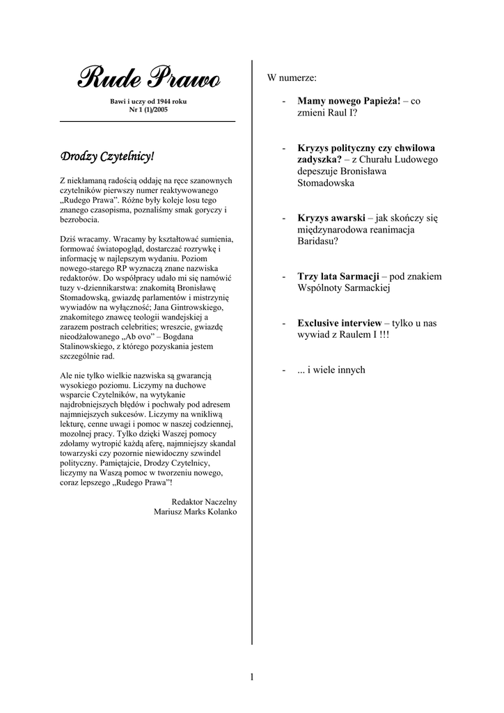 Rude Prawo W numerze: Bawi i uczy od 1944 roku Nr 1 (1)/2005 Drodzy Czytelnicy! Z niekłamaną radością oddaję na ręce szanownych czytelników pierwszy numer reaktywowanego „Rudego Prawa”. Różne były koleje losu tego znanego czasopisma, poznaliśmy smak goryczy i bezrobocia. Dziś wracamy. Wracamy by kształtować sumienia, formować światopogląd, dostarczać rozrywkę i informację w najlepszym wydaniu. Poziom nowego-starego RP wyznaczą znane nazwiska redaktorów. Do współpracy udało mi się namówić tuzy v-dziennikarstwa: znakomitą Bronisławę Stomadowską, gwiazdę parlamentów i mistrzynię wywiadów na wyłączność; Jana Gintrowskiego, znakomitego znawcę teologii wandejskiej a zarazem postrach celebrities; wreszcie, gwiazdę nieodżałowanego „Ab ovo” – Bogdana Stalinowskiego, z którego pozyskania jestem szczególnie rad. Ale nie tylko wielkie nazwiska są gwarancją wysokiego poziomu. Liczymy na duchowe wsparcie Czytelników, na wytykanie najdrobniejszych błędów i pochwały pod adresem najmniejszych sukcesów. Liczymy na wnikliwą lekturę, cenne uwagi i pomoc w naszej codziennej, mozolnej pracy. Tylko dzięki Waszej pomocy zdołamy wytropić każdą aferę, najmniejszy skandal towarzyski czy pozornie niewidoczny szwindel polityczny. Pamiętajcie, Drodzy Czytelnicy, liczymy na Waszą pomoc w tworzeniu nowego, coraz lepszego „Rudego Prawa”! Redaktor Naczelny Mariusz Marks Kolanko 1 - Mamy nowego Papieża! – co zmieni Raul I? - Kryzys polityczny czy chwilowa zadyszka? – z Churału Ludowego depeszuje Bronisława Stomadowska - Kryzys awarski – jak skończy się międzynarodowa reanimacja Baridasu? - Trzy lata Sarmacji – pod znakiem Wspólnoty Sarmackiej - Exclusive interview – tylko u nas wywiad z Raulem I !!! - ... i wiele innych Kraj W skrócie • Wir haben ein Papst! „Ich annunziere eine grosse neuigkeit! WIR HABEN PAPST! Wunderscheine Herr Salwador, sekretar Salwadori, mit neue Name Raul!“ • Tak przewodniczący Konferencji Wandykopatu Archiksięć Winnicki – Konieczny zaanonsował elekcję nowej głowy Świeckiego Kościoła Wandejskiego. Elektorzy w czwartym głosowaniu wybrali na nowego papieża szerzej nieznanego teologa Salwadora Salwadori. • • Tłum zgromadzony przed Bazyliką Wandową owacyjnie powitał nowego papę. Raul I (bo takie przyjął imię) w przemówieniu zapowiedział kontynuację dzieła swoich poprzedników, otwarcie się ŚKW na nowych świeckich wiernych i dialog z innymi wyznaniami v-światowym (katolicyzmem tudzież prężnie rozwijającym się kultem szatana). Jak komentują nasi redakcyjni wandykaniści pierwsze kroki nowego Ojca Świeckiego dobrze rokują na przyszłość. Michaś Winnicki – Konieczny opuścił WSPJ i zasilił szeregi Ligi Obrony Komunizmu. Swą decyzję podyktował konfliktem ideologicznym wewnątrz WSPJ. Wchodzi w życie nowa ustawa o partiach. W zamierzeniu ma ona wyeliminować „partie kanapowe” i spolaryzować życie polityczne. Po krótkim okresie zastoju swoją działalność ożywia Muzeum Narodowe. Najnowsza wystawa prac Tomasza Wyspiańskiego jest już dostępna na stronach WMN. System CINTRA kwitnie! Mandragor Jutrzenki opublikował statystyki świadczące o stałej, wysokiej produkcji w wandejskim systemie gospodarczym. Oprac.: B.S., M.M.K. Bronisława Stomadowska Wywiad z Ojcem Świeckim w dziale „Arka Żenady” Kadłubowy churał kontraktowy? Churał Ludowy w rozsypce? Wieści dochodzące z gmachu na Wolności nie napawają ostatnimi czasy optymizmem. Najpierw, po krótkim i raczej mało owocnym okresie urzędowania, z funkcji kwiatona zrezygnował tow. Kurek. Później, na skutek niezgody dwóch kluczowych klubów w kwestii ustawy o partiach politycznych, doszło do impasu zakończonego dymisją Aleksandra Kellera z funkcji Komisarza Ludowego ds. Kultury i wyrażeniem przez prezydenta Sobczaka gotowości do odejścia z urzędu. W tej atmosferze pełnej wzajemnej wrogości Mandragor Winnicki przedstawił propozycję skrócenia kadencji Churału i prezydenta. Propozycja jest podyktowana niekorzystnym kalendarzem wyborczym i ma pozwolić na ominięcie tradycyjnego sezonu ogórkowego. Kwiatoni zapowiedzieli w tej sytuacji samorozwiązanie i skrócenie kadencji prezydenckiej w czerwcu. RP będzie informować o dalszym rozwoju sytuacji. 2 Zagranica W skrócie • Wizyta wandpasterska na Awarze • Majestatyczny korpus krążownika "Magdalena Środa" pojawił się dziś wieczorem na redzie portu w Awarze Sarmackiej. Na pokładzie krążownika na wandpasterską wizytę przybył Archiksięć Mirii, ppłk Michaś Winnicki - Konieczny w towarzystwie licznego grona wandystrantów. Archiksięć powandosławił prasarmacką Ziemie Awarską a następnie udał się na oficjalną kolację z Diukiem Ministrem Gubernatorem Kościńskim, z którym wymienił kilka uwag i opinii na temat przyszlości wyspy. Raul I powołał do życia Archiwandezję Tropicany. Na czele nowej wspólnoty stanął Mateusz Bartkowiak. Kryzys awarski trwa. Piotr Kościński ustanowił tymczasowy zarząd nad sarmacką częścią wyspy. Archiksięć Winnicki podjął próby mediacji. Oprac.: M.M.K. Archiksięć złożył wieniec na Grobie Pomordowanych w roku 1940, oraz na symbolicznej mogile obrońców Awary, po czym udał się na przejście graniczne, by spotkać się z przedstawicielami Baridajskiego Ruchu na Rzecz Wyzwolenia Awary, by nakłaniać ich do pokojowego rozwiązania konfliktu ze Scholandią. Wieczór zakończyła uroczystość nadania Archiksięciowi tytułu Honorowego Mieszkańca. Oby słodki Wanda na zawsze troszczył się o Awarę! Bogdan Stalinowski Trzy lata Sarmacji Tłumy na grodziskim rynku owacyjnie przywitały trzecią rocznicę powstania Księstwa Sarmacji. Sarmaci jak kraj długi i szeroki celebrowali majowe święto, przemówieniom i życzeniom nie było końca, swoje błogosławieństwo przekazał również nowy Ojciec Świecki Raul I. Kancelaria książęca cały dzień uwi