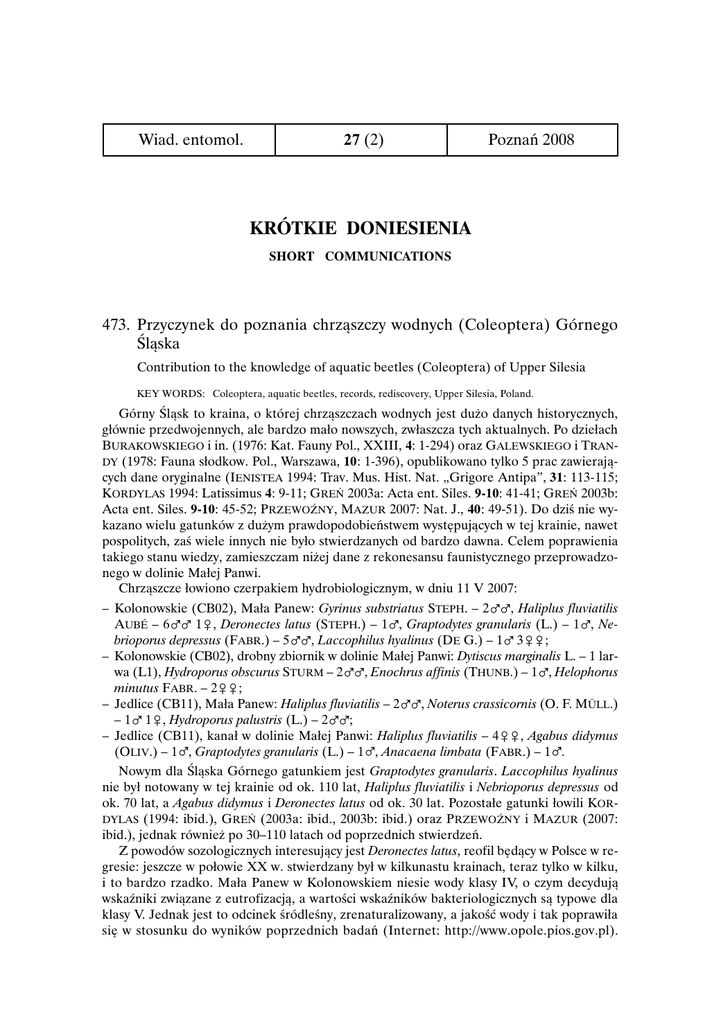 Wiad. entomol. 27 (2) Poznań 2008 KRÓTKIE DONIESIENIA SHORT COMMUNICATIONS 473. Przyczynek do poznania chrząszczy wodnych (Coleoptera) Górnego Śląska Contribution to the knowledge of aquatic beetles (Coleoptera) of Upper Silesia KEY WORDS: Coleoptera, aquatic beetles, records, rediscovery, Upper Silesia, Poland. Górny Śląsk to kraina, o której chrząszczach wodnych jest dużo danych historycznych, głównie przedwojennych, ale bardzo mało nowszych, zwłaszcza tych aktualnych. Po dziełach BURAKOWSKIEGO i in. (1976: Kat. Fauny Pol., XXIII, 4: 1-294) oraz GALEWSKIEGO i TRANDY (1978: Fauna słodkow. Pol., Warszawa, 10: 1-396), opublikowano tylko 5 prac zawierających dane oryginalne (IENISTEA 1994: Trav. Mus. Hist. Nat. „Grigore Antipa”, 31: 113-115; KORDYLAS 1994: Latissimus 4: 9-11; GREŃ 2003a: Acta ent. Siles. 9-10: 41-41; GREŃ 2003b: Acta ent. Siles. 9-10: 45-52; PRZEWOŹNY, MAZUR 2007: Nat. J., 40: 49-51). Do dziś nie wykazano wielu gatunków z dużym prawdopodobieństwem występujących w tej krainie, nawet pospolitych, zaś wiele innych nie było stwierdzanych od bardzo dawna. Celem poprawienia takiego stanu wiedzy, zamieszczam niżej dane z rekonesansu faunistycznego przeprowadzonego w dolinie Małej Panwi. Chrząszcze łowiono czerpakiem hydrobiologicznym, w dniu 11 V 2007: – Kolonowskie (CB02), Mała Panew: Gyrinus substriatus STEPH. – 2%%, Haliplus fluviatilis AUBÉ – 6%% 1&, Deronectes latus (STEPH.) – 1%, Graptodytes granularis (L.) – 1%, Nebrioporus depressus (FABR.) – 5%%, Laccophilus hyalinus (DE G.) – 1% 3&&; – Kolonowskie (CB02), drobny zbiornik w dolinie Małej Panwi: Dytiscus marginalis L. – 1 larwa (L1), Hydroporus obscurus STURM – 2%%, Enochrus affinis (THUNB.) – 1%, Helophorus minutus FABR. – 2&&; – Jedlice (CB11), Mała Panew: Haliplus fluviatilis – 2%%, Noterus crassicornis (O. F. MÜLL.) – 1% 1&, Hydroporus palustris (L.) – 2%%; – Jedlice (CB11), kanał w dolinie Małej Panwi: Haliplus fluviatilis – 4&&, Agabus didymus (OLIV.) – 1%, Graptodytes granularis (L.) – 1%, Anacaena limbata (FABR.) – 1%. Nowym dla Śląska Górnego gatunkiem jest Graptodytes granularis. Laccophilus hyalinus nie był notowany w tej krainie od ok. 110 lat, Haliplus fluviatilis i Nebrioporus depressus od ok. 70 lat, a Agabus didymus i Deronectes latus od ok. 30 lat. Pozostałe gatunki łowili KORDYLAS (1994: ibid.), GREŃ (2003a: ibid., 2003b: ibid.) oraz PRZEWOŹNY i MAZUR (2007: ibid.), jednak również po 30–110 latach od poprzednich stwierdzeń. Z powodów sozologicznych interesujący jest Deronectes latus, reofil będący w Polsce w regresie: jeszcze w połowie XX w. stwierdzany był w kilkunastu krainach, teraz tylko w kilku, i to bardzo rzadko. Mała Panew w Kolonowskiem niesie wody klasy IV, o czym decydują wskaźniki związane z eutrofizacją, a wartości wskaźników bakteriologicznych są typowe dla klasy V. Jednak jest to odcinek śródleśny, zrenaturalizowany, a jakość wody i tak poprawiła się w stosunku do wyników poprzednich badań (Internet: http://www.opole.pios.gov.pl). 114 KRÓTKIE DONIESIENIA Trudno orzec, czy mamy tu do czynienia z reliktową populacją, która przetrwała okres silnego zanieczyszczenia rzeki, czy też z rekolonizacją rzeki. Bowiem z jednej strony stan rzeki poprawił się niedawno, z drugiej – z sąsiednich, lepiej zbadanych krain brak aktualnych danych o D. latus. Paweł BUCZYŃSKI, Zakł. Zool. UMCS, Lublin 474. Nowe stanowiska Emus hirtus (LINNAEUS, 1758) i Ocypus ophthalmicus (SCOPOLI 1763) (Coleoptera: Staphylinidae: Staphylininae) w Polsce New localities of Emus hirtus (LINNAEUS, 1758) and Ocypus ophthalmicus (SCOPOLI 1763) (Coleoptera: Staphylinidae: Staphylininae) in Poland KEY WORDS: Coleoptera, Staphylinidae, Emus hirtus, Ocypus ophthalmicus, new records, WielkopolskaKujawy Lowland, Poland. Emus hirtus (LINNAEUS, 1758) – Łask - Ostrów (UTM: CC71), 26 IV 2003 – 1 ex., w stercie kompostowanych odchodów z gołębnika, leg. A. KRUPICKI; 7 VII 2007 – 2 exx., kopulująca para pod krowimi odchodami, leg. A. KRUPICKI. Gatunek rozprzestrzeniony głównie w południowej, środkowej i zachodniej Europie. Wykazywany także z Wysp Brytyjskich, Danii i Szwecji. Gatunek występujący lokalnie i pojedynczo, tylko w niektórych latach liczniej spotykany. Wykazany z wielu krain, lecz większość danych pochodzi głównie z XIX lub początku XX wieku (BURAKOWSKI i in. 1980: Kat. Fauny Pol., XXIII, 7: 1-172). Po 1980 roku wykazany tylko z Pojezierza Pomorskiego (GUTOWSKI, RUTA 2004: Nowy Pam. fizjogr., 3, 1-2: 27-60), Puszczy Białowieskiej (BOROWIEC i in. 1992: Wiad. entomol., 11, 3: 133-141), Podlasia (KUBISZ, SZWAŁKO 1991: Wiad. entomol., 10, 1: 5-14) oraz z Sudetów Zachodnich (MAZUR 1993: Wiad. entomol., 12, 4: 243-250). Zasiedla zarówno tereny otwarte jak i lesiste, prowadząc drapieżny tryb życia; odżywia się larwami owadów występującymi w rozkładających się szczątkach roślinnych, ekskrementach lub w padlinie (BURAKOWSKI i in. 1980: ibid.). Ocypus ophthalmicus (SCOPOLI 1763) – Łask - Ostrów (CC71), 5 IX 2005 – 1 ex., pod kępą wrzosu, w pobliżu zabudowań działkowych, leg. A. KRUPICKI. Gatunek rozmieszczony od północnej Afryki przez prawie całą Europę aż po Wyspy Brytyjskie, wykazywany również z Kaukazu i Armenii. W Polsce szeroko rozmieszczony, jednakże rzadko notowany a z wielu krain nie wykazywany od ponad pół wieku (BURAKOWSKI i in. 1980: ibid.). Najnowsze dane o występowaniu tego gatunku pochodzą z Pojezierza Pomorskiego (SMOLEŃSKI 1995: Wiad. entomol., 14, 2: 123) i Wyżyny Lubelskiej (STANIEC 1996: Wiad. entomol., 15, 1: 23-29). Zasiedla lasy mieszane, wrzosowiska, trawiaste stoki i kserotermiczne zbocza. Spotykany pod butwiejącymi szczątkami roślinnymi, kamieniami i wśród mchów (BURAKOWSKI i in. 1980: ibid.). Okazy dowodowe znajdują się w kolekcji Andrzeja KRUPICKIEGO. Autorzy dziękują Panu Andrzejowi MELKE za cenne uwagi 