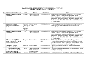1 KALENDARZ IMPREZ SPORTOWYCH I REKREACYJNYCH GMINY KRAPKOWICE – ROK 2012 Lp. Impreza sportowa, rekreacyjna 1 Krapkowicka Liga Siatkówki Amatorskiej Termin Styczeń Miejsce Sala gimnastyczna ZSS-1 Krapkowice Organizator UMiG Krapkowice Opis Krapkowicka Amatorska Liga Siatkówki w której udział 8 drużyn - 5 drużyn z Krapkowic(PV DTP, KRC Team, Mastoidea, Sanmar) oraz Kamienia Śląskiego, Zimnic, Strzelec Opolskich i Tarnowa Opolskiego. Mecze będą odbywać się w każdy czwartek od 18.00 do 22.00 w Zespole Szkół Sportowych w Krapkowicach. 15 stycznia Lipowe Łaźnie 21 stycznia (Czechy) 22 stycznia 28 stycznia 4 luty luty Sala gimnastyczna ZSS-1 Krapkowice UMiG Krapkowice Wyjazdy organizowane dla mieszkańców Gminy Krapkowice do partnerskiej Gminy w Republice Czeskiej - ośrodek narciarski Miroslav UMiG Krapkowice Krapkowicka Amatorska Liga Siatkówki w której udział 8 drużyn - 5 drużyn z Krapkowic(PV DTP, KRC Team, Mastoidea, Sanmar) oraz Kamienia Śląskiego, Zimnic, Strzelec Opolskich i Tarnowa Opolskiego. Mecze będą odbywać się w każdy czwartek od 18.00 do 22.00 w Zespole Szkół Sportowych w Krapkowicach W Turnieju udział biorą drużyny trampkarzy, juniorów i seniorów Ludowych Zespołów Sportowych mających swoje siedziby na terenie Gminy Krapkowice. Turniej odbywa się pod honorowym patronatem Burmistrza Krapkowic Zawody adresowane są do drużyn klubowych trampkarzy i juniorów. Turniej piłki siatkowej amatorów w którym biorą udział zespoły z całej Opolszczyzny. 2 Jednodniowe wyjazdy na narty dla mieszkańców Krapkowic 3 Krapkowicka Liga Siatkówki Amatorskiej 4 XI Halowy Turniej Piłki Nożnej Drużyn LZS o Puchar Burmistrza Krapkowic 28 styczeń Hala sportowa UMiG Krapkowice LZS 5 XIX Halowy Turniej Trampkarzy i Juniorów XV Turniej Piłki Siatkowej im. A. Roszkowiaka o Puchar Burmistrza Krapkowic Halowy Turniej Piłki Nożnej 29 styczeń Hala sportowa UMiG Krapkowice 6 7 marzec marzec Sala gimnastyczna UMiG Krapkowice PSP-1 Krapkowice, PG 2 Krapkowice Hala sportowa UMiG Krapkowice Turniej przeznaczony dla amatorów piłki nożnej w kategorii 2 8 9 Old Boys Krapkowicka Liga Siatkówki Amatorskiej XXX Jubileuszowy Krapkowicki Bieg Uliczny - Krapkowickie Biegi Dzieci i Młodzieży - Nordic Walking 10 Ogólnopolskie zawody w Wędkarstwie Rzutowym Dzieci i Młodzieży „Pierwszy krok” 11 Krapkowickie mistrzostwa w siatkówce plażowej szkół gimnazjalnych dziewcząt i chłopców 12 Turniej Wędkarski dla Dzieci z okazji Dnia Dziecka 13 Turniej ORLIK dla drużyn szkół podstawowych marzec Sala gimnastyczna ZSS-1 Krapkowice UMiG Krapkowice 1 maja Start i meta – ul. Kilińskiego UMiG Krapkowice 9-10 czerwiec Hala Sportowa im. W. Piechoty, Stadion Miejski w Otmęcie Stadion miejski PZW KrapkowiceOtmęt UMiG Krapkowice czerwiec czerwiec Akwen wodny czerwiec Kompleks boisk ORLIK UMiG Krapkowice SZS Koło PZW Krapkowice UMiG Krapkowice UMiG Krapkowice „ OLD BOYS” Krapkowicka Amatorska Liga Siatkówki w której udział 8 drużyn - 5 drużyn z Krapkowic(PV DTP, KRC Team, Mastoidea, Sanmar) oraz Kamienia Śląskiego, Zimnic, Strzelec Opolskich i Tarnowa Opolskiego. Mecze będą odbywać się w każdy czwartek od 18.00 do 22.00 w Zespole Szkół Sportowych w Krapkowicach Biegowa impreza cykliczna organizowana już po raz 30, w której co roku bierze udział w sumie ponad 1000 osób z powiatu, województwa kraju i zagranicy. Bieg główny na dystansie 10 km – zawodnicy, którzy ukończyli 16-sty rok życia; Biegi Dzieci i Młodzieży – zgodnie z kategoriami wiekowymi: przedszkolaki, uczniowie szkół podstawowych i gimnazjów Nordic Walking – osoby pełnoletnie Zawody adresowane są do dzieci i młodzieży z terenu całej polski, które nie posiadają licencji zawodniczej. Zawody rozegrane zostaną w 4 kategoriach: kadetów do lat 14, juniorek do lat 18, juniorów do lat 18. Zawody obywają się na stadionie miejskim. W zawodach mogą wziąć udział drużyny dziewcząt chłopców szkół gimnazjalnych. Zawody wędkarskie dla dzieci i młodzieży organizowane w 2 kategoriach: dzieci do 12 lat oraz dzieci powyżej 12 lat. Celem organizacji TURNIEJU ORLIKA O PUCHAR PREMIERA DONALDA TUSKA jest promowanie wśród dzieci sportowej aktywności i zasad rywalizacji fair play, aktywizacja lokalnych społeczności oraz zachęta do organizowania różnych działań sportowych na obiektach wybudowanych w ramach programu „Moje boisko - ORLIK 3 14 Turniej ORLIK dla drużyn szkół gimnazjalnych czerwiec Kompleks boisk ORLIK UMiG Krapkowice 15 Zawody pływackie o Puchar Burmistrza Krapkowic dla uczniów szkół podstawowych i gimnazjalnych Turniej z Okazji Dnia Dziecka- pod hasłem „ Razem Bezpiecznej 16 Olimpiada Przedszkolaków czerwiec Kryta pływalnia DELFIN OSiR Krapkowice UMiG Krapkowice czerwiec Sala sportowa ZSP- Klub Karate-do 1 Krapkowice Enso czerwiec do uzgodnienia 17 Ogólnopolski Zlot Garbusów czerwiec Stadion Miejski 18 Turniej Siatkówki Plażowej o Puchar Burmistrza Krapkowic 19 Lotna Premia II Etapu Tour de Pologne czerwiec /lipiec Stadion miejski UMiG Krapkowice 11 lipiec Ulice miasta KRAPKOWICE Lang Team UMiG Krapkowice lipiec Boisko LZS Dąbrówka Górna LZS Dąbrówka Górna 20 Festyn Sportowy oraz Turniej Piłki Nożnej o Puchar Burmistrza Przedszkola UMiG Krapkowice Stowarzyszenie OSiR Krapkowice 2012” . Celem organizacji TURNIEJU ORLIKA O PUCHAR PREMIERA DONALDA TUSKA jest promowanie wśród młodzieży sportowej aktywności i zasad rywalizacji fair play, aktywizacja lokalnych społeczności oraz zachęta do organizowania różnych działań sportowych na obiektach wybudowanych w ramach programu „Moje boisko - ORLIK 2012” . Zawody pływackie organizowane dla amatorów pływania ze szkół podstawowych oraz gimnazjum. Impreza cykliczna służąca podniesieniu świadomości i umiejętności oraz popularyzacji sportu i wszelkich aktywnego wypoczynku wśród dzieci i młodzieży. Zawody maja na celu popularyzację aktywności fi