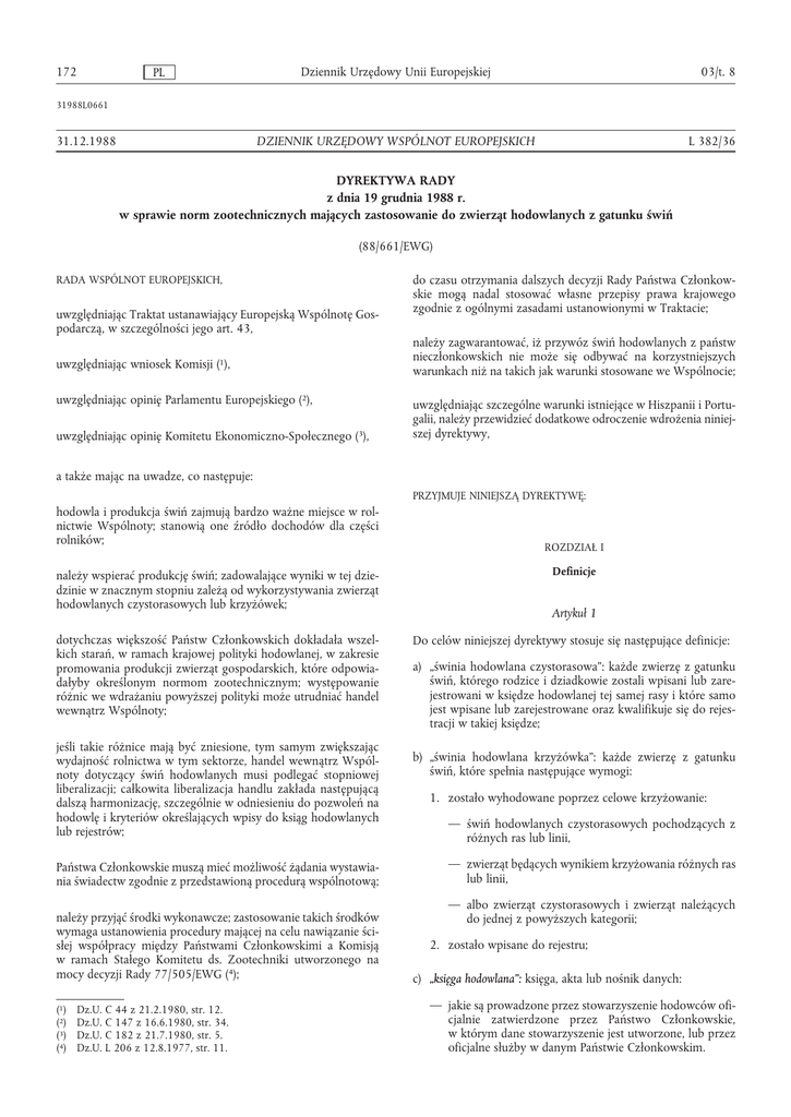 172 Dziennik Urzędowy Unii Europejskiej PL 03/t. 8 31988L0661 31.12.1988 DZIENNIK URZĘDOWY WSPÓLNOT EUROPEJSKICH L 382/36 DYREKTYWA RADY z dnia 19 grudnia 1988 r. w sprawie norm zootechnicznych mających zastosowanie do zwierząt hodowlanych z gatunku świń (88/661/EWG) RADA WSPÓLNOT EUROPEJSKICH, uwzględniając Traktat ustanawiający Europejską Wspólnotę Gospodarczą, w szczególności jego art. 43, uwzględniając wniosek Komisji ( ), 1 uwzględniając opinię Parlamentu Europejskiego (2), uwzględniając opinię Komitetu Ekonomiczno-Społecznego (3), do czasu otrzymania dalszych decyzji Rady Państwa Członkowskie mogą nadal stosować własne przepisy prawa krajowego zgodnie z ogólnymi zasadami ustanowionymi w Traktacie; należy zagwarantować, iż przywóz świń hodowlanych z państw nieczłonkowskich nie może się odbywać na korzystniejszych warunkach niż na takich jak warunki stosowane we Wspólnocie; uwzględniając szczególne warunki istniejące w Hiszpanii i Portugalii, należy przewidzieć dodatkowe odroczenie wdrożenia niniejszej dyrektywy, a także mając na uwadze, co następuje: PRZYJMUJE NINIEJSZĄ DYREKTYWĘ: hodowla i produkcja świń zajmują bardzo ważne miejsce w rolnictwie Wspólnoty; stanowią one źródło dochodów dla części rolników; należy wspierać produkcję świń; zadowalające wyniki w tej dziedzinie w znacznym stopniu zależą od wykorzystywania zwierząt hodowlanych czystorasowych lub krzyżówek; dotychczas większość Państw Członkowskich dokładała wszelkich starań, w ramach krajowej polityki hodowlanej, w zakresie promowania produkcji zwierząt gospodarskich, które odpowiadałyby określonym normom zootechnicznym; występowanie różnic we wdrażaniu powyższej polityki może utrudniać handel wewnątrz Wspólnoty; jeśli takie różnice mają być zniesione, tym samym zwiększając wydajność rolnictwa w tym sektorze, handel wewnątrz Wspólnoty dotyczący świń hodowlanych musi podlegać stopniowej liberalizacji; całkowita liberalizacja handlu zakłada następującą dalszą harmonizację, szczególnie w odniesieniu do pozwoleń na hodowlę i kryteriów określających wpisy do ksiąg hodowlanych lub rejestrów; Państwa Członkowskie muszą mieć możliwość żądania wystawiania świadectw zgodnie z przedstawioną procedurą wspólnotową; należy przyjąć środki wykonawcze; zastosowanie takich środków wymaga ustanowienia procedury mającej na celu nawiązanie ścisłej współpracy między Państwami Członkowskimi a Komisją w ramach Stałego Komitetu ds. Zootechniki utworzonego na mocy decyzji Rady 77/505/EWG (4); (1) (2) (3) (4) Dz.U. C 44 z 21.2.1980, str. 12. Dz.U. C 147 z 16.6.1980, str. 34. Dz.U. C 182 z 21.7.1980, str. 5. Dz.U. L 206 z 12.8.1977, str. 11. ROZDZIAŁ I Definicje Artykuł 1 Do celów niniejszej dyrektywy stosuje się następujące definicje: a) „świnia hodowlana czystorasowa”: każde zwierzę z gatunku świń, którego rodzice i dziadkowie zostali wpisani lub zarejestrowani w księdze hodowlanej tej samej rasy i które samo jest wpisane lub zarejestrowane oraz kwalifikuje się do rejestracji w takiej księdze; b) „świnia hodowlana krzyżówka”: każde zwierzę z gatunku świń, które spełnia następujące wymogi: 1. zostało wyhodowane poprzez celowe krzyżowanie: — świń hodowlanych czystorasowych pochodzących z różnych ras lub linii, — zwierząt będących wynikiem krzyżowania różnych ras lub linii, — albo zwierząt czystorasowych i zwierząt należących do jednej z powyższych kategorii; 2. zostało wpisane do rejestru; c) „księga hodowlana”: księga, akta lub nośnik danych: — jakie są prowadzone przez stowarzyszenie hodowców oficjalnie zatwierdzone przez Państwo Członkowskie, w którym dane stowarzyszenie jest utworzone, lub przez oficjalne służby w danym Państwie Członkowskim. 03/t. 8 Dziennik Urzędowy Unii Europejskiej PL Jednakże Państwa Członkowskie mają także prawo określić, aby księgi prowadzone były przez organizację hodowców oficjalnie zatwierdzoną przez Państwo Członkowskie, w którym taka organizacja jest utworzona, — w którym świnie hodowlane czystorasowe poszczególnych ras zostały wpisane lub zarejestrowane z podaniem ich przodków; d) „rejestr”: księga, akta lub nośnik danych: — jakie są prowadzone albo przez stowarzyszenie hodowców, organizację hodowców lub prywatne przedsiębiorstwo oficjalnie zatwierdzone przez Państwo Członkowskie, w którym takie stowarzyszenie, organizacja lub przedsiębiorstwo są utworzone, lub przez oficjalne służby w danym Państwie Członkowskim, — w którym świnie hodowlane krzyżówki zostały wpisane z podaniem ich przodków. 173 2. Jednakże Państwa Członkowskie mogą wymagać lub dopuszczać, aby niektóre świnie hodowlane czystorasowe wysłane z innego Państwa Członkowskiego, charakteryzujące się cechami wyróżniającymi je z populacji świń tej samej rasy w Państwie Członkowskim przeznaczenia, zostały wpisane w oddzielnej części księgi hodowlanej prowadzonej dla rasy, do której należą. Artykuł 5 Państwa Członkowskie mogą wymagać, aby w czasie wprowadzania do obrotu, do świń hodowlanych czystorasowych, a także do nasienia, komórek jajowych i zarodków tych zwierząt, były załączane świadectwa sporządzone zgodnie z art. 6. Artykuł 6 1. Zgodnie z procedurą przewidzianą w art. 11 określa się: — metody monitorowania produktywności oraz oceny wartości genetycznej świń hodowlanych czystorasowych, ROZDZIAŁ II Zasady regulujące handel wewnątrzwspólnotowy dotyczący świń hodowlanych czystorasowych Artykuł 2 1. Państwa Członkowskie nie mogą zakazać, ograniczyć lub utrudniać z powodów zootechnicznych: — handlu wewnątrzwspólnotowego świniami hodowlanymi czystorasowymi lub ich nasieniem, komórkami jajowymi i zarodkami, — zakładania ksiąg hodowlanych, o ile spełniają one wymogi określone w art. 6, — o