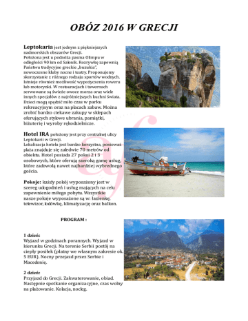 OBÓZ 2016 W GRECJI Leptokaria jest jednym z piękniejszych nadmorskich obszarów Grecji. Położona jest u podnóża pasma Olimpu w odległości 90 km od Salonik. Rozrywkę zapewnią Państwu tradycyjne greckie „buzukia”, nowoczesne kluby nocne i teatry. Proponujemy skorzystanie z różnego rodzaju sportów wodnych. Istnieje również możliwość wypożyczenia roweru lub motorynki. W restauracjach i tawernach serwowane są świeże owoce morza oraz wiele innych specjałów z najróżniejszych kuchni świata. Dzieci mogą spędzić miło czas w parku rekreacyjnym oraz na placach zabaw. Można zrobić bardzo ciekawe zakupy w sklepach oferujących stylowe ubrania, pamiątki, biżuterię i wyroby rękodzielnicze. Hotel IRA położony jest przy centralnej ulicy Leptokarii w Grecji. Lokalizacja hotelu jest bardzo korzystna, ponieważ plaża znajduje się zaledwie 70 metrów od obiektu. Hotel posiada 27 pokoi 2 i 3 osobowych, które oferują szeroką gamę usług, które zadowolą nawet najbardziej wybrednego gościa. Pokoje: każdy pokój wyposażony jest w szereg udogodnień i usług mających na celu zapewnienie miłego pobytu. Wszystkie nasze pokoje wyposażone są w: łazienkę, telewizor, lodówkę, klimatyzację oraz balkon. PROGRAM : 1 dzień: Wyjazd w godzinach porannych. Wyjazd w kierunku Grecji. Na terenie Serbii postój na ciepły posiłek (płatny we własnym zakresie ok. 5 EUR). Nocny przejazd przez Serbie i Macedonię. 2 dzień: Przyjazd do Grecji. Zakwaterowanie, obiad. Następnie spotkanie organizacyjne, czas wolny na plażowanie. Kolacja, nocleg. 3 – 10 dzień: Program pobytu - plażowanie, kąpiele w morzu i basenie, realizacja programu zajęć (gry, zabawy, wycieczki, konkursy, wycieczki po okolicy) możliwość skorzystania z wycieczek fakultatywnych. 11 dzień: Wykwaterowanie po śniadaniu, złożenie bagaży w wyznaczonym miejscu. Czas wolny na ostatnie zakupy, pamiątkowe zdjęcia itp. Obiad. Popołudniu zbiórka przed hotelem i pobranie suchego prowiantu. Wyjazd w drogę powrotną do kraju. 12 dzień: Przyjazd do Polski w godzinach wieczornych. Termin: 1-12.07.2016r. Cena: 1650 zł/os. Cena zawiera: transport komfortowym autokarem (wc,video,klimatyzacja, barek) 9 noclegów w hotelu (zakwaterowanie w pokojach wg opisu) wyżywienie 3 razy dziennie (śniadanie, lunch i obiadokolacja)- posiłki w hotelu obok suchy prowiant na drogę powrotną ubezpieczenie KL, NNW i BP opiekę wykwalifikowanej kadry pedagogicznej upominek i dyplom dla każdego uczestnika gry i konkursy z nagrodami bogaty program kolonijny opiekę rezydenta/przedstawiciela biura taksę klimatyczną Cena nie zawiera: opłaty za korzystanie z klimatyzacji wycieczek fakultatywnych świadczeń nie wymienionych w ofercie Wycieczki Fakultatywne Meteory ok. 30€, Saloniki ok. 25€, Olimp ok. 25€, Ateny ok. 40€ _________________________________________________________________________ Alliance Française Katowice Ul. Staromiejska 12/3 40-013 Katowice tel. +48 518 868 344 email: [email protected]