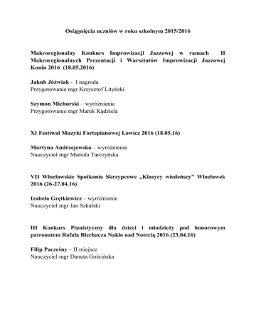 Osiągnięcia uczniów w roku szkolnym 2015/2016 Makroregionalny Konkurs Improwizacji Jazzowej w ramach II Makroregionalnych Prezentacji i Warsztatów Improwizacji Jazzowej Konin 2016 (18.05.2016) Jakub Jóźwiak - I nagroda Przygotowanie mgr Krzysztof Lityński Szymon Michurski – wyróżnienie Przygotowanie mgr Marek Kądziela XI Festiwal Muzyki Fortepianowej Łowicz 2016 (18.05.16) Martyna Andrzejewska – wyróżnienie Nauczyciel mgr Mariola Tarczyńska VII Włocławskie Spotkania Skrzypcowe „Klasycy wiedeńscy” Włocławek 2016 (26-27.04.16) Izabela Grętkiewicz – wyróżnienie Nauczyciel mgr Jan Szkalski III Konkurs Pianistyczny dla dzieci i młodzieży pod honorowym patronatem Rafała Blechacza Nakło nad Notecią 2016 (23.04.16) Filip Pacześny – II miejsce Nauczyciel mgr Danuta Gościńska XI Włocławskie Spotkania Klas Fortepianu im. Tadeusza Chmielewskiego Włocławek 2016 (8.04.16) Filip Pacześny – II miejsce Nauczyciel mgr Danuta Gościńska III Ogólnopolski Konkurs Instrumentów Dętych Blaszanych Opole 2016 (46.04.16) Krzysztof Błażejewski – wyróżnienie Nauczyciel mgr Zbigniew Kołodziejczak XVIII Międzynarodowy Konkurs Gitarowy im. Czesława Droździewicza Krynica-Zdrój 2016 (13-20.02.16) Michał Koszykowski – III miejsce Nauczyciel mgr Andrzej Majewski XI Ogólnopolski Konkurs Pianistyczny – Muzyka w wykonaniu najmłodszych „OD BAROKU PO WSPÓŁCZESNOŚĆ” Gdańsk 2016 (15.01.16) Filip Pacześny – II miejsce Nauczyciel mgr Danuta Gościńska Ogólnopolski Konkurs z Literatury Muzycznej „Najpiękniejsza Jest Muzyka Polska” Radom 2015 (5.12.15) Joanna Czarny – II miejsce Nauczyciel mgr Katarzyna Broj XXI Słupeckie Spotkania Muzyczne pod patronatem Starosty Powiatu Słupeckiego, Burmistrza Miasta Słupcy i Wizytatora Centrum Edukacji Artystycznej Słupca 2015 (27-28.11.15) Kwartet gitarowy: Michał Koszykowski, Julia Soszyńska, Sebastian Kańczurzewski, Magdalena Strzelczyk – wyróżnienie Nauczyciel mgr Andrzej Majewski Ibrahim Słowiński – wyróżnienie Nauczyciel mgr Przemysław Stadnik Wielkopolski Konkurs wiedzy o życiu i twórczości Henryka Mikołaja Góreckiego Konin 2015 (16.11.15) Joanna Czarny – II miejsce Przygotowanie mgr Marcin Zieliński Zuzanna Łuczak – I miejsce Przygotowanie mgr Maria Figaj Agata Rosicka – II miejsce Przygotowanie mgr Maria Figaj