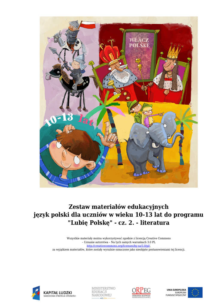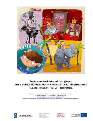 Zestaw materiałów edukacyjnych język polski dla uczniów w wieku 10-13 lat do programu "Lubię Polskę" - cz. 2. - literatura Wszystkie materiały można wykorzystywać zgodnie z licencją Creative Commons – Uznanie autorstwa – Na tych samych warunkach 3.0 PL http://creativecommons.org/licenses/by-sa/3.0/pl/, za wyjątkiem materiałów, które zostały wyraźnie oznaczone jako nieobjęte postanowieniami tej licencji. http://www.wlaczpolske.pl język polski dla uczniów w wieku 10-13 lat do programu "Lubię Polskę" - cz. 2. literatura Jak się usypia małego smoka? Kołysanka smoków Joanna Papuzińska Kołysała Mama Smoczka Od wieczora do północka: – Śpij mój synku, Zamknij oczka. Pierwsza główka śpi głęboko, Z drugiej zerka lewe oko, Trzecia płacze, że chce soku. Napoiła Mama smoczka, Otarła mu mokre oczka, – Śpij, mój skarbie, dobranocka. Śpij, kochane moje złotko, Opowiem ci bajkę słodką. Pierwsza główka śpi w poduchach, Trzecia główka – bajki słucha, Druga krzyczy: – Mamo, mucha! Odpędziła mama muchę, Pochyliła się nad zuchem: – Śpij, aniołku, bo już świta... Ładny wierszyk ci przeczytam. Drzemie druga, chrapie trzecia. Myśli mama: zasnął dzieciak... Aż tu pierwsza woła: – Ale wyspałem się doskonale! Polecenia: Zadanie 1. Ile głów miał mały smok z wiersza? Co robiły poszczególne głowy smoka? Znajdź odpowiednie cytaty. Jakimi słowami mama próbowała uśpić swojego synka? Znajdź odpowiednie . Włącz Polskę! Strona 1 http://www.wlaczpolske.pl język polski dla uczniów w wieku 10-13 lat do programu "Lubię Polskę" - cz. 2. literatura Strona 2 Zadanie 2. Przeczytaj przykładową rozmowę, jaką prowadziły ze sobą głowy smoczka. – Mamusiu, wcale mi się nie chce spać – powiedziała pierwsza głowa. – Ale mi się chce! – krzyknęła druga głowa. – Cicho bądźcie! – wrzasnęła trzecia. – Ale mnie się naprawdę nie chce spać – marudziła pierwsza. – To nie śpij, ale nie przeszkadzaj innym – warknęła trzecia. – Chrrr…. – zachrapała druga. Zadanie 3. Oto trzygłowy smok opalający się na plaży. Napisz, co mogłaby powiedzieć każda z jego głów. Zadanie 4. Znajdź w tekście wiersza wszystkie dialogi. Odczytaj je głośno. Zadanie 5. Zapisz rozmowę smoków z plaży w formie dialogu. W tym celu przyjrzyj się dialogowi z Zadania 2. i dialogom z wiersza. ………………………………………………………………………………………………………………… ………………………………………………………………………………………………………………… ………………………………………………………………………………………………………………… ………………………………………………………………………………………………………………… Zadanie 6. Wyjaśnij, na czym polega humor pojawiający się w wierszu. Zadanie 7. Obejrzyj poniższe ilustracje i wyjaśnij, co to jest wyraz wieloznaczny. Włącz Polskę! http://www.wlaczpolske.pl język polski dla uczniów w wieku 10-13 lat do programu "Lubię Polskę" - cz. 2. literatura Strona 3 Czy widziałeś takiego szpaka, co nie wychodzi z domu bez fraka? Ach te szpaki dziwaki! Józefa Drozdowska Na telefonicznym drucie Siedzi szpak w jednym ………………… (but). A w ogródku na sztachecie Drugi szpak w …………………… (beret). Trzeci szpak w ………………………… (chusteczka) w kratkę Spaceruje po rabatce . Czwarty nosi ………………………… (okulary) I ……………………. (tornister) jakiś szary. A ten piąty najdziwniejszy w ……………………………………. (spodnie pumpy) i ……………………. (kalosze). A już szósty najśmieszniejszy w ………………………… (kapelusz) i ………………………….. (bambosze). Włącz Polskę! http://www.wlaczpolske.pl język polski dla uczniów w wieku 10-13 lat do programu "Lubię Polskę" - cz. 2. literatura Strona 4 Siódmy szpak ostrzyżony jest na jeża ósmy przebrał się dziś za żołnierza. A dziewiąty wraz z dziesiątym W ………………………….. (płaszcze) dawno już niemodnych. Polecenia: Zadanie 1. Wstaw do wiersza rzeczowniki w odpowiedniej formie tak, aby wszystkie wyrazy do siebie pasowały. Odpowiedz, co łączy te słowa? Następnie przeczytaj głośno wiersz. Zadanie 2. Wypisz z wiersza wszystkie liczebniki. Zwróć uwagę na poprawny zapis. Zapamiętaj! Liczebnik to wyraz nazywający liczbę (np. trzy, siedem, setny, dwudziesty) ………………………………………………………………………………………………………… ………………………………………………………………………………………………………… ………………………………………………………………………………………………………… Zadanie 3. Napisz według wzoru. 1 - pierwszy – jeden 2 - ………………………… - dwa 3 - trzeci - ……………………………. 6 - …………………. – sześć 7 - …………………. - ………………………… 8 - ………………… - …………………………. 20 - …………………………………. - …………………………………… 94 - …………………………………………… - ……………………………………… 115 - ………………………………………….. - ……………………………………… 200 - ……………………………………… - ………………………………………….. Włącz Polskę! http://www.wlaczpolske.pl język polski dla uczniów w wieku 10-13 lat do programu "Lubię Polskę" - cz. 2. literatura Strona 5 300 - ……………………………………… - ………………………………………… Zadanie 4. Opowiedz, jak były ubrane