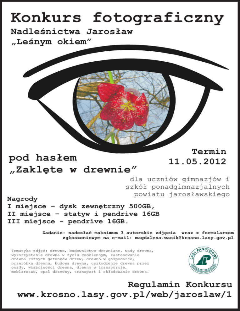 Konkurs fotograficzny Nadleœnictwa Jaros³aw „Leœnym okiem” pod has³em „Zaklête w drewnie” Termin 11.05.2012 dla uczniów gimnazjów i szkó³ ponadgimnazjalnych powiatu jaros³awskiego Nagrody I miejsce – dysk zewnêtrzny 500GB, II miejsce – statyw i pendrive 16GB III miejsce - pendrive 16GB. Zadanie: nades³aæ maksimum 3 autorskie zdjêcia wraz z formularzem zg³oszeniowym na e-mail: [email protected] Tematyka zdjêæ: drewno, budownictwo drewniane, wady drewna, wykorzystanie drewna w ¿yciu codziennym, zastosowanie drewna ró¿nych gatunków drzew, drewno w gospodarce, przeróbka drewna, budowa drewna, uszkodzenie drewna przez owady, w³aœciwoœci drewna, drewno w transporcie, meblarstwo, opa³ drzewny, transport i sk³adowanie drewna. Regulamin Konkursu www.krosno.lasy.gov.pl/web/jaroslaw/1