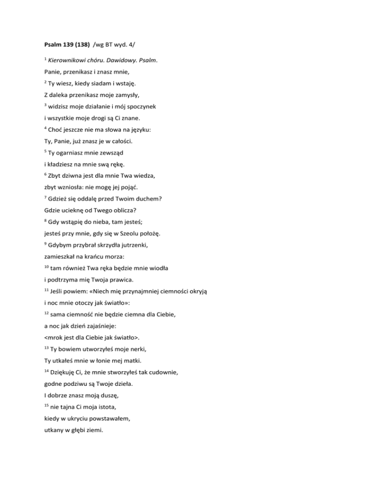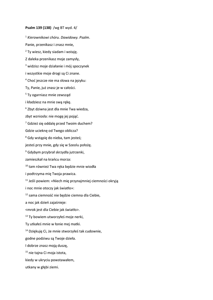 Psalm 139 (138) /wg BT wyd. 4/ 1 Kierownikowi chóru. Dawidowy. Psalm. Panie, przenikasz i znasz mnie, 2 Ty wiesz, kiedy siadam i wstaję. Z daleka przenikasz moje zamysły, 3 widzisz moje działanie i mój spoczynek i wszystkie moje drogi są Ci znane. 4 Choć jeszcze nie ma słowa na języku: Ty, Panie, już znasz je w całości. 5 Ty ogarniasz mnie zewsząd i kładziesz na mnie swą rękę. 6 Zbyt dziwna jest dla mnie Twa wiedza, zbyt wzniosła: nie mogę jej pojąć. 7 Gdzież się oddalę przed Twoim duchem? Gdzie ucieknę od Twego oblicza? 8 Gdy wstąpię do nieba, tam jesteś; jesteś przy mnie, gdy się w Szeolu położę. 9 Gdybym przybrał skrzydła jutrzenki, zamieszkał na krańcu morza: 10 tam również Twa ręka będzie mnie wiodła i podtrzyma mię Twoja prawica. 11 Jeśli powiem: «Niech mię przynajmniej ciemności okryją i noc mnie otoczy jak światło»: 12 sama ciemność nie będzie ciemna dla Ciebie, a noc jak dzień zajaśnieje: <mrok jest dla Ciebie jak światło>. 13 Ty bowiem utworzyłeś moje nerki, Ty utkałeś mnie w łonie mej matki. 14 Dziękuję Ci, że mnie stworzyłeś tak cudownie, godne podziwu są Twoje dzieła. I dobrze znasz moją duszę, 15 nie tajna Ci moja istota, kiedy w ukryciu powstawałem, utkany w głębi ziemi. 16 Oczy Twoje widziały me czyny i wszystkie są spisane w Twej księdze; dni określone zostały, chociaż żaden z nich jeszcze nie nastał. 17 Jak nieocenione są dla mnie myśli Twe, Boże, jak jest ogromna ich ilość! 18 Gdybym je przeliczył, więcej ich niż piasku; gdybym doszedł do końca, jeszcze jestem z Tobą. 19 O Boże, obyś zgładził bezbożnego, niech krwawi mężowie idą precz ode mnie! 20 Oni przeciw Tobie zmawiają się podstępnie, za nic mają Twoje myśli. 21 Panie, czyż nie mam nienawidzić tych, co nienawidzą Ciebie, oraz nie brzydzić się tymi, co przeciw Tobie powstają? 22 Nienawidzę ich pełnią nienawiści; stali się moimi wrogami. 23 Zbadaj mnie, Boże, i poznaj me serce; doświadcz i poznaj moje troski, 24 i zobacz, czy jestem na drodze nieprawej, a skieruj mnie na drogę odwieczną! Panie, przenikasz i znasz mnie. Zanim Psalmista skieruje swoją prośbą do Boga (ww.19nn), rozważa i wysławia Jego wszechwiedzę, wzorem starotestamentalnego mędrca czy proroka Jeremiasza (por. Hi 31,4; Jr 12,3; 17,10). Jego słowa i nam dzisiaj pomagają rozmawiać z Najwyższym, który dogłębnie zna każdego z nas, zarówno nasze czyny i słowa, jak też zamysły naszych serc. Ale Jego wiedza o nas napawa pokojem, bo wiemy, że jest On naszym dobrym Ojcem. Ty ogarniasz mnie zewsząd. Oprócz wszechwiedzy, Psalmista wyraża także podziw dla wszechobecności i wszechmocy Boga. Ta bliskość Pana w życiu Jego ludu niekiedy oznacza także, że staje się on celem prześladowania ze strony nieprzyjaciół Boga. I chyba dlatego w sercu Psalmisty, który też tego doświadcza, zrodziła się myśl o „ucieczce” (ww.7nn). Stwierdza, że nie ma takiego zakątka we wszechświecie, od nieba po Szeol, od wschodu do zachodu słońca, gdzie mógłby się przed Bogiem schować. Także żadne ciemności go nie ukryją przed Bogiem, którego „wzrok” przenika wszystko. Dziękuję Ci, że mnie stworzyłeś tak cudownie. Psalmista dziękuje Bogu Stwórcy za dar swego życia. Wyraża podziw dla tego szczególnego i wielkiego dzieła, jakim jest poczęcie dziecka w łonie matki. Bogu znany jest nie tylko początek ludzkiego życia, jego narodziny, lecz również wszystkie następne dni, cała przyszłość, jakby już zapisana w księdze. Ponownie zatem pochwała Boga obejmuje Jego szczególną wszechwiedzę, przekraczającą granice czasu i przestrzeni. Człowiek może tylko cząstkę tej wiedzy Boga poznać, czerpiąc ze skarbca Bożej mądrości. O Boże, obyś zgładził bezbożnego. Wierszy 19-22 nie znajdziemy w liturgicznej modlitwie Kościoła, ponieważ zawierają prośbę o zagładę bezbożnych i „mowę nienawiści” wobec nienawidzących Boga. Psalmista życzy im śmierci, wyrażając swoją jedność z Bogiem. Stawia Bogu pytanie, według niego retoryczne, czy miałby ich nie nienawidzić? Pan Jezus odpowie na to pytanie nauczając swych uczniów: „Miłujcie waszych nieprzyjaciół i módlcie się za tych, którzy was prześladują” (Mt 5,44). Psalmista z pokorą uznaje jednak, że także i on może odstąpić od wierności Bogu, dlatego prosi Go, by czuwał nad nim i prowadził swą drogą. Boże Ojcze, dziękujemy Tobie za to, że z troską pochylasz się nad życiem każdego człowieka, którego powołałeś do istnienia i przyjaźni z Tobą, i prosimy, abyś prowadził nas ku wiecznemu życiu z Tobą. Przez Chrystusa Pana naszego. Amen. o. Michał Baranowski OFMConv