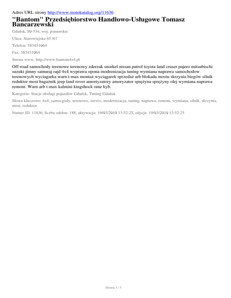 Adres URL strony http://www.motokatalog.org/11636 "Bantom" Przedsiębiorstwo Handlowo-Usługowe Tomasz Bancarzewski Gdańsk, 80-534, woj. pomorskie Ulica: Starowiejska 65 /67 Telefon: 583431064 Fax: 583431064 Strona www: http://www.bantom4x4.pl Off-road samochody terenowe terenowy zderzak snorkel nissan patrol toyota land cruser pajero mitsubischi suzuki jimny samuraj rajd 4x4 wyprawa opona modrenizacja tuning wymiana naprawa samochodow terenowych wyciagarka warn t-max montaż wyciągarek sprzedaż arb blokada mostu skrzynia biegów silnik reduktor most bagażnik jeep land rover amortyzatory amoryzator sprężyna sprężyny olej wymiana naprawa remont. Warn arb t-max kalmini kingshock ome kyb. Kategorie: Stacje obsługi pojazdów Gdańsk, Tuning Gdańsk Słowa kluczowe: 4x4, samocgody, terenowe, serwis, modernizacja, tuning, naprawa, remont, wymiana, silnik, skrzynia, most, reduktor Numer ID: 11636, liczba odsłon: 188, aktywacja: 19/03/2010 13:52:25, edycja: 19/03/2010 13:52:25 Strona 1 / 1