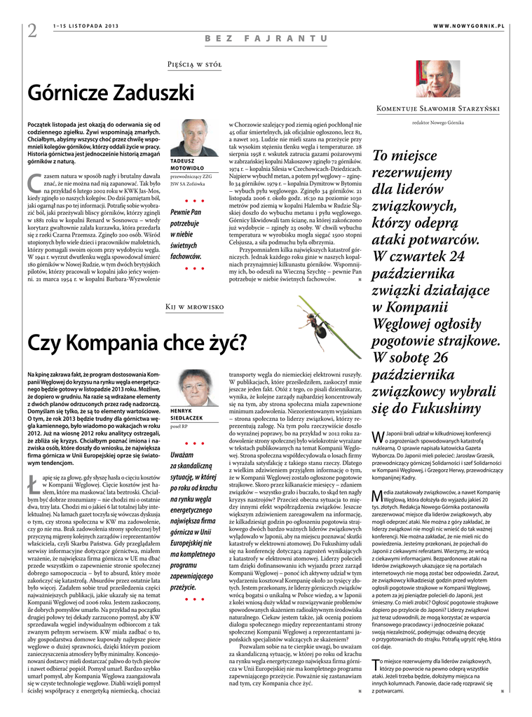 2 W W W.NOW YGORNIK.PL 1–15 L I S T O PA D A 2 013 B E Z F A J R A N T U Pięścią w stół Górnicze Zaduszki Początek listopada jest okazją do oderwania się od codziennego zgiełku. Żywi wspominają zmarłych. Chciałbym, abyśmy wszyscy choć przez chwilę wspomnieli kolegów górników, którzy oddali życie w pracy. Historia górnictwa jest jednocześnie historią zmagań górników z naturą. C zasem natura w sposób nagły i brutalny dawała znać, że nie można nad nią zapanować. Tak było na przykład 6 lutego 2002 roku w KWK Jas-Mos, kiedy zginęło 10 naszych kolegów. Do dziś pamiętam ból, jaki ogarnął nas po tej informacji. Potrafię sobie wyobrazić ból, jaki przeżywali bliscy górników, którzy zginęli w 1881 roku w kopalni Renard w Sosnowcu – wtedy korytarz gwałtownie zalała kurzawka, która przedarła się z rzeki Czarna Przemsza. Zginęło 200 osób. Wśród utopionych było wiele dzieci i pracowników małoletnich, którzy pomagali swoim ojcom przy wydobyciu węgla. W 1941 r. wyrzut dwutlenku węgla spowodował śmierć 180 górników w Nowej Rudzie, w tym dwóch brytyjskich pilotów, którzy pracowali w kopalni jako jeńcy wojenni. 21 marca 1954 r. w kopalni Barbara-Wyzwolenie TADEUSZ MOTOWIDŁO przewodniczący ZZG JSW SA Zofiówka Pewnie Pan potrzebuje w niebie świetnych fachowców. Komentuje Sławomir Starzyński w Chorzowie szalejący pod ziemią ogień pochłonął nie 45 ofiar śmiertelnych, jak oficjalnie ogłoszono, lecz 81, a nawet 103. Ludzie nie mieli szans na przeżycie przy tak wysokim stężeniu tlenku węgla i temperaturze. 28 sierpnia 1958 r. wskutek zatrucia gazami pożarowymi w zabrzańskiej kopalni Makoszowy zginęło 72 górników. 1974 r. – kopalnia Silesia w Czechowicach-Dziedzicach. Najpierw wybuchł metan, a potem pył węglowy – zginęło 34 górników. 1979 r. – kopalnia Dymitrow w Bytomiu – wybuch pyłu węglowego. Zginęło 34 górników. 21 listopada 2006 r. około godz. 16:30 na poziomie 1030 metrów pod ziemią w kopalni Halemba w Rudzie Śląskiej doszło do wybuchu metanu i pyłu węglowego. Górnicy likwidowali tam ścianę, na której zakończono już wydobycie – zginęły 23 osoby. W chwili wybuchu temperatura w wyrobisku mogła sięgać 1500 stopni Celsjusza, a siła podmuchu była olbrzymia. Przypomniałem kilka największych katastrof górniczych. Jednak każdego roku ginie w naszych kopalniach przynajmniej kilkunastu górników. Wspomnijmy ich, bo odeszli na Wieczną Szychtę – pewnie Pan potrzebuje w niebie świetnych fachowców. l Kij w mrowisko Czy Kompania chce żyć? Na kpinę zakrawa fakt, że program dostosowania Kompanii Węglowej do kryzysu na rynku węgla energetycznego będzie gotowy w listopadzie 2013 roku. Możliwe, że dopiero w grudniu. Na razie są wdrażane elementy z dwóch planów odrzuconych przez radę nadzorczą. Domyślam się tylko, że są to elementy wartościowe. O tym, że rok 2013 będzie trudny dla górnictwa węgla kamiennego, było wiadomo po wakacjach w roku 2012. Już na wiosnę 2012 roku analitycy ostrzegali, że zbliża się kryzys. Chciałbym poznać imiona i nazwiska osób, które doszły do wniosku, że największa firma górnicza w Unii Europejskiej oprze się światowym tendencjom. Ł apię się za głowę, gdy słyszę hasła o cięciu kosztów w Kompanii Węglowej. Cięcie kosztów jest hasłem, które ma maskować lata beztroski. Chciałbym być dobrze zrozumiany – nie chodzi mi o ostatnie dwa, trzy lata. Chodzi mi o jakieś 6 lat totalnej laby intelektualnej. Na łamach gazet toczyła się wówczas dyskusja o tym, czy strona społeczna w KW ma zadowolenie, czy go nie ma. Brak zadowolenia strony społecznej był przyczyną migreny kolejnych zarządów i reprezentantów właściciela, czyli Skarbu Państwa. Gdy przeglądałem serwisy informacyjne dotyczące górnictwa, miałem wrażenie, że największa firma górnicza w UE ma dbać przede wszystkim o zapewnienie stronie społecznej dobrego samopoczucia – był to absurd, który może zakończyć się katastrofą. Absurdów przez ostatnie lata było więcej. Zadałem sobie trud prześledzenia części najważniejszych publikacji, jakie ukazały się na temat Kompanii Węglowej od 2006 roku. Jestem zaskoczony, ile dobrych pomysłów umarło. Na przykład na początku drugiej połowy tej dekady zarzucono pomysł, aby KW sprzedawała węgiel indywidualnym odbiorcom z tak zwanym pełnym serwisem. KW miała zadbać o to, aby gospodarstwa domowe kupowały najlepsze piece węglowe o dużej sprawności, dzięki którym poziom zanieczyszczenia atmosfery byłby minimalny. Koncesjonowani dostawcy mieli dostarczać paliwo do tych pieców i nawet odbierać popiół. Pomysł umarł. Bardzo szybko umarł pomysł, aby Kompania Węglowa zaangażowała się w czyste technologie węglowe. Diabli wzięli pomysł ścisłej współpracy z energetyką niemiecką, chociaż HENRYK SIEDLACZEK poseł RP Uważam za skandaliczną sytuację, w której po roku od krachu na rynku węgla energetycznego największa firma górnicza w Unii Europejskiej nie ma kompletnego programu zapewniającego przeżycie. transporty węgla do niemieckiej elektrowni ruszyły. W publikacjach, które prześledziłem, zaskoczył mnie jeszcze jeden fakt. Otóż z tego, co pisali dziennikarze, wynika, że kolejne zarządy najbardziej koncentrowały się na tym, aby strona społeczna miała zapewnione minimum zadowolenia. Niezorientowanym wyjaśniam – strona społeczna to liderzy związkowi, którzy reprezentują załogę. Na tym polu rzeczywiście doszło do wyraźnej poprawy, bo na przykład w 2012 roku zadowolenie strony społecznej było wielokrotnie wyrażane w tekstach publikowanych na temat Kompanii Węglowej. Strona społeczna współdecydowała o losach firmy i wyrażała satysfakcję z takiego stanu rzeczy. Dlatego z wielkim zdziwieniem przyjąłem informację o tym, że w Kompanii Węglowej zostało ogłoszone pogotowie strajkowe. Skoro przez 