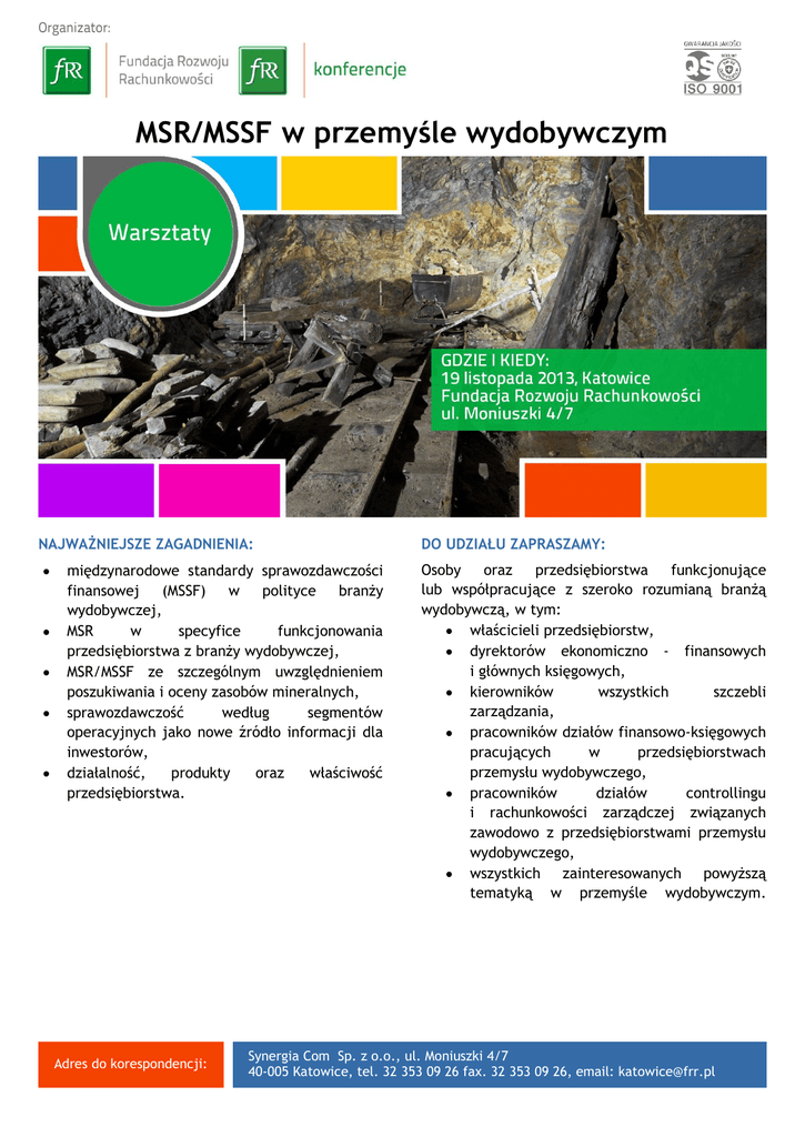 MSR/MSSF w przemyśle wydobywczym NAJWAŻNIEJSZE ZAGADNIENIA: międzynarodowe standardy sprawozdawczości finansowej (MSSF) w polityce branży wydobywczej, MSR w specyfice funkcjonowania przedsiębiorstwa z branży wydobywczej, MSR/MSSF ze szczególnym uwzględnieniem poszukiwania i oceny zasobów mineralnych, sprawozdawczość według segmentów operacyjnych jako nowe źródło informacji dla inwestorów, działalność, produkty oraz właściwość przedsiębiorstwa. Adres do korespondencji: DO UDZIAŁU ZAPRASZAMY: Osoby oraz przedsiębiorstwa funkcjonujące lub współpracujące z szeroko rozumianą branżą wydobywczą, w tym: właścicieli przedsiębiorstw, dyrektorów ekonomiczno - finansowych i głównych księgowych, kierowników wszystkich szczebli zarządzania, pracowników działów finansowo-księgowych pracujących w przedsiębiorstwach przemysłu wydobywczego, pracowników działów controllingu i rachunkowości zarządczej związanych zawodowo z przedsiębiorstwami przemysłu wydobywczego, wszystkich zainteresowanych powyższą tematyką w przemyśle wydobywczym. Synergia Com Sp. z o.o., ul. Moniuszki 4/7 40-005 Katowice, tel. 32 353 09 26 fax. 32 353 09 26, email: [email protected] Katowice, 19.11.2013 r. Szanowni Państwo, Synergia Com Sp. z o. o., spółka z grupy firm Fundacji Rozwoju Rachunkowości w Polsce, organizuje warsztaty pt.: „MSR/MSSF w przemyśle wydobywczym”. Warsztaty odbędą się w dniu 19 listopada 2013 r. w Katowicach w siedzibie Fundacji Rozwoju Rachunkowości przy ul. Moniuszki 4/7. Celem warsztatów jest zaprezentowanie istotnych zagadnień związanych z Międzynarodowymi Standardami Sprawozdawczości Finansowej w ich praktycznym ujęciu ze szczególnym naciskiem na branżę wydobywczą. W trakcie warsztatów będą mieli Państwo możliwość: usystematyzowania wiedzy na temat Międzynarodowych Standardów Sprawozdawczości Finansowej diagnozowania i przedstawiania finansowego obrazu przedsiębiorstwa, wyliczania progów rentowności, podejmowania decyzji inwestycyjnych, radzenia sobie z problemami wąskich gardeł dostępności zasobów wymiany doświadczeń zawodowych oraz kierowania pytań do Eksperta Udział w warsztacie zapewni Państwu uzyskanie praktycznych umiejętności wykorzystywania instrumentów Międzynarodowych Standardów Sprawozdawczości Finansowej. Serdecznie zapraszam do uczestnictwa w warsztatach wierząc, iż informacje przekazane przez Eksperta i możliwość wymiany doświadczeń przyczynią się do efektywnego wykorzystania zdobytej wiedzy w praktyce. Z poważaniem, Olga Karwaczyńska Dyrektor Oddziału [email protected] Adres do korespondencji: Synergia Com Sp. z o.o., ul. Moniuszki 4/7 40-005 Katowice, tel. 32 353 09 26 fax. 32 353 09 26, email: [email protected] Program Katowice, 19.11.2013 r. I Dzień, wtorek 19 listopada 8.30-9.00 Rejestracja, powitalna kawa 9.00-11.30 Międzynarodowe standardy sprawozdawczości finansowej (MSSF) w odniesieniu do branży wydobywczej MSR 1 – Prezentacja sprawozdań finansowych MSR 8 – Zasady (polityka) rachunkowości MSR 38 – Wartości niematerialne MSR 16 – Rzeczowe aktywa trwałe MSSF 6 – Poszukiwanie i ocena zasobów mineralnych MSSF 8 – Segmenty operacyjne 11.30-11.45 Przerwa kawowa 11.45-12.30 Międzynarodowe standardy sprawozdawczości finansowej (MSSF) w odniesieniu do branży wydobywczej - rozwiązywanie case’ów praktycznych 13.00-14.00 Lunch 14.00-15.45 Produkty i działalność branży wydobywczej w świetle MSSF Definicja Wycena początkowa Wycena po początkowym ujęciu Utrata wartości Rozwiązywanie case’ów praktycznych obejmujących powyższe zagadnienia 15.45 Zakończenie warsztatów – rozdanie certyfikatów Adres do korespondencji: Synergia Com Sp. z o.o., ul. Moniuszki 4/7 40-005 Katowice, tel. 32 353 09 26 fax. 32 353 09 26, email: [email protected] Prelegent Katowice, 19.11.2013 r. Mariusz Rutke: Absolwent chorzowskiego Wydziału Wyższej Szkoły Bankowej w Poznaniu. Ukończył studia magisterskie na kierunku Finanse i Rachunkowość oraz studia podyplomowe z zakresu Podatków. Ekspert, praktyk z zakresu rachunkowości, controllingu, analizy finansowej oraz wykorzystania MS Excel i MS Access w biznesie. Prowadzi zajęcia dydaktyczne na uczelni wyższej oraz kursy i szkolenia dla instytucji szkoleniowych. Doświadczenie zawodowe zdobywał w centrali jednego z największych działających w Polsce banków oraz pracując jako analityk finansowy w firmie produkcyjnej z branży automotive. Ponadto jest właścicielem firmy informatycznej specjalizującej się w tworzeniu narzędzi biznesowych opartych na MS Excel oraz MS Access. Adres do korespondencji: Synergia Com Sp. z o.o., ul. Moniuszki 4/7 40-005 Katowice, tel. 32 353 09 26 fax. 32 353 09 26, email: [email protected] SYNERGIA COM Sp. z o.o. ul. Robotnicza 4-6/5 62-800 Kalisz KRS 0000343621, NIP Miasto I Wilda W Poznaniu, IX Wydział Gospodarczy KRS Adres do korespondencji: Synergia Com Sp. z o.o., ul. Moniuszki 4/7 40-005 Katowice, tel. 32 353 09 26 fax. 32 353 09 26, email: [email protected] - Nowe
