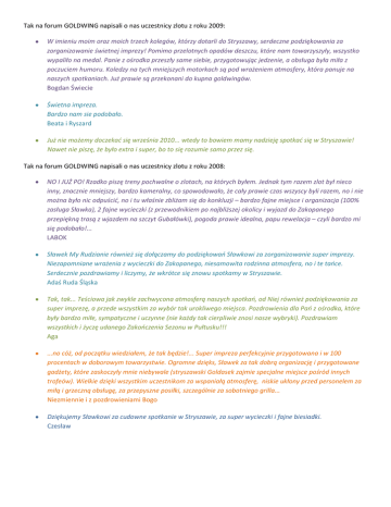 Tak na forum GOLDWING napisali o nas uczestnicy zlotu z roku 2009: W imieniu moim oraz moich trzech kolegów, którzy dotarli do Stryszawy, serdeczne podziękowania za zorganizowanie świetnej imprezy! Pomimo przelotnych opadów deszczu, które nam towarzyszyły, wszystko wypaliło na medal. Panie z ośrodka przeszły same siebie, przygotowując jedzenie, a obsługa była miła z poczuciem humoru. Koledzy na tych mniejszych motorkach są pod wrażeniem atmosfery, która panuje na naszych spotkaniach. Już prawie są przekonani do kupna goldwingów. Bogdan Świecie Świetna impreza. Bardzo nam sie podobało. Beata i Ryszard Już nie możemy doczekad się września 2010... wtedy to bowiem mamy nadzieję spotkad się w Stryszawie! Nawet nie piszę, że było extra i super, bo to się rozumie samo przez się. Tak na forum GOLDWING napisali o nas uczestnicy zlotu z roku 2008: NO I JUŻ PO! Rzadko piszę treny pochwalne o zlotach, na których byłem. Jednak tym razem zlot był nieco inny, znacznie mniejszy, bardzo kameralny, co spowodowało, że cały prawie czas wszyscy byli razem, no i nie można było nic odpuścid, no i tu właśnie zbliżam się do konkluzji – bardzo fajne miejsce i organizacja (100% zasługa Sławka), 2 fajne wycieczki (z przewodnikiem po najbliższej okolicy i wyjazd do Zakopanego przepiękną trasą z wjazdem na szczyt Gubałówki), pogoda prawie idealna, papu rewelacja – czyli bardzo mi się podobało!... LABOK Sławek My Rudzianie również się dołączamy do podziękowao Sławkowi za zorganizowanie super imprezy. Niezapomniane wrażenia z wycieczki do Zakopanego, niesamowita rodzinna atmosfera, no i te taoce. Serdecznie pozdrawiamy i liczymy, że wkrótce się znowu spotkamy w Stryszawie. Adaś Ruda Śląska Tak, tak... Teściowa jak zwykle zachwycona atmosferą naszych spotkao, od Niej również podziękowania za super imprezę, a przede wszystkim za wybór tak urokliwego miejsca. Pozdrowienia dla Pao z ośrodka, które były bardzo miłe, sympatyczne i uczynne (nie każdy tak cierpliwie znosi nasze wybryki). Pozdrawiam wszystkich i życzę udanego Zakooczenia Sezonu w Pułtusku!!! Aga ...no cóż, od początku wiedziałem, że tak będzie!... Super impreza perfekcyjnie przygotowana i w 100 procentach w doborowym towarzystwie. Ogromne dzięks, Sławek za tak dobrą organizację i przygotowane gadżety, które zaskoczyły mnie niebywale (stryszawski Goldasek zajmie specjalne miejsce pośród innych trofeów). Wielkie dzięki wszystkim uczestnikom za wspaniałą atmosferę, niskie ukłony przed personelem za miłą i grzeczną obsługę, za przepyszne posiłki, szczególnie za sobotniego grilla... Niezmiennie i z pozdrowieniami Bogo Dziękujemy Sławkowi za cudowne spotkanie w Stryszawie, za super wycieczki i fajne biesiadki. Czesław