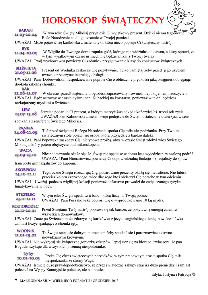 HOROSKOP ŚWIĄTECZNY W tym roku Święty Mikołaj przyniesie Ci wyjątkowy prezent. Dzięki niemu tegoroczne Boże Narodzenie na długo zostanie w Twojej pamięci. UWAŻAJ! Może pojawić się kartkówka z matematyki, która nieco popsuje Ci świąteczny nastrój. W Wigilię do Twojego domu zapuka gość, którego nie widziałaś od dawna, a który sprawi, że w tym wyjątkowym czasie uśmiech nie będzie znikał z Twojej twarzy. UWAŻAJ! Twój wychowawca powierzy Ci zadanie - przygotowanie klasy do konkursów świątecznych. Prezent od Wodnika zaskoczy Cię pozytywnie. Tylko pamiętaj żeby przed jego użyciem uważnie przeczytać instrukcję obsługi. UWAŻAJ! Pani Dobrowolska niespodziewanie poprosi Cię o obliczenie prędkości jaką osiągniesz obiegając dookoła szkolną choinkę. W okresie przedświątecznym będziesz zapracowany, również niepokojeniem nauczycieli. UWAŻAJ! Bądź ostrożny w czasie dyżuru pani Kubackiej na korytarzu, ponieważ w te dni będziesz rozkojarzony myślami o Świętach. Strzelec podaruje Ci prezent, o którym marzyłeś/aś odkąd ukończyłeś/aś trzeci rok życia. UWAŻAJ! Pan Kalinowski zmieni Twoje podejście do Świąt i ostatecznie uwierzysz w sens spotkania z reniferem Świętego Mikołaja. Tuż przed świętami Bożego Narodzenia spotka Cię miła niespodzianka. Przy Twoim świątecznym stole pojawi się osoba, która przyjedzie z bardzo daleka. UWAŻAJ! Pani Popowska zaskoczy Cię nietypową prośbą, abyś w czasie Świąt zdobył włos Świętego Mikołaja, który potem obejrzycie pod mikroskopem. Niespodziewanie okaże się, że Świąt nie spędzisz w domu lecz wyjedziesz w szaloną podróż. UWAŻAJ! Pani Nienartowicz powierzy Ci odpowiedzialną funkcję – specjalisty do spraw transportu gimnazjalistów do Laponii. Tegoroczne Święta rozczarują Cię, podarowane prezenty okażą się nietrafione. Nie lubisz przecież koloru czerwonego, więc dlaczego ktoś obdarzył Cię porsche w tym odcieniu. UWAŻAJ! Uważaj podczas wigilijnej kolacji ponieważ obżarstwo prowadzi do zwiększonego ryzyka lunatykowania w nocy. W tym roku Święta spędzisz u babci, która liczy na Twoją pomoc. UWAŻAJ! Pani Puszakowska poprosi Cię o wyprodukowanie 10 kg mydła. Przed Świętami Twój nastrój poprawi się tak bardzo, że pozytywną energią zarazisz wszystkich domowników. UWAŻAJ! Zaraz po Świętach może zdarzyć się kartkówka z języka angielskiego, lepiej powtórz słówka zamiast liczyć spadające z choinki igły. Te Święta staną się dobrym momentem żeby spotkać się i porozmawiać z dawno niewidzianymi krewnymi. UWAŻAJ! Nie wykręcaj się świąteczną gorączką zakupów, lepiej ucz się na bieżąco, zwłaszcza, że pan Bogucki szykuje dla wszystkich pisemną niespodziankę. Czeka Cię okres świątecznych porządków, w tym pracowitym czasie spotka Cię miła niespodzianka ze strony Wagi. UWAŻAJ! Istnieje duże prawdopodobieństwo, że przez świąteczne zakupy stracisz dużo pieniędzy i zamiast polecieć na Wyspy Kanaryjskie polatasz, ale na miotle. Edyta, Justyna i Patrycja 7 MAŁE GIMNAZJUM WIELKIEGO FORMATU / GRUDZIEŃ 2013