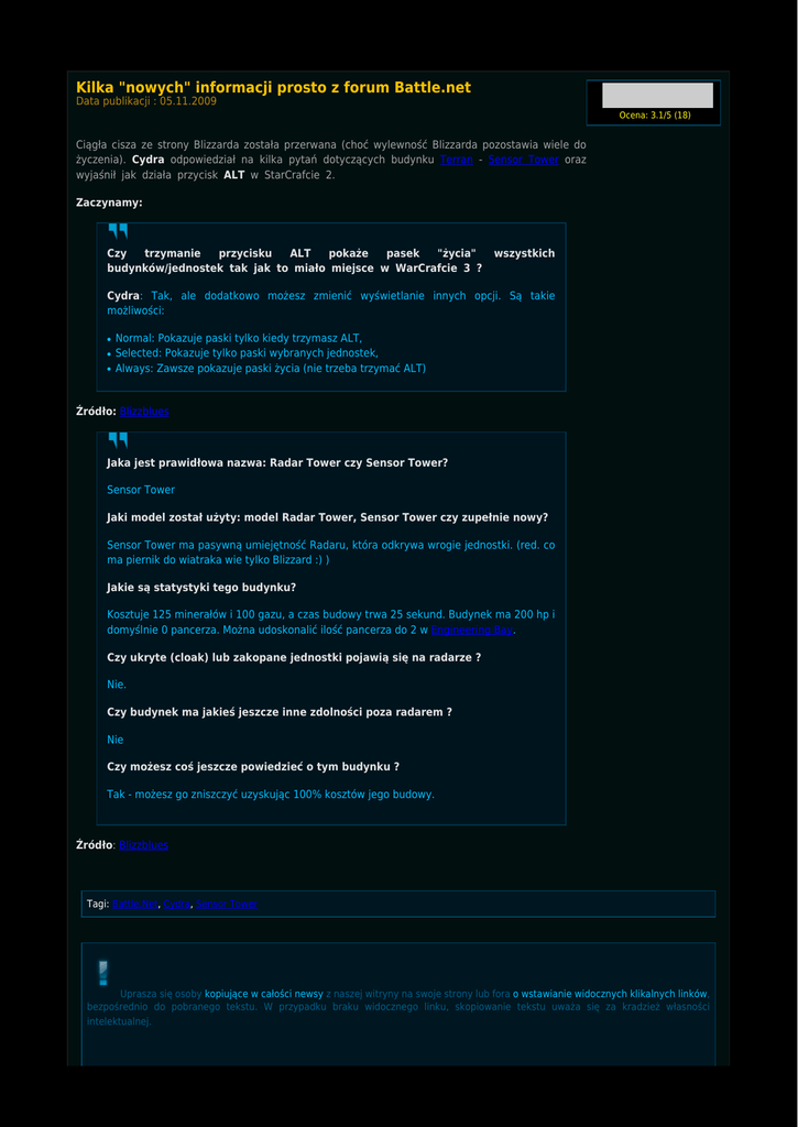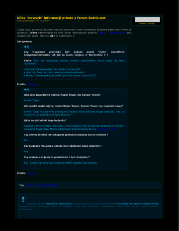Kilka "nowych" informacji prosto z forum Battle.net Data publikacji : 05.11.2009 Ocena: 3.1/5 (18) Ciągła cisza ze strony Blizzarda została przerwana (choć wylewność Blizzarda pozostawia wiele do życzenia). Cydra odpowiedział na kilka pytań dotyczących budynku Terran - Sensor Tower oraz wyjaśnił jak działa przycisk ALT w StarCrafcie 2. Zaczynamy: Czy trzymanie przycisku ALT pokaże pasek "życia" budynków/jednostek tak jak to miało miejsce w WarCrafcie 3 ? wszystkich Cydra: Tak, ale dodatkowo możesz zmienić wyświetlanie innych opcji. Są takie możliwości: ● ● ● Normal: Pokazuje paski tylko kiedy trzymasz ALT, Selected: Pokazuje tylko paski wybranych jednostek, Always: Zawsze pokazuje paski życia (nie trzeba trzymać ALT) Źródło: Blizzblues Jaka jest prawidłowa nazwa: Radar Tower czy Sensor Tower? Sensor Tower Jaki model został użyty: model Radar Tower, Sensor Tower czy zupełnie nowy? Sensor Tower ma pasywną umiejętność Radaru, która odkrywa wrogie jednostki. (red. co ma piernik do wiatraka wie tylko Blizzard :) ) Jakie są statystyki tego budynku? Kosztuje 125 minerałów i 100 gazu, a czas budowy trwa 25 sekund. Budynek ma 200 hp i domyślnie 0 pancerza. Można udoskonalić ilość pancerza do 2 w Engineering Bay. Czy ukryte (cloak) lub zakopane jednostki pojawią się na radarze ? Nie. Czy budynek ma jakieś jeszcze inne zdolności poza radarem ? Nie Czy możesz coś jeszcze powiedzieć o tym budynku ? Tak - możesz go zniszczyć uzyskując 100% kosztów jego budowy. Źródło: Blizzblues Tagi: Battle.Net, Cydra, Sensor Tower Uprasza się osoby kopiujące w całości newsy z naszej witryny na swoje strony lub fora o wstawianie widocznych klikalnych linków, bezpośrednio do pobranego tekstu. W przypadku braku widocznego linku, skopiowanie tekstu uważa się za kradzież własności intelektualnej. Dziękujemy: Administratorzy serwisu. Autor: Krzysztof Baranowski Data publikacji : 05.11.2009 Data modyfikacji : 05.11.2009 Liczba wyświetleń tekstu: 3384 Komentarz (28) dodaj komentarz Nie rozumiem po co ludzie zadają pytania o statystyki czegokolwiek albo jaka jest prawidłowa nazwa..., chyba oni nic w życiu do roboty nie mają, to jest nienormalne, bo te wiadomości i tak się zmieniają co chwile, więc jaki ma sens te wypytywanie.~ Dark_Angel 2009/11/05 10:13 Kto zadaje takie pytania to tylko świadczy o jego poziomie. Równie dobrze mogli by się spytać czy wyraz "craft" w nazwie ma coś wspólnego z serkami KRAFT ?!~rybatort 2009/11/05 11:10 nie to zebym byl upierdliwy ale pisze sie enginEEring bay ;) przez dwa "e" a nie "r" :P~maryjan 2009/11/05 12:01 Czy SCV może zbierać ziemniaki? -Nie A czy w takim razie ziemniaki występują w grze -Nie Tak? -Nie Batch w tym stylu :)~xrasnolud 2009/11/05 12:04 SCV na pewno umie przycinać żywopłot oraz sadzić kwiatki, na mapach z trawą w BR widać tą umiejętność doskonale...~ ElemenT 2009/11/05 12:32 co to za sens jak radar nie potrafi znalezc zakopanych i niewidzialnych jednostek? chyba po to jest radar zeby pokazywal to czego nie widac :/~Murarz 2009/11/05 12:57 @Murarz Radar dzięki swojemu zasięgowi może ostrzec gracza przed nadchodzącym natarciem wroga lub wykryć jego zgrupowania wojsk a więc jak najbardziej jest sens go używać... Co do samego braku zdolności do wykrywania ukrytych jednostek to podam taki przykład ... przy zasięgu radaru wystarczyły by powiedzmy 3 takie wierze i masz zabezpieczony cały "swój" teren... niema szans na np podejście ghostem bez bycia wykrytym i zrzucenia nuka lub podejścia grupką dark templarów... gra straciła by dużo na równowadze między rasami gdyby sensor tower miał możliwość detekcji niewidzialnych jednostek :)~ZEN4 2009/11/05 14:02 Zasięg true-sight może być inny niż normalny zasięg.~Atom 2009/11/05 14:11 To co u terran sluze teraz za detektor jesli nie wiezyczka? sorry za pytanie kogos co nie sledzi az tak kazdej zmiany w sc2~mgkiler 2009/11/05 15:02 test~ElemenT 2009/11/05 20:01 jak dla mnie to ten cały sensor tower to bezużyteczne badziewie, jest drogie i nie spełnia żadnych funkcji... w tej cenie stawiasz dwa towery i nie dosyć, że masz osłonę anti-air to wykrywa wszystkie jednostki cloak~ElemenT 2009/11/05 20:03 co te pytania dajął o sc2 bo dla mnie te pytania sąbez celowe~sc2kjedy 2009/11/05 20:05 Jeśli jednostki "wykrywane" przez ten SensoRadar <;g> będą pokazywane na minimapce (a przyznam się ze juz nawet w tak logicznych sprawach brak mi pewnosci jezeli chodzi o sc2... ) to sadzę, że będzie on jak najbardziej użyteczny i często używany np: jako wczesne ostrzeganie przed dropami nw...~Xeron 2009/11/05 21:09 on nie ma wcale dużego zasięgu :P postawisz turreta i też cie ostrzeże...~ElemenT 2009/11/05 21:12 Wszystko zależy od tego jaki ten sensor będzie mieć zasięg. Kierując się logiką można założyć, że musi skanować dość duży obszar by konkurować z turretami. Przecież ,,teoria balansu'' jaką Blizzard się kieruje wyklucza pojawienia się w grze jednostek nieprzydatnych i takowe jeśliby się pojawiły, byłyby usuwane lub modyfikowane.~Adu 2009/11/05 21:56 Zasięg ma większy przecież na jednym z filmików było to widać, zatem oczywiście, że będzie użyteczny do wykrywania szybciej dropów, szczególnie zergów które są bardzo groźne. @ElemenT Zmieniło coś się na stronie, bo zawsze jak wchodziłem byłem zalogowany a teraz muszę się logować:| A token jak widać działa znowu;)~Dark_Angel 2009/11/05 23:05 ehh brakuje tu edit do komentarzy. @mgkiler Sensor tower to inna wieżyczka, ta normalna która strzela do lotnictwa dalej jest detektorem, no i jeszcze jest Raven;) Chyba, że coś pokręciłem ale nie wydaje mi się.~Dark_Angel 2009/11/05 23:06 @ Xrasnolud: z tymi ziemniakami to było bezbłędne, po prostu zaje*iste! ;) Z drugiej strony to rzeczywiście Q&A nie dają nam ostatnio żadnych w zasadzie nowych i potrzebnych informacji.~IgnisSolus 2009/11/06 09:2