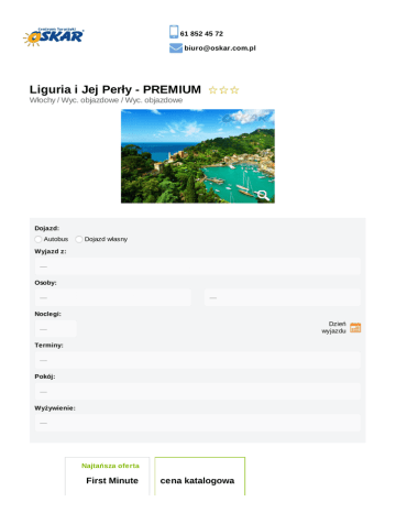 61 852 45 72 [email protected] Liguria i Jej Perły - PREMIUM Włochy / Wyc. objazdowe / Wyc. objazdowe Dojazd: Autobus Dojazd własny Wyjazd z: Osoby: Noclegi: Dzień wyjazdu Terminy: Pokój: Wyżywienie: Najtańsza oferta First Minute cena katalogowa do 6 marca 2017: 839,40 zł do 6 marca 2017: 839,40 zł do 13 września 2017: 1958,60 zł do 13 września 2017: 1958,60 zł Suma: 2798,00 Suma: zł 2798,00 zł Opis oferty Miejscowość Przejazd autokarem PREMIUM autokar-premium-oskar-tablet-gniazdko-usb-wygodne-fotele Opinie Realizacja imprezy autokarami PREMIUM to gwarancja: transportu autokarami z roczników 2015 i 2016 produkcji Irizar i VDL Rozkład jazdy indywidualnego, multimedialnego systemu rozrywki - tablet z dotykowym ekranem w każdym zagłówku (filmy, gry, muzyka itp.). Możliwość podłączenia własnego nośnika danych poprzez wejście AUX lub USB. najwyższej klasy skórzanych lub półskórzanych foteli z możliwością regulacji oparcia lub/i zagłówka największej w Polsce przestrzeni między siedzeniami małej półki przed każdym siedzeniem + siateczki na czasopisma, książki czy telefon bezpłatnego dostępu do sieci WiFi na terenie Polski* gniazdek elektrycznych 230V wydajnej klimatyzacji sterowanej indywidualnie bogato wyposażonego barku udostępnionego w czasie jazdy WC na pokładzie autokaru Idealna i komfortowa podróż… ZAWSZE! Na ternie Polski GWARANTUJEMY, że wszystkie przejazdy realizowane są autobusem, busem lub samochodem osobowym. Zapewnimy komfortowy transport na każdym etapie podróży. Ważne: Autokar Premium jest autokarem docelowym. *jakość usług internetowych może różnić się w zależności od jakości sygnału TOUR GUIDE oprowadzanie z indywidualnym systemem nagłośnieniowym Mobilny zestaw audio: indywidulany zestaw słuchawkowy połączony bezprzewodowo z mikrofonem pilota/przewodnika. Pakiet KOMFORT gwarancja wyboru miejsca w autokarze napoje w autokarze w cenie (6 x do wyboru: kawa, herbata, zimny napój 0,2l) cena: 50 zł/os Pakiet PRESTIGE gwarancja wyboru miejsca w autokarze napoje w autokarze w cenie (6 x do wyboru: kawa, herbata, zimny napój 0,2l) pierwszeństwo wejścia na pokład autokaru nadbagaż 5 kg w cenie napoje do obiadokolacji (0,2l) cena: 100 zł/os Zakwaterowanie Hotele *** położone na trasach pomiędzy zwiedzanymi miastami. Pokoje z łazienkami, urządzone w klasycznym stylu, z klimatyzacją lub/i dostępem do Internetu Wi-Fi. W hotelach znajdują się restauracje, dodatkowo niektóre z nich mogą posiadać basen. Przykładowe zakwaterowanie, które może różnić się w poszczególnych terminach: Montecatini Terme (2) - Hotel Santa Barbara, Diano Marina (2) - Hotel Villa Igea, Varazze (1) - Park Hotel Varazze, Mazzano (2) - Hotel Michelangelo Dostępne opcje zakwaterowania: pokój 2 - osobowy pokój 3 - osobowy dokwaterowanie (bez dopłat*) lub pokój 1 - osobowy (dopłata) Dostępne opcje wyżywienia wyżywienie BB: 7 śniadań wyżywienie HB: 7 śniadań + 7 obiadokolacji; możliwość dokonania rezerwacji w wersji HB lub obowiązkowa dopłata do obiadokolacji 50 €/os. (płatne u pilota w autokarze) śniadania serwowane: pieczywo, ser, szynka, dżem, napoje: kawa, herbata, sok obiadokolacje serwowane: zupa/przystawka, danie główne, sałatka/deser/owoc; napoje do obiadokolacji dodatkowo płatne Karta Dużej Rodziny www.oskar.com.pl/zalaczniki/karta_duzej_rodziny Turystyczny Fundusz Gwarancyjny W związku z powołaniem do życia w dniu 26.11.2016 Turystycznego Funduszu Gwarancyjnego każdy klient Biura Podróży Oskar zobowiązany jest do zapłaty kwoty w wysokości 10zł/os. przy każdorazowej rezerwacji imprezy turystycznej (obowiązuje od dnia 26.11.2016). Kwota przeznaczona na Turystyczny Fundusz Gwarancyjny zostanie automatycznie doliczona do wartości rezerwacji (w momencie jej dokonania). Wyjątkiem są imprezy turystyczne odbywające się w krajach posiadających granicę z Rzeczpospolitą Polską. Składka nie jest przychodem biura. Warunki promocji FIRST MINUTE www.oskar.com.pl/zalaczniki/warunki_promocji Udogodnienia Klimatyzacja Regulowane fotele Tacki Multimedia Nowoczesna flota Zawodowy kierowca Pasy bezpieczeństwa Toaleta w autokarze Wi-Fi Bez paszportu Restauracja hotelowa Tour guide Program ramowy DZIEŃ 1 (piątek) Wyjazd z Polski zgodnie z rozkładem jazdy autokarów. Przejazd przez Czechy, Austrię. (Trasa od granicy ok. 920 km) DZIEŃ 2 (sobota) W godzinach rannych przyjazd do Wenecji, przejazd kanałami weneckimi do historycznego centrum miasta, gdzie zobaczymy Plac św. Marka, Bazylikę św. Marka, Most Westchnień, zwiedzimy również Campanillę, czyli dzwonnicę. Spacer do dzielnicy Rialto, ze słynnym mostem o tej samej nazwie. Czas wolny. Przejazd do hotelu w okolicy Florencji - zakwaterowanie. Obiadokolacja. Nocleg. (Trasa ok. 270 km) DZIEŃ 3 (niedziela) Śniadanie. Następnie wyjazd do Florencji. Zwiedzanie stolicy Toskanii: kościół Santa Croce, Piazza del Duomo, baptysterium, katedra Santa Maria del Fiore, Wieża Giotta, Piazza della Signoria, Palazzo Vecchio, Ponte Vecchio. Przejazd do Lukki. Zwiedzanie: katedra di San Martino, kościół San Michele In Foro i bazylika San Frediano. Przejazd do hotelu - zakwaterowanie. Obiadokolacja. Nocleg. (Trasa ok. 220 km) DZIEŃ 4 (poniedziałek) Śniadanie. Następnie przejazd do Rapallo, spacer po kurorcie - z wielką przystanią i pięknym Starym Miastem. Przejazd do Genui - zwiedzanie: gotycka katedra San Lorenzo, dom Krzysztofa Kolumba, Piazza Ferrari z teatrem San Carlo i Palazzo Ducale, Via Garibaldi z eleganckimi pałacami. Później przejedziemy do Portofino – małego raju na ziemi, schowanego w zatoczce, wśród gór porośniętych drzewami oliwnymi i cyprysami. To miejsce przyciąga wszystkich swoim urokiem, jest bardzo lubiane przez celebrytów. Przejazd do hotelu - zakwaterowanie. Obiadokolacja. Nocleg. (Trasa ok. 70 km + przejazd do hotelu) DZIEŃ 5 (wtorek) Śniadanie. Dzień wolny - możliwość korzystania z