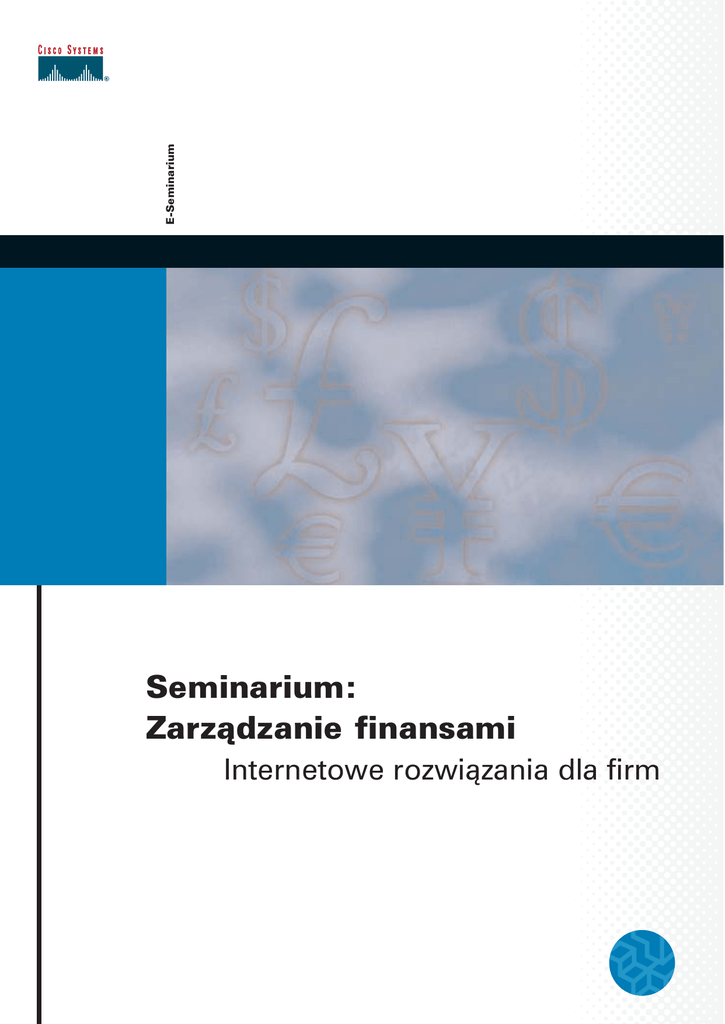 E-Seminarium Seminarium: Zarzàdzanie finansami Internetowe rozwiàzania dla firm Seminarium: Zarzàdzanie finansami Internetowe rozwiàzania dla firm 3 Powitanie 4 Cele 5 Zarzàdzanie finansami 6 Definicja zarzàdzania e-finansami 7 Rozwiàzania w zarzàdzaniu finansami 8 KorzyÊci 9 Warunki odniesienia sukcesu 10 Rozwiàzania techniczne 11 Wnioski Seminarium: Zarzàdzanie finansami Powitanie Witamy na e-seminarium Internetowe rozwiàzania dla firm, poÊwi´conemu zarzàdzaniu finansami. Wykorzystanie strategii internetowych pozwala na uzyskanie w dowolnym momencie szczegó∏owego obrazu sytuacji finansowej przedsi´biorstwa oraz szybsze i skuteczniejsze reagowanie na zagro˝enia i otwierajàce si´ mo˝liwoÊci. Seminarium jest poÊwi´cone sposobom, w jakie systemy zarzàdzania finansami mogà pomóc firmie w szybszym i precyzyjniejszym gromadzeniu wa˝nych informacji finansowych oraz w procesie podejmowania decyzji finansowych. 3 of 12 Seminarium: Zarzàdzanie finansami Cele Podczas tego seminarium zostanà omówione aspekty biznesowe internetowych systemów zarzàdzania finansami. Na wst´pie przedstawimy koncepcje zarzàdzania finansami. Nast´pnie s∏uchacze poznajà korzyÊci, jakie niosà firmom internetowe systemy zarzàdzania finansami. Na koniec omówimy implementacyjne aspekty systemów zarzàdzania finansami oraz warunki ich pomyÊlnego wdro˝enia w przedsi´biorstwie. 4 of 12 Seminarium: Zarzàdzanie finansami Zarzàdzanie finansami Przepraszam, czy móg∏bym zadaç pytanie? Prowadz´ firm´, zatrudniajàca 70 pracowników. Czy kiedy mowa o systemach zarzàdzania finansami, nie chodzi czasem o kosztowne oprogramowanie finansowe u˝ywane w wielkich korporacjach? To niestety wcià˝ charakterystyczne dla wielu osób podejÊcie do zarzàdzania finansami. Istnieje jednak wiele odmian aplikacji internetowych o ró˝nej skali, w tym tak˝e systemy zarzàdzania finansami dost´pne dla ma∏ych i Êrednich firm. Aha, zapewne chodzi o arkusze kalkulacyjne i bazy danych? Nie, mówimy tu o prawdziwych systemach zarzàdzania finansami, obejmujàcych ca∏à firm´ i automatyzujàcych czynnoÊci i procesy finansowe we wszystkich aspektach. Pozwolà one udost´pniç kierownictwu firmy aktualne informacje finansowe o znaczeniu krytycznym i zastàpià tradycyjne, r´czne i czasoch∏onne sporzàdzanie d∏ugich i szybko dezaktualizujàcych si´ raportów. Ponadto, okreÊlone informacje finansowe mogà byç rozsy∏ane drogà elektronicznà do konsultantów, banków, klientów i dostawców, w dowolne miejsce i w dowolnym czasie. 5 of 12 Seminarium: Zarzàdzanie finansami Definicja zarzàdzania e-finansami Czyli nie chodzi tylko o wyliczanie i tworzenie zwyk∏ych sprawozdaƒ finansowych firmy? Nie. Internetowe zarzàdzanie finansami, nazywane czasem e-finansami, mo˝e obejmowaç znacznie wi´cej: zarzàdzanie bud˝etami firm, bie˝àce wskaêniki finansowe, wewn´trzne i zewn´trzne procesy finansowe oraz stan Êrodków pieni´˝nych w firmie. Sà cztery kluczowe obszary dzia∏aƒ, w zakresie zarzàdzania finansami w firmie: Podstawowe procesy finansowe obejmujà przechowywanie rejestrów oraz czynnoÊci ksi´gowe. Planowanie i analizy obejmujà takie dzia∏ania, jak prognozowanie, sporzàdzanie bud˝etów i zarzàdzanie wynikami finansowymi. Zarzàdzanie Êrodkami pieni´˝nymi to optymalizowanie stanu Êrodków pieni´˝nych w przedsi´biorstwie. Zarzàdzanie przychodami i kredytami klientów odnosi si´ do wszelkich dzia∏aƒ zwiàzanych z nale˝noÊciami przedsi´biorstwa. 6 of 12 Seminarium: Zarzàdzanie finansami Rozwiàzania w zarzàdzaniu finansami No dobrze, ale wcià˝ nie wiem, co móg∏by robiç system zarzàdzania finansami, czego nie robià systemy, których u˝ywamy obecnie. Nie opieramy si´ wy∏àcznie na papierowych dokumentach, u˝ywamy komputerów i oprogramowania, np: programu ksi´gowego. Istniejà ró˝ne rodzaje internetowych systemów zarzàdzania finansami, zale˝nie od rodzaju dzia∏aƒ finansowych, które obs∏ugujà. Systemy te ró˝nià si´ od tradycyjnych aplikacji do zarzàdzania finansami tym, ˝e wykorzystujà mo˝liwoÊci sieci i internetu. Istniejà rozwiàzania obs∏ugujàce procesy finansowe, planowanie i analizy, zarzàdzanie Êrodkami pieni´˝nymi oraz zarzàdzanie przychodami, w tym rozrachunkami i windykacjà. Sieciowy aspekt tych rozwiàzaƒ umo˝liwia wewn´trznym dzia∏om przedsi´biorstwa, na przyk∏ad dzia∏om sprzeda˝y, administracji i zaopatrzenia, uzyskanie bezpoÊredniego dost´pu do danych w czasie rzeczywistym. Dane sà gromadzone z ró˝nych êróde∏ i przekszta∏cane w format odpowiedni dla ka˝dego autoryzowanego u˝ytkownika. Pozwala to na podejmowanie kontrolowanych i bezpiecznych dzia∏aƒ przez kierownictwo firmy i uprawnionych pracowników ze wszystkich dzia∏ów. 7 of 12 Seminarium: Zarzàdzanie finansami KorzyÊci Có˝, te aplikacje mogà byç ca∏kiem interesujàce, ale jakie, wnoszà one korzyÊci oprócz ∏adnych wykresów? Po pierwsze, systemy do zarzàdzania finansami mogà obni˝yç koszty przedsi´biorstwa, zwi´kszajàc produktywnoÊç dzia∏u finansowego i zmniejszajàc ryzyko pope∏niania b∏´dów. Poprawiajà one tak˝e mo˝liwoÊci w zakresie planowania, pokazujàc ka˝demu, kto tego potrzebuje, aktualny co do minuty obraz sytuacji finansowej przedsi´biorstwa. Z pomocà tych u˝ytecznych narz´dzi dzia∏y finansowe mogà eliminowaç nieefektywne decyzje finansowe i wykorzystywaç pojawiajàce si´ mo˝liwoÊci, zwi´kszajàc zyski firmy. Poza tym, poniewa˝ informacje finansowe sà w ka˝dej chwili gromadzone z ró˝nych dzia∏ów oraz prezentowane w formie przejrzystych danych, wykresów i raportów, podejmowane decyzje sà trafniejsze i skuteczniejsze. 8 of 12 Seminarium: Zarzàdzanie finansami Warunki odniesienia sukcesu Rozumiem. Jednak w dalszym ciàgu sceptycznie podchodz´ do zmian moich sprawdzonych procedur finansowych. Obawiam si´, ˝e wprowadzenie nowego systemu zak∏óci