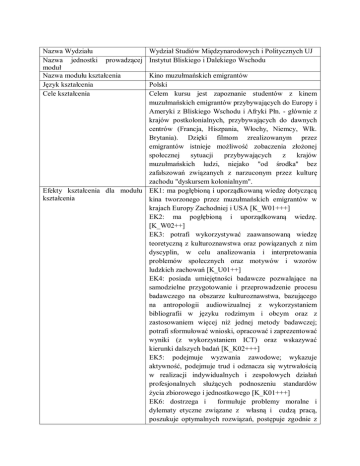 Nazwa Wydziału Nazwa jednostki prowadzącej moduł Nazwa modułu kształcenia Język kształcenia Cele kształcenia Wydział Studiów Międzynarodowych i Politycznych UJ Instytut Bliskiego i Dalekiego Wschodu Kino muzułmańskich emigrantów Polski Celem kursu jest zapoznanie studentów z kinem muzułmańskich emigrantów przybywających do Europy i Ameryki z Bliskiego Wschodu i Afryki Płn. - głównie z krajów postkolonialnych, przybywających do dawnych centrów (Francja, Hiszpania, Włochy, Niemcy, Wlk. Brytania). Dzięki filmom zrealizowanym przez emigrantów istnieje możliwość zobaczenia złożonej społecznej sytuacji przybywających z krajów muzułmańskich ludzi, niejako "od środka" bez zafałszowań związanych z narzuconym przez kulturę zachodu "dyskursem kolonialnym". Efekty kształcenia dla modułu EK1: ma pogłębioną i uporządkowaną wiedzę dotyczącą kształcenia kina tworzonego przez muzułmańskich emigrantów w krajach Europy Zachodniej i USA [K_W01+++] EK2: ma pogłębioną i uporządkowaną wiedzę. [K_W02++] EK3: potrafi wykorzystywać zaawansowaną wiedzę teoretyczną z kulturoznawstwa oraz powiązanych z nim dyscyplin, w celu analizowania i interpretowania problemów społecznych oraz motywów i wzorów ludzkich zachowań [K_U01++] EK4: posiada umiejętności badawcze pozwalające na samodzielne przygotowanie i przeprowadzenie procesu badawczego na obszarze kulturoznawstwa, bazującego na antropologii audiowizualnej z wykorzystaniem bibliografii w języku rodzimym i obcym oraz z zastosowaniem więcej niż jednej metody badawczej; potrafi sformułować wnioski, opracować i zaprezentować wyniki (z wykorzystaniem ICT) oraz wskazywać kierunki dalszych badań [K_K02+++] EK5: podejmuje wyzwania zawodowe; wykazuje aktywność, podejmuje trud i odznacza się wytrwałością w realizacji indywidualnych i zespołowych działań profesjonalnych służących podnoszeniu standardów życia zbiorowego i jednostkowego [K_K01+++] EK6: dostrzega i formułuje problemy moralne i dylematy etyczne związane z własną i cudzą pracą, poszukuje optymalnych rozwiązań, postępuje zgodnie z zasadami etyki [K_K03+++] Metody sprawdzania i kryteria Egzamin końcowy w formie pisemnej (test połączony z oceny efektów kształcenia częścią opisową dotyczącą wybranego problemu uzyskanych przez studentów poruszonego w czasie zajęć). Standardowa skala ocen. Typ modułu kształcenia Fakultatywny (obowiązkowy/fakultatywny) Rok studiów Dowolny Semestr Letni Forma studiów Stacjonarne Imię i nazwisko koordynatora Dr Piotr Kletowski modułu i/lub osoby/osób prowadzących moduł Imię i nazwisko osoby/osób Dr Piotr Kletowski egzaminującej/egzaminujących bądź udzielającej zaliczenia, w przypadku gdy nie jest to osoba prowadząca dany moduł Sposób realizacji Wykład Wymagania wstępne i dodatkowe Brak Rodzaj i liczba godzin zajęć 30 dydaktycznych wymagających bezpośredniego udziału nauczyciela akademickiego i studentów, gdy w danym module przewidziane są takie zajęcia Liczba punktów ECTS przypisana 3 modułowi Bilans punktów ECTS Udział w zajęciach, 30 godz. Przygotowanie do zajęć: studiowanie podręczników i dokumentów, 30 godz. Przygotowanie do testu: 30 godz. Razem: 90 godz. (3 ECTS) Stosowane metody dydaktyczne Metoda podająca: wykład Metody problemowe – metody aktywizujące – dyskusja dydaktyczna: element konwersatoryjny Zaliczenie na podstawie pozytywnej oceny z egzaminu oraz regularnego uczestniczenia w zajęciach, podczas których prócz elementu wykładowego obecny jest element konwersatoryjny, stymulujący studentów do aktywnego wykorzystywania zdobytej wiedzy. Forma i warunki zaliczenia modułu, w tym zasady dopuszczenia do egzaminu, zaliczenia, a także forma i warunki zaliczenia poszczególnych zajęć wchodzących w zakres danego modułu Treści modułu kształcenia 1. Dyskurs kolonialny i postkolonialny w perspektywie (z podziałem na formy realizacji kinematograficznej. zajęć) 2. Obraz muzułmańskiej wspólnoty i jej kultury w filmach tworzonych przez kinematografie zachodnie: "konserwatyści" i "reformatorzy" (kino popularne vs kino autorskie: Gillo Pontecorvo, Jean-Luc Godard, Rainer Warner Fassbinder, Andre Techiné, Mathieu Kassovitz i inni). 3. Kinematografia Afryki Płn. i jej wpływ na kino francuskie - od "Kina Rewolucji" do "Kina Przedmieść": a/ kino algierskie przed 1962 i po (twórczość Mohammeda Lakhdar-Hamina, Rachida Bouchareba, Yasminy Adi), b/ kino marokańskie (Hamid Bénani, Souheil Ben Barka, Moumen Smihi, Ahmed El Maânouni, Mustapha Derkaoui , Farida Benlyazd, Saâd Chraïbi, Hassan Benjelloun, Ismael Ferroukhi, c/ kino algierskich i marokańskich emigrantów we Francji (Bourlem Guerdjou, Daoud Aoulad-Syad, Yasmine Kassari, Abdellatifa Kechiche, Merzaka Allouache). 4. Kino tureckich emigrantów w Niemczech: I, II i III Pokolenie filmowców-emigrantów - od Gastarbeitkino do kina niemiecko-tureckiego: a/ twórczość Yilmaza Güneya i Tevfika Basera (I Pokolenie), b/ twórczość Fatiha Akina, Kutlugu Atamana (II Pokolenie) jako modelowy przykład kina niemieckotureckiego , c/ kino Yilmaza Arslana, Sinana Akkusa, Ayse Polat, Özgüra Yildirima (III Pokolenie) 4. Filmowy Bliski Wschód w Europie i w USA. a/ tematyka bliskowschodnia w kinie zachodnim (w perspektywie postkolonialnej), b/ filmowcy z Bliskiego Wschodu w Hollywood (Mustafa Akkad, Marjane Satrapi i inni), c/ kino palestyńskie realizowane na Zachodzie (twórczość Mohammada Bakriego),. 5. Kryzys migracyjny i kino dokumentalne muzułmańskich i żydowskich emigrantów (twórczość Izze Genini, Yaminy Benguigui, Tamera El Saida i innych). 6. Tematyka muzułmańskich emigrantów w kinie nurtu transkulturowego. Wykaz literatury podstawowej Krzysztof Loska, Postkolonialna Europa. Etnoobrazy i uzupełniającej obowiązującej do współczesnego kina, Wyd. Universitas, Kraków 2015; E. zaliczenia danego modułu Said, Kultura i imperializm, Wyd. 