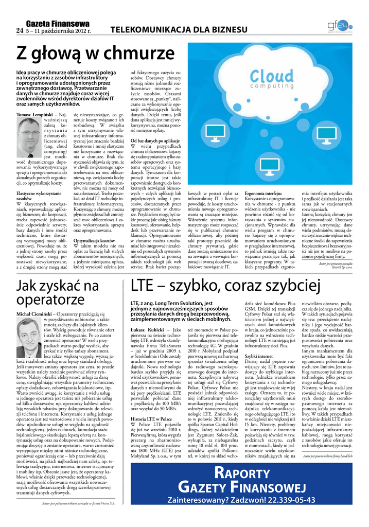 24 5 – 11 października 2012 r. telekomunikacja dla biznesu Z głową w chmurze Idea pracy w chmurze obliczeniowej polega na korzystaniu z zasobów infrastruktury i oprogramowania udostępnionych przez zewnętrznego dostawcę. Przetwarzanie danych w chmurze znajduje coraz więcej zwolenników wśród dyrektorów działów IT oraz samych użytkowników. Tomasz Łempiński – Najważniejszą zaletą korzystania z chmury obliczeniowej (ang. cloud computing) jest możliwość dynamicznego dopasowania wykorzystywanego sprzętu i oprogramowania do aktualnych potrzeb organizacji, co optymalizuje koszty. Elastyczne wykorzystanie zasobów W klasycznych rozwiązaniach, wprowadzając aplikację biznesową do korporacji, trzeba zapewnić jednocześnie odpowiednie serwery, bazy danych i inne środki techniczne, które dostarczą wymaganej mocy obliczeniowej. Powoduje to, że z jednej strony zasoby przez większość czasu mogą pozostawać niewykorzystane, a z drugiej strony mogą stać się niewystarczające, co generuje koszty związane z ich rozbudową. W związku z tym utrzymywanie własnej infrastruktury informatycznej jest znacznie bardziej kosztowne i mniej elastyczne niż korzystanie z rozwiązania w chmurze. Brak elastyczności objawia się tym, że w chwili zwiększonego zapotrzebowania na moc obliczeniową, np. zwiększenia liczby przetwarzanych dokumentów, nie można tej mocy od razu dostarczyć. Trzeba poczekać, aż dział IT rozbuduje infrastrukturę informatyczną. Korzystając z chmury, można płynnie zwiększać lub zmniejszać moc obliczeniową i zakres wykorzystania sprzętu oraz oprogramowania. Optymalizacja kosztów W takim modelu nie ma opłat za licencję lub stałych abonamentów miesięcznych, a jedynie miesięczna opłata, której wysokość zależna jest Jak zyskać na operatorze Michał Ciemiński – Operatorzy prześcigają się w pozyskiwaniu odbiorców, a także mnożą zachęty dla lojalnych klientów. Wyścig powoduje równanie ofert i stałe ich wzbogacanie. Po co zatem zmieniać operatora? W wielu przypadkach warto podjąć wysiłek, aby zyskać nie tylko tańszy abonament, lecz także większą wygodę, wyższą jakość i stabilność usług oraz lepszy standard obsługi. Jeśli motywem zmiany operatora jest cena, to przede wszystkim należy rzetelnie porównać oferty rynkowe. Należy określić efektywność usługi za daną cenę, uwzględniając wszystkie parametry techniczne, opłaty dodatkowe, zobowiązania lojalnościowe, itp. Warto zwrócić uwagę, że korzystanie z wielu usług u jednego operatora jest tańsze niż pobieranie usług od kilku dostawców, np. operatorzy kablowi udzielają wysokich rabatów przy dokupowaniu do telewizji telefonu i internetu. Korzystanie z usług jednego operatora jest też wartościowe z wielu innych powodów: ujednolicone usługi ze względu na zgodność technologiczną, jeden rachunek, kumulacja stażu lojalnościowego skutkująca lepszą ofertą na kontynuację usług oraz na dokupowanie nowych. Podejmując decyzję o zmianie operatora, warto zrozumieć występujące między nimi różnice technologiczne, ponieważ ograniczają one – lub przeciwnie dają możliwości, na jakich najbardziej nam zależy, np. telewizja tradycyjna, internetowa, internet stacjonarny i mobilny itp. Obecnie jasne jest, że operatorzy kablowi, właśnie dzięki przewadze technologicznej, mają możliwość oferowania wszystkich nowoczesnych usług dostarczanych drogą szerokopasmowej transmisji danych cyfrowych. Autor jest pełnomocnikiem zarządu w firmie Vectra S.A. od faktycznego zużycia zasobów. Dostawcy chmury stosują różne jednostki rozliczeniowe mierzące zużycie zasobów. Czasami stosowane są „punkty”, naliczane za wykonywanie operacji zwiększających liczbę danych. Dzięki temu, jeśli dana aplikacja jest mniej wykorzystywana, można ponosić mniejsze opłaty. Od baz danych po aplikacje W wielu przypadkach chmura obliczeniowa kojarzy się z udostępnianiem tylko zasobów sprzętowych oraz systemu operacyjnego i bazy danych. Tymczasem dla korporacji istotne jest także zapewnienie dostępu do konkretnych rozwiązań biznesowych – całych aplikacji lub pojedynczych usług i procesów, dostarczanych przez oprogramowanie w chmurze. Przykładem mogą być takie procesy, jak: obieg faktury kosztowej, ofertowanie, helpdesk lub przetwarzanie reklamacji. Oprogramowanie w chmurze można uruchamiać lub integrować niezależnie od pozostałych systemów informatycznych za pomocą takich technologii jak web service. Brak barier począt- kowych w postaci opłat za infrastrukturę IT i licencje powoduje, że koszty uruchomienia nowego oprogramowania są znacząco mniejsze. Wdrożenie systemu informatycznego może rozpocząć się w publicznej chmurze obliczeniowej, aby później taki prototyp przenieść do chmury prywatnej, gdzie dane zostają umieszczone nie na zewnątrz a wewnątrz korporacji i tworzą docelowe, całościowe rozwiązanie IT. Ergonomia interfejsu Korzystanie z oprogramowania w chmurze - z punktu widzenia użytkownika - nie powinno różnić się od korzystania z systemów stacjonarnych. Wprawdzie dla wielu program w chmurze kojarzy się z oprogramowaniem uruchomionym w przeglądarce internetowej, to jednak istnieją także rozwiązania pracujące tak, jak klasyczne programy. W takich przypadkach ergono- mia interfejsu użytkownika i prędkość działania jest taka sama jak w stacjonarnych rozwiązaniach. Istotną korzyścią chmury jest jej niezawodność. Dostawcy chmury, utrzymując dane wielu podmiotów, muszą dostarczyć znacznie większe techniczne środki do zapewnienia bezpieczeństwa i bezawaryjności niż jest to możliwe na poziomie pojedynczej firmy. Autor jest prezesem zarządu Tenvirk Sp. z o.o. LTE – szybko, coraz szybciej LTE, z ang. Long Term Evolution, jest jednym z najnowocześniejszych sposobów przesyłania danych drogą bezprzewodową, zaimplementowanym w sieciach mobilnych. Łukasz