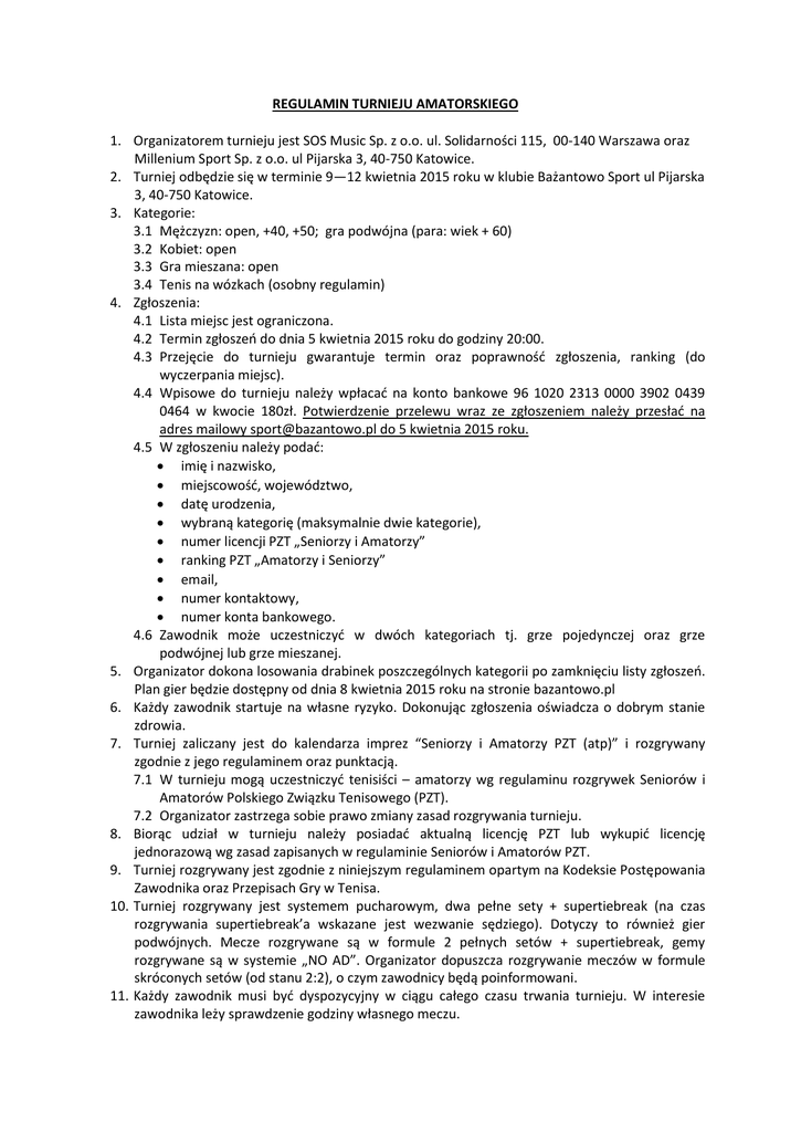 REGULAMIN TURNIEJU AMATORSKIEGO 1. Organizatorem turnieju jest SOS Music Sp. z o.o. ul. Solidarności 115, 00-140 Warszawa oraz Millenium Sport Sp. z o.o. ul Pijarska 3, 40-750 Katowice. 2. Turniej odbędzie się w terminie 9—12 kwietnia 2015 roku w klubie Bażantowo Sport ul Pijarska 3, 40-750 Katowice. 3. Kategorie: 3.1 Mężczyzn: open, +40, +50; gra podwójna (para: wiek + 60) 3.2 Kobiet: open 3.3 Gra mieszana: open 3.4 Tenis na wózkach (osobny regulamin) 4. Zgłoszenia: 4.1 Lista miejsc jest ograniczona. 4.2 Termin zgłoszeń do dnia 5 kwietnia 2015 roku do godziny 20:00. 4.3 Przejęcie do turnieju gwarantuje termin oraz poprawność zgłoszenia, ranking (do wyczerpania miejsc). 4.4 Wpisowe do turnieju należy wpłacać na konto bankowe 96 1020 2313 0000 3902 0439 0464 w kwocie 180zł. Potwierdzenie przelewu wraz ze zgłoszeniem należy przesłać na adres mailowy [email protected] do 5 kwietnia 2015 roku. 4.5 W zgłoszeniu należy podać: imię i nazwisko, miejscowość, województwo, datę urodzenia, wybraną kategorię (maksymalnie dwie kategorie), numer licencji PZT „Seniorzy i Amatorzy” ranking PZT „Amatorzy i Seniorzy” email, numer kontaktowy, numer konta bankowego. 4.6 Zawodnik może uczestniczyć w dwóch kategoriach tj. grze pojedynczej oraz grze podwójnej lub grze mieszanej. 5. Organizator dokona losowania drabinek poszczególnych kategorii po zamknięciu listy zgłoszeń. Plan gier będzie dostępny od dnia 8 kwietnia 2015 roku na stronie bazantowo.pl 6. Każdy zawodnik startuje na własne ryzyko. Dokonując zgłoszenia oświadcza o dobrym stanie zdrowia. 7. Turniej zaliczany jest do kalendarza imprez “Seniorzy i Amatorzy PZT (atp)” i rozgrywany zgodnie z jego regulaminem oraz punktacją. 7.1 W turnieju mogą uczestniczyć tenisiści – amatorzy wg regulaminu rozgrywek Seniorów i Amatorów Polskiego Związku Tenisowego (PZT). 7.2 Organizator zastrzega sobie prawo zmiany zasad rozgrywania turnieju. 8. Biorąc udział w turnieju należy posiadać aktualną licencję PZT lub wykupić licencję jednorazową wg zasad zapisanych w regulaminie Seniorów i Amatorów PZT. 9. Turniej rozgrywany jest zgodnie z niniejszym regulaminem opartym na Kodeksie Postępowania Zawodnika oraz Przepisach Gry w Tenisa. 10. Turniej rozgrywany jest systemem pucharowym, dwa pełne sety + supertiebreak (na czas rozgrywania supertiebreak’a wskazane jest wezwanie sędziego). Dotyczy to również gier podwójnych. Mecze rozgrywane są w formule 2 pełnych setów + supertiebreak, gemy rozgrywane są w systemie „NO AD”. Organizator dopuszcza rozgrywanie meczów w formule skróconych setów (od stanu 2:2), o czym zawodnicy będą poinformowani. 11. Każdy zawodnik musi być dyspozycyjny w ciągu całego czasu trwania turnieju. W interesie zawodnika leży sprawdzenie godziny własnego meczu. 12. Każdy zawodnik zobowiązany jest do stawienia się w biurze turnieju, co najmniej 15 minut przed swoim meczem. Zawodnik, który nie jest gotowy do gry w ciągu 15 minut od wywołania może być zdyskwalifikowany niezależnie od przyczyny. 13. Kort treningowy może być dostępny odpłatnie w ciągu 2 dni przed startem turnieju po wcześniejszej rezerwacji w recepcji klubu Bażantowo Sport. 14. W trakcie rozgrywek wymagany jest strój sportowy i przepisowe obuwie tenisowe. 15. Piłki używane w turnieju: Babolat Team. 16. Zabrania się reklamy innych turniejów tenisowych na koszulkach lub bluzach. 17. Nagradzane są miejsca I, II i III w każdej kategorii. O miejscu trzecim decyduje przewaga wygranych gemów w półfinale, a w przypadku remisu rozgrywany będzie mecz o III miejsce. System rozgrywek o III miejsce ustala Organizator. 18. Ostateczną decyzję w przypadku sporów w grze podejmuje Sędzia Naczelny. Zdanie Sędziego Naczelnego jest niepodważalne. 19. Nagrody pieniężne będą wypłacane jedynie za pomocą przelewu na konto podane w formularzu zgłoszeniowym. 20. Rezygnacja z turnieju jest możliwa nie później niż do 5 kwietnia 2014 roku do godziny 20:00. Po tym terminie nie będzie możliwy zwrot pieniędzy. 21. Transport i zakwaterowanie dla zawodników spoza Katowic – we własnym zakresie. 22. W trakcie turnieju będzie sporządzana dokumentacja fotograficzna oraz filmowa przez osoby uprawnione do tego celu przez Organizatora. Zdjęcia będą zamieszczone m.in. w galerii na stronie internetowej turnieju. Liczymy na dobre humory, widowiskowe mecze i grę fair play. Zapraszamy!