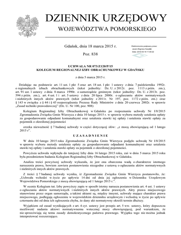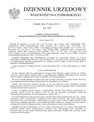 DZIENNIK URZĘDOWY WOJEWÓDZTWA POMORSKIEGO Gdańsk, dnia 18 marca 2015 r. Elektronicznie podpisany przez: Jacek Zbigniew Karpiński Poz. 838 Data: 2015-03-18 11:00:22 UCHWAŁA NR 073/Z120/P/15 KOLEGIUM REGIONALNEJ IZBY OBRACHUNKOWEJ W GDAŃSKU z dnia 5 marca 2015 r. Działając na podstawie art. 11 ust. 1 pkt 5 oraz art. 18 ust. 1 pkt 1 ustawy z dnia 7 października 1992r. o regionalnych izbach obrachunkowych (tekst jednolity: Dz. U. z 2012r. poz. 1113 z późn. zm.), art. 91 ust. 1 ustawy z dnia 8 marca 1990r. o samorządzie gminnym (tekst jednolity: Dz. U. z 2013r. poz. 594 z późn. zm.), art. 4 ust. 1 i art. 5 ustawy z dnia 20 lipca 2000r. o ogłaszaniu aktów normatywnych i niektórych innych aktów prawnych (tekst jednolity z 2011r. Nr 197, poz. 1172 z późn. zm.) oraz § 143 w związku z § 44 i § 45 rozporządzenia Prezesa Rady Ministrów z dnia 20 czerwca 2002r. w sprawie „Zasad techniki prawodawczej” (Dz. U. Nr 100, poz. 908) Kolegium Regionalnej Izby Obrachunkowej w Gdańsku po rozpoznaniu uchwały Nr I/8/2015 Zgromadzenia Związku Gmin Wierzyca z dnia 10 lutego 2015 r. w sprawie wyboru metody ustalenia opłaty za gospodarowanie odpadami komunalnymi oraz ustalenia stawki tej opłaty i ustalenia stawki opłaty za pojemnik o określonej pojemności orzeka nieważność § 7 badanej uchwały w części dotyczącej słów: „z mocą obowiązującą od 1 lutego 2015 r”. UZASADNIENIE W dniu 10 lutego 2015 roku Zgromadzenie Związku Gmin Wierzyca podjęło uchwałę Nr I/8/2015 w sprawie wyboru metody ustalenia opłaty za gospodarowanie odpadami komunalnymi oraz ustalenia stawki tej opłaty i ustalenia stawki oplaty za pojemnik o określonej pojemności. Powyższa uchwała wpłynęła do tutejszej Izby dnia 16 lutego 2015 roku, zaś w dniu 5 marca 2015 roku była przedmiotem badania Kolegium Regionalnej Izby Obrachunkowej w Gdańsku. Analiza treści powyższej uchwały wykazała, że jest ona obarczona wadą o charakterze istotnego naruszenia prawa, bowiem zawiera postanowienia niezgodne z ustawą o ogłaszaniu aktów normatywnych i niektórych innych aktów prawnych. Z treści § 7 badanej uchwały wynika, iż Zgromadzenie Związku Gmin Wierzyca postanowiło, że: „Uchwała wchodzi w życie po upływie 14 dni od dnia jej ogłoszenia w Dzienniku Urzędowym Województwa Pomorskiego z mocą obowiązującą od 1 lutego 2015 r.”. W ocenie Kolegium tut. Izby powyższy zapis w sposób istotny narusza postanowienia art. 4 ust. 1 ustawy o ogłaszaniu aktów normatywnych i niektórych innych aktów prawnych. Akty prawa miejscowego stanowione przez organ samorządu, a takimi aktami są, między innymi, uchwały mające charakter prawa miejscowego, podlegają ogłoszeniu w wojewódzkim dzienniku urzędowym i wchodzą w życie po upływie czternastu dni od dnia ich ogłoszenia chyba, że dany akt normatywny określi termin dłuższy. Wyjątkiem od zasad wynikających z art. 4 cyt. ustawy jest przepis art. 5 ww. ustawy, który dopuszcza możliwość nadania aktowi normatywnemu wstecznej mocy obowiązującej, pod warunkiem, że nie sprzeciwiają się temu zasady demokratycznego państwa prawnego. Wyjątku tego nie można jednak interpretować rozszerzająco. Dziennik Urzędowy Województwa Pomorskiego –2– Poz. 838 _______________________________________________________________________________________________________________ W przypadku badanej uchwały, w ocenie Kolegium tut. Izby, nie zachodzą przesłanki do skorzystania przez Zgromadzenie Związku Gmin Wierzyca z możliwości wynikających z art. 5 cytowanej ustawy. W kontekście zasad demokratycznego państwa prawnego dodać należy, że wsteczna moc prawa może dotyczyć ewentualnie tylko przyznania praw. Wykluczyć natomiast należy możliwość zastosowania tej normy do nakładania obowiązków. Nawet w przypadku nadania mocy wstecznej przepisom korzystniejszym, z uwagi na wyjątkowy charakter takiego zabiegu, należy mieć na uwadze interes wszystkich podmiotów działających w obrocie prawnym, a więc adresatów i uchwałodawcy. Ponadto zasada zaufania obywateli do państwa wymaga, by mocy wstecznej przy zastosowaniu art. 5 ustawy nie nadawać przepisom, które regulują prawa i obowiązki obywateli i pogarszają ich sytuację prawną (orzeczenie Trybunału Konstytucyjnego z dnia 30 listopada 1988 r., K 1/88 i wyroki Trybunału Konstytucyjnego: z dnia 8 marca 2005 r., K 27/03 i z dnia 19 marca 2007 r. K 47/05). Zdaniem tutejszego Kolegium tut. Izby brak jest uzasadnienia do nadania badanej uchwale mocy wcześniej obowiązującej, niż dopuszcza to przywołana wcześniej ustawa o ogłaszaniu aktów normatywnych i niektórych innych aktów prawnych. Kolegium tut. Izby stwierdziło zatem, że zachodzą przesłanki do zastosowania kategorycznie sformułowanej w art. 4 ust. 1 ustawy zasady o wejściu w życie aktu normatywnego po upływie czternastu dni od dnia jego ogłoszenia w dzienniku urzędowym. Ponadto naruszono postanowienia § 143 w związku z §§ 44 i 45 rozporządzenia Prezesa Rady Ministrów w sprawie „Zasad techniki prawodawczej” z uwagi na to, że § 5 badanej uchwały zawiera dwie wykluczające się normy prawne. Trybunał Konstytucyjny w swoim orzeczeniu z dnia 24 października 1995r. sygn. akt K 14/95 (publikacja: OTK 1995, nr 2, poz. 12) orzekł, że wejście w życie może być rozumiane jedynie jako nadanie mocy obowiązującej określonemu aktowi (przepisowi) normatywnemu, a przy dwu wykluczających się normach prawnych należy dać prymat normie, która jest zgodna z zasadami państwa prawnego. Z powyższego wynika, że uchwała nie może wejść w życie bez uzyskania przez nią mocy obowiązującej i odwrotnie - uzyskanie mocy obowiązującej oznacza wejście w życie uchwały. W uzasadnionych przypadkach akty normatywne, z wyjątkiem przepisów porządkowych, mogą wchodzić w życie w terminie krótszym niż czternaście dni, a jeżeli ważny interes państwa wymaga natychmiastowego wejścia w