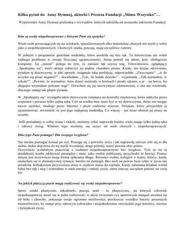 Kilka pytań do Anny Dymnej, aktorki i Prezesa Fundacji „Mimo Wszystko”… Wypowiedzi Anny Dymnej pochodzą z wywiadów, których udzieliła od momentu założenia Fundacji. Kim są osoby niepełnosprawne z którymi Pani się spotyka? Wiele osób poruszających się na wózkach, sparaliżowanych albo śmiertelnie chorych nie myśli o sobie jako o niepełnosprawnych. Ukończyli studia, pracują, mają szczęśliwe rodziny. W jednym z programów gościłam studentkę, która urodziła się bez rąk. Ta dziewczyna nie widzi żadnego problemu w swojej fizycznej ograniczoności. Sama potrafi się ubrać, jeść, obsługiwać komputer. Jej „inność” polega na tym, że zamiast rąk używa nóg. Telewidzowie, oglądający „Spotkajmy się”, mieli okazję zobaczyć jej piękny charakter pisma. Kiedy, nie kryjąc zdziwienia, pytałam tę dziewczynę, w jaki sposób, osiągnęła taką perfekcję, odpowiadała: „Zwyczajnie”. „A ile uczyłaś się pisać nogami?” - dociekałam. „Tyle, ile każde dziecko” - wyjaśniała. „Tak normalnie, w szkole?”. „Pewnie, że normalnie. Inne dzieci siedziały w ławkach i pisały rękami, a ja – na ławce, bo długopis trzymałam palcami nogi”. Dziwiłam się jej niezwykłym zdolnościom, a ona nie wiedziała, dlaczego zadaję tak głupie pytania. W „Spotkajmy się” wystąpiła także dziewczyna cierpiąca na dystrofię mięśniową, która oddycha przez respirator i porusza tylko jedną ręką. Cóż za wielka moc musi być w tej dziewczynie, skoro nie mogąc nawet siedzieć, studiuje przez Internet i pisze cudowne wiersze. Dziekan, który przyjeżdża ją egzaminować, stwierdził, że jest jego najlepszą studentką. Co więcej – już teraz obiecał jej pracę na uczelni. Jeśli posiadamy w sobie wiarę i radość, możemy robić naprawdę bardzo wiele mając tylko jedną rękę i zdrowy mózg. Właśnie tego możemy się uczyć od osób chorych i niepełnosprawnych. Dlaczego Pani pomaga? Dla swojego rozgłosu? Nie można pomagać komuś po coś. Pomaga się z potrzeby serca i tak naprawdę zawsze robi się to dla siebie. Jeden dojrzewa do tej myśli wcześniej, drugi później, trzeci pewnie zbyt późno. Oczywiście wolałabym pracować z osobami niepełnosprawnymi bez rozgłosu. Tyle że na tę działalność trzeba zdobywać pieniądze i mnie, jako osobie publicznej, przychodzi to łatwiej. Pomoc innym jest oczywiście moją formą spłacania długu. Również wobec kolegów z teatru, którzy, kiedy znalazłam się w dramatycznej sytuacji, bardzo mi pomogli. Bez nich na pewno bym sobie w życiu nie poradziła. Kilkakrotnie przywożono mnie w ciężkim stanie do szpitala. Kiedy załamana leżałam wśród ludzi bez rąk i nóg i widziałam w nich energię i radość życia, sama inaczej zaczęłam patrzeć na swój los. Na jakich płaszczyznach mogą realizować się osoby niepełnosprawne? Sport, sztuki plastyczne, rękodzieło, poezja, teatr - to płaszczyzny, na których człowiek niepełnosprawny może się w pełni realizować: w akcie tworzenia czy sportowych zmagań uwalnia się od bólu i choroby, pokazuje swoje ogromne możliwości, przekracza wszelkie bariery pozornych niemożliwości, by stanąć przy zdrowym człowieku i niejednokrotnie zawstydzić jego lenistwo, niemoc i bylejakość życia. Pani zaangażowanie na rzecz społecznej integracji oraz w działania charytatywne jest ogromne. Wydaje się jednak, że w świecie komercji, w którym życie rządzone jest przez utylitaryzm, karierę i sukces, osoby chore i niepełnosprawne zawsze pozostaną ludźmi drugiej kategorii. Ma Pani tego świadomość? Świadomość mam! Świadomość, że w taki sposób tych ludzi w Polsce się traktuje, choć często są w wyższej kategorii niż wielu z nas. Oczywiście wiem, że osoby niepełnosprawne intelektualnie zawsze będą ludźmi innymi niż my. Podkreślam: innymi, bo być może świat zauważy kiedyś, że są to jednostki niezwykłe, od których dużo możemy się nauczyć. Liczę na to. A co do ludzi w taki czy inny sposób uszkodzonych fizycznie, myślę, że wśród nich również są umysły wybitne: zdolni matematycy, fizycy, tłumacze języków obcych, poeci, osoby ze wszech miar przydatne społeczeństwu. Nieraz z takimi ludźmi się stykam. Trzeba im tylko dać szansę normalnego funkcjonowania w tym naszym świecie. Nic poza tym. Zresztą ten problem dotyczy przede wszystkim polskiej rzeczywistości oraz mentalności. Na przykład w Stanach Zjednoczonych, w Japonii czy na Zachodzie Europy osoby poruszające się o kulach albo na wózkach pracują w agendach rządowych, w firmach komputerowych, są projektantami, stylistami. W tych krajach jest to zjawisko powszechne, które nikogo nie dziwi. Ludzie pozbawieni nóg niczym przecież nie różnią się od tych, którzy posiadają dwie ręce i dwie nogi. Mają talenty, są szalenie pracowici, więc zarabiają ogromne pieniądze. Pan chyba wie, kim jest Stephen Hawking? Być może taki Hawking żyje również gdzieś w Polsce, lecz bieda, uprzedzenia, stereotypy albo bariery architektoniczne nie pozwalają mu pokazać się światu. Moje społeczne działania nie służą jedynie materialnemu wspieraniu osób chorych i niepełnosprawnych. Nastawione są przede wszystkim na wyrównywanie szans pomiędzy ludźmi. Służą temu między innymi imprezy, które wraz z TVP, organizuje Fundacja „Mimo Wszystko”. Ponieważ znam wiele osób w taki czy inny sposób doświadczonych przez los, wiem, że one nie potrzebują łzawego współczucia, taryfy ulgowej i jałmużny. Chcą mieć tylko szansę na rozwój swoich umiejętności, podobnie jak osoby posiadające zdrowe oczy, słuch, dwie ręce i dwie nogi. Cieszę się, że coraz więcej ludzi dostrzega ten fakt, a moje przedsięwzięcia zyskują nowych przyjaciół. Widząc cierpienie zwykle odwracamy głowy. Jak możemy pomóc osobom niepełnosprawnym? Zdarza się , że niektórzy nie czują się na siłach, by 