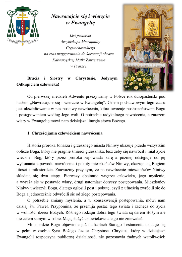 Nawracajcie się i wierzcie w Ewangelię List pasterski Arcybiskupa Metropolity Częstochowskiego na czas przygotowania do koronacji obrazu Kalwaryjskiej Matki Zawierzenia w Praszce. Bracia i Siostry Odkupicielu człowieka! w Chrystusie, Jedynym Od pierwszej niedzieli Adwentu przeżywamy w Polsce rok duszpasterski pod hasłem „Nawracajcie się i wierzcie w Ewangelię”. Celem podstawowym tego czasu jest ukształtowanie w nas postawy nawrócenia, która owocuje posłuszeństwem Bogu i postępowaniem według Jego woli. O potrzebie radykalnego nawrócenia, a zarazem wiary w Ewangelię mówi nam dzisiejsza liturgia słowa Bożego. 1. Chrześcijanin człowiekiem nawrócenia Historia proroka Jonasza i grzesznego miasta Niniwy ukazuje przede wszystkim oblicze Boga, który nie pragnie śmierci grzesznika, lecz żeby się nawrócił i miał życie wieczne. Bóg, który przez proroka zapowiada karę a później odstępuje od jej wykonania z powodu nawrócenia i pokuty mieszkańców Niniwy, okazuje się Bogiem litości i miłosierdzia. Zauważmy przy tym, że na nawrócenie mieszkańców Niniwy składają się dwa etapy. Pierwszy obejmuje wnętrze człowieka, jego myślenie, a wyraża się w postawie wiary, drugi natomiast dotyczy postępowania. Mieszkańcy Niniwy uwierzyli Bogu, dlatego ogłosili post i pokutę, czyli z ufnością zwrócili się do Boga a jednocześnie odwrócili się od złego postępowania. O potrzebie zmiany myślenia, a w konsekwencji postępowania, mówi nam dzisiaj św. Paweł. Przypomina, że przemija postać tego świata i zachęca do życia w wolności dzieci Bożych. Różnego rodzaju dobra tego świata są darem Bożym ale nie celem samym w sobie. Mają służyć człowiekowi ale go nie zniewalać. Miłosierdzie Boga objawione już na kartach Starego Testamentu ukazuje się w pełni w osobie Syna Bożego Jezusa Chrystusa. Chrystus, który w dzisiejszej Ewangelii rozpoczyna publiczną działalność, nie pozostawia żadnych wątpliwości: Jego misją jest doprowadzić wszystkich ludzi do zbawienia, do spotkania z miłosiernym Bogiem poprzez nawrócenie i wiarę w Ewangelię. Szczegółowa analiza dzisiejszej Ewangelii pokazuje nie tylko bezpośredni i organiczny związek nawrócenia z wiarą w Ewangelię, ale również precyzuje, o jaką wiarę tu chodzi. Jezus dziś wzywa nas nie tylko do jednorazowego aktu wiary, ale również do trwania w wierze. Wiara ta polega na przyjmowaniu nauki Jezusa i opieraniu się na niej w codziennym życiu. To z kolei zakłada osobową, pełną ufności relację z Jezusem, który nie tylko głosi Ewangelię, ale sam jest Ewangelią. Tylko taka postawa zapewnia życie w stałym nawróceniu. Wówczas mocą Chrystusa i Jego Ewangelii jesteśmy w stanie nie tylko zrywać z grzesznymi przyzwyczajeniami, ale również realizować Boży zamysł względem nas. 2. Sanktuaria miejscem nawrócenia i głoszenia Ewangelii Dzisiejsza Ewangelia w łączności z wezwaniem do nawrócenia i wiary w Ewangelię opisuje fakt powołania pierwszych Apostołów. To dzięki nim i ich następcom głos Ewangelii o Jezusie Chrystusie rozchodzi się po całej ziemi. Szczególnym miejscem głoszenia Dobrej Nowiny i nawrócenia są sanktuaria Pańskie, Maryjne czy Świętych Pańskich. Do tych miejsc przybywają wierni, aby modlić się, prosić o różnego rodzaju łaski, doświadczyć Bożego miłosierdzia czy też dziękować za wysłuchane modlitwy. Nie brakuje ich na mapie naszej Częstochowskiej Archidiecezji. Pośród nich jest to najbardziej bliskie sercu każdego Polaka – sanktuarium narodowe na Jasnej Górze. Jest ono, jak nauczał św. Jan Paweł II, miejscem szczególnej ewangelizacji. To tu Słowo Dobrej Nowiny uzyskuje jakąś wyjątkową wyrazistość. Iluż – pytał Papież Pielgrzym - w ciągu wieków przeszło przez jasnogórskie sanktuarium pielgrzymów? Iluż tutaj się nawróciło, przechodząc od złego do dobrego użycia swojej wolności? Iluż odzyskało prawdziwą godność przybranych synów Bożych? Jak wiele o tym mogłaby powiedzieć kaplica Jasnogórskiego Obrazu? Jak wiele mogłyby powiedzieć konfesjonały całej bazyliki? Ile mogłaby powiedzieć Droga Krzyżowa na wałach? Takie samo duszpasterskie znaczenie w skali archidiecezji czy regionu duszpasterskiego, czasami dekanatu mają inne nasze sanktuaria. Przypomnijmy tylko te, które obok Jasnej Góry, cieszą się wizerunkami Matki Bożej przozdobionymi koronami papieskimi. Są nimi: sanktuarium Matki Bożej Gidelskiej, czyli Uzdrowienia Chorych; sanktuarium Matki Bożej Leśniowskiej – Patronki Rodzin, sanktuarium Matki Bożej Pocieszenia w Wieluniu, sanktuarium Matki Bożej Mrzygłodzkiej – Wniebowziętej Królowej Różańca Świętego, sanktuarium Matki Bożej Pajęczańskiej – Matki Kościoła oraz sanktuarium Matki Bożej Bęczkowickiej – Oblubienicy Ducha Świętego Pocieszyciela. 3. Ku koronacji obrazu Kalwaryjskiej Matki Zawierzenia Do grona sanktuariów cieszących się darem koronacji papieskiej dołączy wkrótce Sanktuarium Pasyjno – Maryjne w Praszce. Na dzień 12 września 2015 r. została zaplanowana koronacja papieskimi diademami obrazu Kalwaryjskiej Matki Zawierzenia. Sanktuarium w Praszce zostało wybudowane z okazji 400-lecia istnienia Kalwarii Zebrzydowskiej, a obraz, który się tam znajduje jest wierną kopią obrazu Kalwaryjskiego. W sanktuarium praszkowskim znajdują się też Dróżki Męki Pańskiej oraz Dróżki Zmartwychwstania, a także Dróżki Matki Bożej i św. Józefa. Warto podkreślić, że obraz Kalwaryjskiej Matki Zawierzenia pobłogosławił św. Jan Paweł II, którego relikwie znajdują się również w sanktuarium w Praszce. To właśnie św. Jan Paweł II wskazując na obraz Matki Bożej Kalwaryjskiej nie tylko mówił, że Ona wychowywała moje serce od najmłodszych lat, ale pragnął, by Maryja czczona pod tytułem Matki Bożej Kalwaryjskiej królowała również w Praszce. 4. Nasze duchowe przygotowanie Mówiąc o koronac
