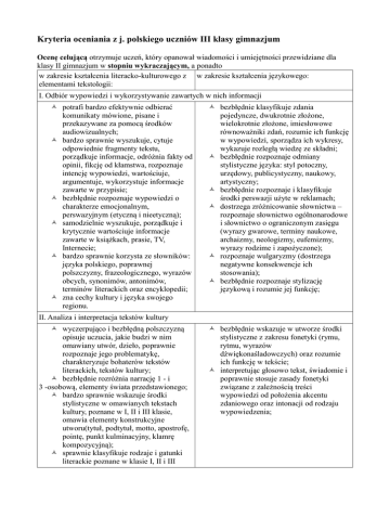 Kryteria oceniania z j. polskiego uczniów III klasy gimnazjum Ocenę celującą otrzymuje uczeń, który opanował wiadomości i umiejętności przewidziane dla klasy II gimnazjum w stopniu wykraczającym, a ponadto w zakresie kształcenia literacko-kulturowego z w zakresie kształcenia językowego: elementami tekstologii: I. Odbiór wypowiedzi i wykorzystywanie zawartych w nich informacji potrafi bardzo efektywnie odbierać komunikaty mówione, pisane i przekazywane za pomocą środków audiowizualnych; bardzo sprawnie wyszukuje, cytuje odpowiednie fragmenty tekstu, porządkuje informacje, odróżnia fakty od opinii, fikcję od kłamstwa, rozpoznaje intencję wypowiedzi, wartościuje, argumentuje, wykorzystuje informacje zawarte w przypisie; bezbłędnie rozpoznaje wypowiedzi o charakterze emocjonalnym, perswazyjnym (etyczną i nieetyczną); samodzielnie wyszukuje, porządkuje i krytycznie wartościuje informacje zawarte w książkach, prasie, TV, Internecie; bardzo sprawnie korzysta ze słowników: języka polskiego, poprawnej polszczyzny, frazeologicznego, wyrazów obcych, synonimów, antonimów, terminów literackich oraz encyklopedii; zna cechy kultury i języka swojego regionu. bezbłędnie klasyfikuje zdania pojedyncze, dwukrotnie złożone, wielokrotnie złożone, imiesłowowe równoważniki zdań, rozumie ich funkcję w wypowiedzi, sporządza ich wykresy, wykazuje rozległą wiedzę ze składni; bezbłędnie rozpoznaje odmiany stylistyczne języka: styl potoczny, urzędowy, publicystyczny, naukowy, artystyczny; bezbłędnie rozpoznaje i klasyfikuje środki perswazji użyte w reklamach; dostrzega zróżnicowanie słownictwa – rozpoznaje słownictwo ogólnonarodowe i słownictwo o ograniczonym zasięgu (wyrazy gwarowe, terminy naukowe, archaizmy, neologizmy, eufemizmy, wyrazy rodzime i zapożyczone); rozpoznaje wulgaryzmy (dostrzega negatywne konsekwencje ich stosowania); bezbłędnie rozpoznaje stylizację językową i rozumie jej funkcję; II. Analiza i interpretacja tekstów kultury wyczerpująco i bezbłędną polszczyzną opisuje uczucia, jakie budzi w nim omawiany utwór, dzieło, poprawnie rozpoznaje jego problematykę, charakteryzuje bohaterów tekstów literackich, tekstów kultury; bezbłędnie rozróżnia narrację 1 - i 3 -osobową, elementy świata przedstawionego; bardzo sprawnie wskazuje środki stylistyczne w omawianych tekstach kultury, poznane w I, II i III klasie, omawia elementy konstrukcyjne utworu(tytuł, podtytuł, motto, apostrofę, pointę, punkt kulminacyjny, klamrę kompozycyjną); sprawnie klasyfikuje rodzaje i gatunki literackie poznane w klasie I, II i III bezbłędnie wskazuje w utworze środki stylistyczne z zakresu fonetyki (rymu, rytmu, wyrazów dźwiękonaśladowczych) oraz rozumie ich funkcję w tekście; interpretując głosowo tekst, świadomie i poprawnie stosuje zasady fonetyki związane z zależnością treści wypowiedzi od położenia akcentu zdaniowego oraz intonacji od rodzaju wypowiedzenia; (przypowieść, pamiętnik, dziennik, komedię, balladę, hymn, powieść historyczną, powiastka filozoficzna, nowela, literatura faktu, opowiadanie, powieść obyczajowa, opowiadanie detektywistyczne, powieść fantasy, pieśń); sprawnie podaje wyznaczniki dramatu; sprawnie klasyfikuje gatunki publicystyczne (notatka prasowa, artykuł publicystyczny, reportaż prasowy, radiowy, telewizyjny, , sprawozdanie, wywiad), sprawnie podaje ich wyznaczniki, poprawnie i bez trudu wskazuje elementy kompozycyjne artykułu (lead, tytuł, podtytuł, nadtytuł, śródtekst, śródtytuł, wstęp, kolumna, szpalta, akapit), sprawnie omawia ich funkcję; analizując dzieło, sprawnie uwzględnia kontekst historyczny, biograficzny, kulturowy; pięknie i ze zrozumieniem interpretuje głosowo utwory literackie; omawia zagadnienia egzystencjalne takie jak: miłość, przyjaźń, śmierć, cierpienie, lęk, przemijanie, nadzieja, wiara, samotność, odmienność, solidarność, sprawiedliwość, wolność, niewola, utrata wartości, dostrzega wartości humanistyczne w omawianych tekstach kultury. III. Tworzenie wypowiedzi tworzy piękne, logiczne i spójne wypowiedzi na dany temat, zarówno ustne, jak i pisemne, zachowuje konwencję danego gatunku; nie popełnia błędów językowych, stylistycznych i ortograficznych; bezbłędnie redaguje: plan wydarzeń, notatkę, biogram, streszczenie, opowiadanie z dialogiem lub elementami opisu wewnętrznego, charakterystykę, autocharakterystykę, charakterystykę porównawczą, rozprawkę, podanie, życiorys, list, CV, instrukcję, opis dzieła sztuki, recenzję, referat, list motywacyjny, dedykację, artykuł; bezbłędnie redaguje tekst na komputerze, przestrzega zasad etyki mowy w różnych sytuacjach komunikacyjnych, a tworząc wypowiedzi, dąży do bardzo precyzyjnego wysławiania się , świadomie dobiera synonimy i antonimy, aby wyrazić zamierzone treści; bezbłędnie stosuje związki frazeologiczne – zna ich znaczenie, potrafi je poprawnie sklasyfikować; bezbłędnie stosuje zasady odmiany rzeczowników i czasowników (w tym imiesłowów); przeprowadza świadome zabiegi redakcyjne w tekście, wykorzystuje wiedzę ze składni do tworzenia zróżnicowanych konstrukcji składniowych, bezbłędnie stosuje zasady ortograficzne i interpunkcyjne; umiejętnie i poprawnie stosuje w swoich rozważaniach słownictwo z określonych korzystając z komunikatorów, dostrzega niebezpieczeństwa wynikające z używania Internetu; jest aktywnym uczestnikiem dyskusji, potrafi bronić swojego stanowiska, przyjąć poglądy innych, polemizować; IV. Teksty kultury bardzo dobrze zna wszystkie teksty kultury zawarte w podstawie programowej, realizowane w klasie III, potrafi się do nich odwołać, wypowiadając się na określony temat; posiada szeroką wiedzę na temat kultury, filozofii, literatury, architektury, rzeźby i malarstwa omawianych epok literackich (pozytywizmu, Młodej Polski, dwudziestolecia międzywojennego, II wojny ś