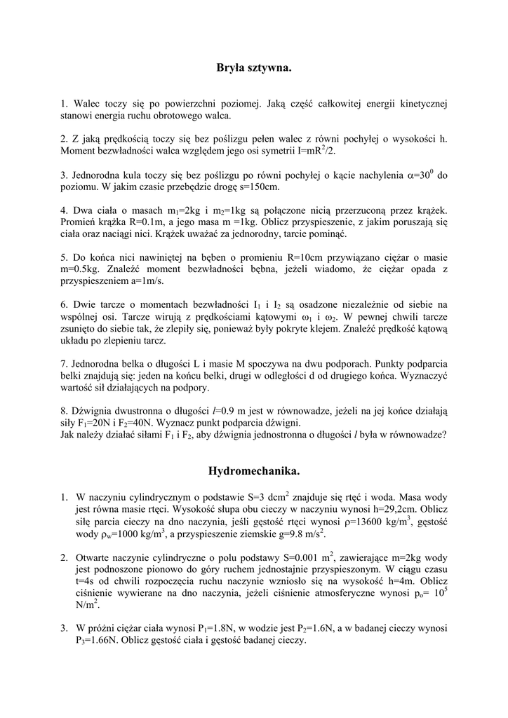 Bryła sztywna. 1. Walec toczy się po powierzchni poziomej. Jaką część całkowitej energii kinetycznej stanowi energia ruchu obrotowego walca. 2. Z jaką prędkością toczy się bez poślizgu pełen walec z równi pochyłej o wysokości h. Moment bezwładności walca względem jego osi symetrii I=mR2/2. 3. Jednorodna kula toczy się bez poślizgu po równi pochyłej o kącie nachylenia α=300 do poziomu. W jakim czasie przebędzie drogę s=150cm. 4. Dwa ciała o masach m1=2kg i m2=1kg są połączone nicią przerzuconą przez krążek. Promień krążka R=0.1m, a jego masa m =1kg. Oblicz przyspieszenie, z jakim poruszają się ciała oraz naciągi nici. Krążek uważać za jednorodny, tarcie pominąć. 5. Do końca nici nawiniętej na bęben o promieniu R=10cm przywiązano ciężar o masie m=0.5kg. Znaleźć moment bezwładności bębna, jeżeli wiadomo, że ciężar opada z przyspieszeniem a=1m/s. 6. Dwie tarcze o momentach bezwładności I1 i I2 są osadzone niezależnie od siebie na wspólnej osi. Tarcze wirują z prędkościami kątowymi ω1 i ω2. W pewnej chwili tarcze zsunięto do siebie tak, że zlepiły się, ponieważ były pokryte klejem. Znaleźć prędkość kątową układu po zlepieniu tarcz. 7. Jednorodna belka o długości L i masie M spoczywa na dwu podporach. Punkty podparcia belki znajdują się: jeden na końcu belki, drugi w odległości d od drugiego końca. Wyznaczyć wartość sił działających na podpory. 8. Dźwignia dwustronna o długości l=0.9 m jest w równowadze, jeżeli na jej końce działają siły F1=20N i F2=40N. Wyznacz punkt podparcia dźwigni. Jak należy działać siłami F1 i F2, aby dźwignia jednostronna o długości l była w równowadze? Hydromechanika. 1. W naczyniu cylindrycznym o podstawie S=3 dcm2 znajduje się rtęć i woda. Masa wody jest równa masie rtęci. Wysokość słupa obu cieczy w naczyniu wynosi h=29,2cm. Oblicz siłę parcia cieczy na dno naczynia, jeśli gęstość rtęci wynosi ρ=13600 kg/m3, gęstość wody ρw=1000 kg/m3, a przyspieszenie ziemskie g=9.8 m/s2. 2. Otwarte naczynie cylindryczne o polu podstawy S=0.001 m2, zawierające m=2kg wody jest podnoszone pionowo do góry ruchem jednostajnie przyspieszonym. W ciągu czasu t=4s od chwili rozpoczęcia ruchu naczynie wzniosło się na wysokość h=4m. Oblicz ciśnienie wywierane na dno naczynia, jeżeli ciśnienie atmosferyczne wynosi po= 105 N/m2. 3. W próżni ciężar ciała wynosi P1=1.8N, w wodzie jest P2=1.6N, a w badanej cieczy wynosi P3=1.66N. Oblicz gęstość ciała i gęstość badanej cieczy. 4. Na głębokości h=1 m poniżej poziomu wody o gęstości ρ1 =1000kg/m3 znajduje się kulka drewniana, której gęstość ρ=600 kg/m3. Kulkę tę puszczono. Na jaką wysokość wyskoczy kulka ponad poziom wody? Siły tarcia pominąć. 5. Kra lodowa o powierzchni S=0.3 m2 i jednakowej grubości pływa w wodzie, wynurzona na powierzchnię na wysokość h=2cm. Gęstość lodu ρl=900kg/m3,wody ρw=103kg/m3. Oblicz masę kry lodowej. 6. Ciało spada swobodnie w wodzie. W czasie t=2s ciało przebywa drogę h=9.8m. Oblicz gęstość ciała pomijając siłę tarcia wewnętrznego, gęstość wody ρw=1000kg/m3. Drgania. 1. Maksymalna prędkość punktu drgającego ruchem harmonicznym wynosi Vmax=2m/s, a maksymalne przyspieszenie amax=3.14m/s2. Napisać równanie ruchu tego punktu , jeżeli wiadomo, że faza początkowa φ=0. 2. Równanie ruchu punktu dane jest w postaci: x=sin(πt/6). Wyznaczyć chwile tv i ta, w których występuje maksymalna prędkość i maksymalne przyspieszenie. 3. Pozioma platforma wykonuje drgania o amplitudzie amplitudzie. Jaka może być maksymalna częstość drgań platformy, by leżące na niej ciało nie oderwało się? 4. Jak zmieni się okres drgań pionowych ciężaru wiszącego na dwóch jednakowych sprężynach, gdy połączenie szeregowe sprężyn zostanie zastąpione połączeniem równoległym? 5. Na poziomym doskonale gładkim stole leży, przymocowane sprężyną do ściany ciało o masie M. W ciało to trafia pocisk o masie m lecący poziomo z prędkością V i zostaje w nim. Po zderzeniu ciało wraz z pociskiem wykonuje drgania harmoniczne z amplitudą A. Wyznaczyć częstość tych drgań. 6. Z jakim przyspieszeniem winda opadała w dół, jeżeli okres drgań wahadła matematycznego zwiększył się o 1/3 w stosunku do okresu mierzonego w nieruchomej windzie? 7. Oblicz okres drgań tarczy (traktowanej jako wahadło fizyczne), którą oś obrotu przebija w połowie promienia R. 8. W jaki sposób energia kinetyczna w ruchu harmonicznym zależy od wychylenia z położenia równowagi?