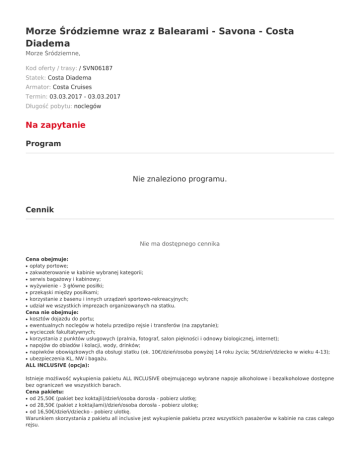 Morze Śródziemne wraz z Balearami - Savona - Costa Diadema Morze Śródziemne, Kod oferty / trasy: / SVN06187 Statek: Costa Diadema Armator: Costa Cruises Termin: 03.03.2017 - 03.03.2017 Długość pobytu: noclegów Na zapytanie Program Nie znaleziono programu. Cennik Nie ma dostępnego cennika Cena obejmuje: opłaty portowe; zakwaterowanie w kabinie wybranej kategorii; serwis bagażowy i kabinowy; wyżywienie - 3 główne posiłki; przekąski między posiłkami; korzystanie z basenu i innych urządzeń sportowo-rekreacyjnych; udział we wszystkich imprezach organizowanych na statku. Cena nie obejmuje: kosztów dojazdu do portu; ewentualnych noclegów w hotelu przed/po rejsie i transferów (na zapytanie); wycieczek fakultatywnych; korzystania z punktów usługowych (pralnia, fotograf, salon piękności i odnowy biologicznej, internet); napojów do obiadów i kolacji, wody, drinków; napiwków obowiązkowych dla obsługi statku (ok. 10€/dzień/osoba powyżej 14 roku życia; 5€/dzień/dziecko w wieku 4-13); ubezpieczenia KL, NW i bagażu. ALL INCLUSIVE (opcja): ● ● ● ● ● ● ● ● ● ● ● ● ● ● Istnieje możliwość wykupienia pakietu ALL INCLUSIVE obejmującego wybrane napoje alkoholowe i bezalkoholowe dostępne bez ograniczeń we wszystkich barach. Cena pakietu: od 25,50€ (pakiet bez koktajli)/dzień/osoba dorosła - pobierz ulotkę; od 28,50€ (pakiet z koktajlami)/dzień/osoba dorosła - pobierz ulotkę; od 16,50€/dzień/dziecko - pobierz ulotkę. Warunkiem skorzystania z pakietu all inclusive jest wykupienie pakietu przez wszystkich pasażerów w kabinie na czas całego rejsu. ● ● ● Dla Rejsów trwających mniej niż 7 dni nie ma możliwości wykupienia pakietu all inclisive. Linia Costa Cruises proponuje pakiety winno-piwne, pakiety wodne (szczegóły u Konsultanta). Uwagi: Kabiny 3/4 osobowe nie są dostępne we wszystkich kategoriach, a ich liczba jest ograniczona - sprzedaż tylko po potwierdzeniu; ceny wycieczek fakultatywnych, propozycje dojazdu do portu, hoteli przed/po rejsie na zapytanie. Na pokładzie statku obowiązuje bezgotówkowy system opłat. Należność reguluje się ostatniego dnia rejsu gotówką (wpłata depozytu ok. 250€/kabina pierwszego dnia rejsu) lub kartą kredytową (VISA, Mastercard, American Express) na podstawie zbiorczego rachunku. Karty kredytowe należy zarejestrować zaraz po zaokrętowaniu. Opublikowane informacje nie stanowią oferty handlowej w rozumieniu kodeksu cywilnego