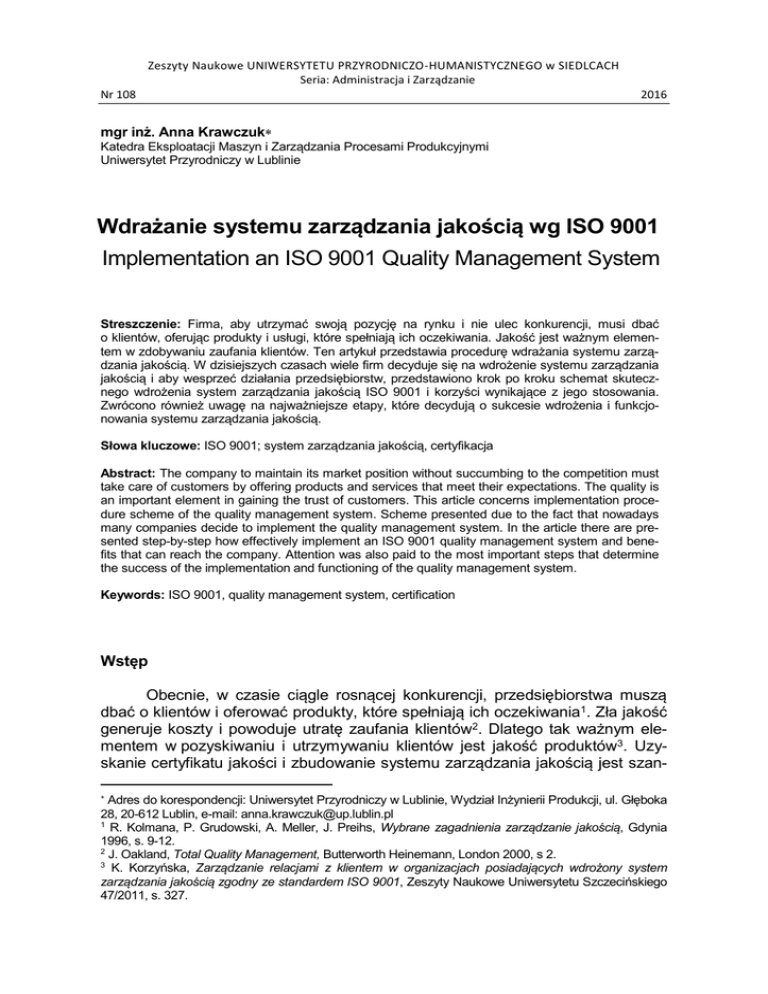 Zeszyty Naukowe UNIWERSYTETU PRZYRODNICZO-HUMANISTYCZNEGO w SIEDLCACH Seria: Administracja i Zarządzanie Nr 108 2016 mgr inż. Anna Krawczuk Katedra Eksploatacji Maszyn i Zarządzania Procesami Produkcyjnymi Uniwersytet Przyrodniczy w Lublinie Wdrażanie systemu zarządzania jakością wg ISO 9001 Implementation an ISO 9001 Quality Management System Streszczenie: Firma, aby utrzymać swoją pozycję na rynku i nie ulec konkurencji, musi dbać o klientów, oferując produkty i usługi, które spełniają ich oczekiwania. Jakość jest ważnym elementem w zdobywaniu zaufania klientów. Ten artykuł przedstawia procedurę wdrażania systemu zarządzania jakością. W dzisiejszych czasach wiele firm decyduje się na wdrożenie systemu zarządzania jakością i aby wesprzeć działania przedsiębiorstw, przedstawiono krok po kroku schemat skutecznego wdrożenia system zarządzania jakością ISO 9001 i korzyści wynikające z jego stosowania. Zwrócono również uwagę na najważniejsze etapy, które decydują o sukcesie wdrożenia i funkcjonowania systemu zarządzania jakością. Słowa kluczowe: ISO 9001; system zarządzania jakością, certyfikacja Abstract: The company to maintain its market position without succumbing to the competition must take care of customers by offering products and services that meet their expectations. The quality is an important element in gaining the trust of customers. This article concerns implementation procedure scheme of the quality management system. Scheme presented due to the fact that nowadays many companies decide to implement the quality management system. In the article there are presented step-by-step how effectively implement an ISO 9001 quality management system and benefits that can reach the company. Attention was also paid to the most important steps that determine the success of the implementation and functioning of the quality management system. Keywords: ISO 9001, quality management system, certification Wstęp Obecnie, w czasie ciągle rosnącej konkurencji, przedsiębiorstwa muszą dbać o klientów i oferować produkty, które spełniają ich oczekiwania1. Zła jakość generuje koszty i powoduje utratę zaufania klientów2. Dlatego tak ważnym elementem w pozyskiwaniu i utrzymywaniu klientów jest jakość produktów3. Uzyskanie certyfikatu jakości i zbudowanie systemu zarządzania jakością jest szan Adres do korespondencji: Uniwersytet Przyrodniczy w Lublinie, Wydział Inżynierii Produkcji, ul. Głęboka 28, 20-612 Lublin, e-mail: [email protected] 1 R. Kolmana, P. Grudowski, A. Meller, J. Preihs, Wybrane zagadnienia zarządzanie jakością, Gdynia 1996, s. 9-12. 2 J. Oakland, Total Quality Management, Butterworth Heinemann, London 2000, s 2. 3 K. Korzyńska, Zarządzanie relacjami z klientem w organizacjach posiadających wdrożony system zarządzania jakością zgodny ze standardem ISO 9001, Zeszyty Naukowe Uniwersytetu Szczecińskiego 47/2011, s. 327. 164 A. Krawczuk są na zdobycie nowych klientów i poszerzenie rynku zbytu 4. Takie organizacje są również lepiej postrzegane na rynku i mają większe szanse podczas przetargów na realizację dużych zamówień5. Przedsiębiorstwa, które wdrażają systemy jakości, decydują się na to z różnych przyczyn, które w znacznej mierze zależą zarówno od specyfiki, jak i branży czy rynku, na którym funkcjonuje przedsiębiorstwo. Firmy zainspirowane sukcesami i korzyściami ekonomicznymi, jakie odnosiły pierwsze przedsiębiorstwa wdrażające systemy zarządzania jakością, coraz intensywniej zaczęły interesować się korzyściami z funkcjonowania takiego systemu. Główną przyczyną wprowadzania sytemu ISO 9001 były i nadal są korzyści ekonomiczne, jakie można osiągnąć poprzez usprawnienie organizacji i działań przedsiębiorstwa6. Obecnie można wyróżnić wiele innych zalet z wprowadzenia i funkcjonowania systemu, do których możemy zaliczyć7: – zmniejszenie kosztów braków, – zmniejszenie kosztów kontroli jakości, – lepsze kontakty z klientami i dostawcami, – większe zaufanie ze strony klientów, – uzyskanie przewagi konkurencyjnej, – efektywniejsze zarządzanie zasobami materialnymi, – lepszą organizację pracy, – poprawienie i ujednolicenie obiegu dokumentacji, – podniesienie morale pracowników. Należy zauważyć, że samo zdobycie certyfikatu nie jest elementem pozwalającym na utrzymanie się na rynku w dłuższym okresie. Aby osiągnąć pełny sukces, należy zrozumieć ideę systemu jakości. Wdrażanie ISO 9001 System zarządzania jakością oparty na normie ISO 9001 dotyczy zarządzania organizacją i jej działaniami. Niezależnie od profilu działalności system ten może funkcjonować w każdym przedsiębiorstwie, którego celem jest zaspokajanie potrzeb klientów. Należy jednak pamiętać, że nie w każdej firmie proces ten będzie przebiegał w jednakowy sposób, a na efektywność wdrożenia systemu zarządzania jakością wpływa aktualny poziom zarządzania w danej organizacji oraz zaangażowanie wszystkich pracowników. Oczywiście z wdrożeniem systemu wiąże się konieczność poniesienia określonych nakładów. Organizacje z chęci ograniczenia kosztów decydują się na zmniejszenie ilości szkoleń lub na zaangażowanie konsultantów w proces tworzenia dokumentacji systemowej. Podejmując decyzję o wdrożeniu systemu zarządzania, należy uświadomić wszystkim pracownikom celowość tego działania. Niedoinformowanie pracowniT. Sikora, Zarządzanie jakością według norm ISO serii 9000:2000, Kraków 2005, s. 7, 45. S. Wawak, Zarządzanie jakością. Teoria i praktyka, Wydawnictwo Helion, Gliwice 2002, s. 12. 6 J. Kowalczyk, A. Jabłoński, S. Wawak, Poradnik wdrażania systemu zarządzania jakością zgodnego z ISO 9001, <http://humanms.eu/images/stories/Artykuy/Poradnik_ISO_9001.pdf>, 14.10.2014 s. 6, 11, 38-39, 27-29, 30. 7 H. Wyrębek, Uwarunkowania procesu wdrażania systemu zarządzania jakości