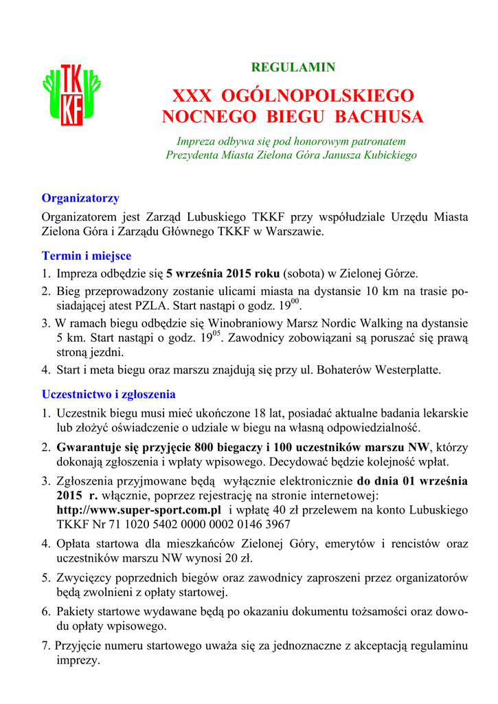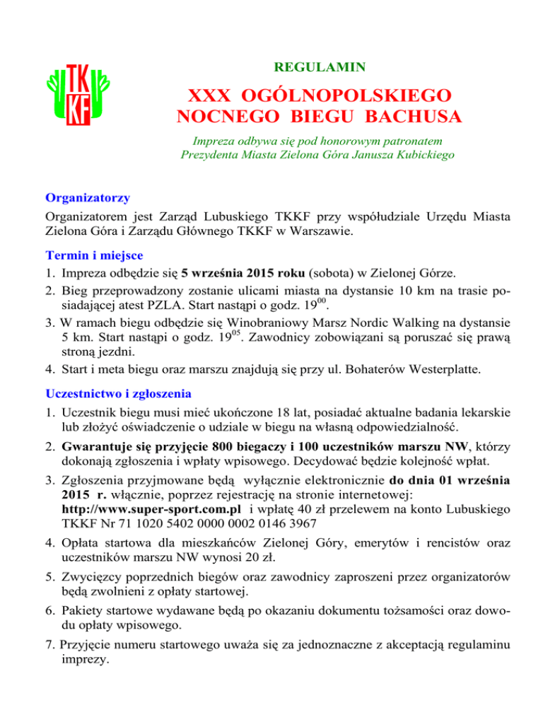 REGULAMIN XXX OGÓLNOPOLSKIEGO NOCNEGO BIEGU BACHUSA Impreza odbywa się pod honorowym patronatem Prezydenta Miasta Zielona Góra Janusza Kubickiego Organizatorzy Organizatorem jest Zarząd Lubuskiego TKKF przy współudziale Urzędu Miasta Zielona Góra i Zarządu Głównego TKKF w Warszawie. Termin i miejsce 1. Impreza odbędzie się 5 września 2015 roku (sobota) w Zielonej Górze. 2. Bieg przeprowadzony zostanie ulicami miasta na dystansie 10 km na trasie posiadającej atest PZLA. Start nastąpi o godz. 1900. 3. W ramach biegu odbędzie się Winobraniowy Marsz Nordic Walking na dystansie 5 km. Start nastąpi o godz. 1905. Zawodnicy zobowiązani są poruszać się prawą stroną jezdni. 4. Start i meta biegu oraz marszu znajdują się przy ul. Bohaterów Westerplatte. Uczestnictwo i zgłoszenia 1. Uczestnik biegu musi mieć ukończone 18 lat, posiadać aktualne badania lekarskie lub złożyć oświadczenie o udziale w biegu na własną odpowiedzialność. 2. Gwarantuje się przyjęcie 800 biegaczy i 100 uczestników marszu NW, którzy dokonają zgłoszenia i wpłaty wpisowego. Decydować będzie kolejność wpłat. 3. Zgłoszenia przyjmowane będą wyłącznie elektronicznie do dnia 01 września 2015 r. włącznie, poprzez rejestrację na stronie internetowej: http://www.super-sport.com.pl i wpłatę 40 zł przelewem na konto Lubuskiego TKKF Nr 71 1020 5402 0000 0002 0146 3967 4. Opłata startowa dla mieszkańców Zielonej Góry, emerytów i rencistów oraz uczestników marszu NW wynosi 20 zł. 5. Zwycięzcy poprzednich biegów oraz zawodnicy zaproszeni przez organizatorów będą zwolnieni z opłaty startowej. 6. Pakiety startowe wydawane będą po okazaniu dokumentu tożsamości oraz dowodu opłaty wpisowego. 7. Przyjęcie numeru startowego uważa się za jednoznaczne z akceptacją regulaminu imprezy. Klasyfikacje 1. Prowadzone będą indywidualne klasyfikacje generalne kobiet i mężczyzn oraz w kategoriach wiekowych: Mężczyźni Kobiety M 20 – 18–29 lat (1997-1986) K 20 – 18–29 lat (1997-1986) M 30 – 30–39 lat (1985-1976) K 30 – 30–39 lat (1985-1976) M 40 – 40–49 lat (1975-1966) K 40 – 40–49 lat (1973-1966) M 50 – 50–59 lat (1965-1956) K 50 – 50 lat i powyżej (od 1965) M 60 – 60–69 lat (1955-1946) M 70 – 70 i więcej lat (od 1945) 2. Nie będzie prowadzona klasyfikacja indywidualna w marszu Nordic Walking. Osiągnięte czasy mają znaczenie jedynie informacyjne. Nagrody 1. Zawodnicy, którzy w klasyfikacjach generalnych mężczyzn i kobiet zajmą trzy czołowe miejsca otrzymają puchary Prezydenta Miasta Zielona Góra. 2. Zawodnicy, którzy zajmą trzy czołowe miejsca w poszczególnych kategoriach wiekowych otrzymają medale i nagrody rzeczowe. 3. Najlepszy Zielonogórzanin i najlepsza Zielonogórzanka otrzymają puchary Przewodniczącego Rady Miasta Zielona Góra. 4. Najstarszy zawodnik, który ukończy bieg, otrzyma nagrodę specjalną. 5. Zawodnik, który zajmie 13 miejsce w klasyfikacji generalnej otrzyma „upominek pocieszenia”. 6. Wśród uczestników marszu zostaną rozlosowane upominki rzeczowe. 6. Wszyscy uczestnicy biegu i marszu otrzymają pamiątkowe medale. Finansowanie 1. Koszty związane z przeprowadzeniem imprezy pokrywają organizatorzy. 2. Zawodnicy przyjeżdżają na koszt własny lub organizacji delegującej. Postanowienia końcowe 1. Uczestnicy biegu nie będą ubezpieczeni od następstw nieszczęśliwych wypadków. 2. Organizatorzy zapewnią opiekę lekarską, szatnie oraz napoje na mecie. 3. Uczestników obowiązuje strój oraz obuwie sportowe w czasie biegu oraz w trakcie dekoracji. 4. Organizatorzy nie będą odpowiadali za przedmioty pozostawione bez zabezpieczenia lub skradzione podczas imprezy. 5. Prawo interpretacji niniejszego regulaminu przysługuje organizatorom. Organizatorzy