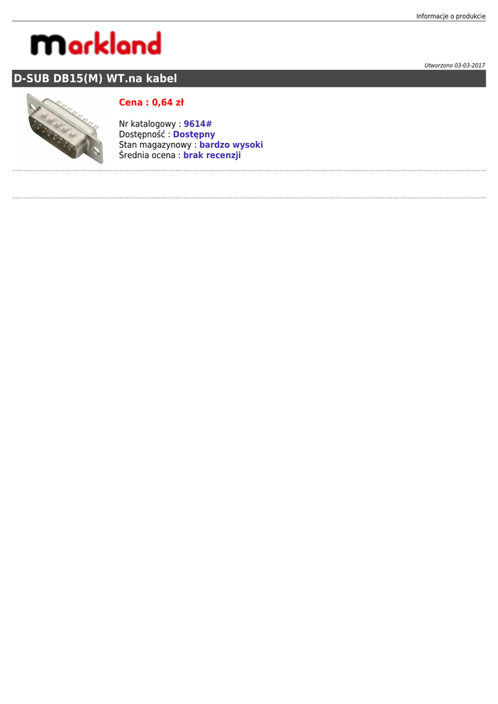 Informacje o produkcie Utworzono 03-03-2017 D-SUB DB15(M) WT.na kabel Cena : 0,64 zł Nr katalogowy : 9614# Dostępność : Dostępny Stan magazynowy : bardzo wysoki Średnia ocena : brak recenzji