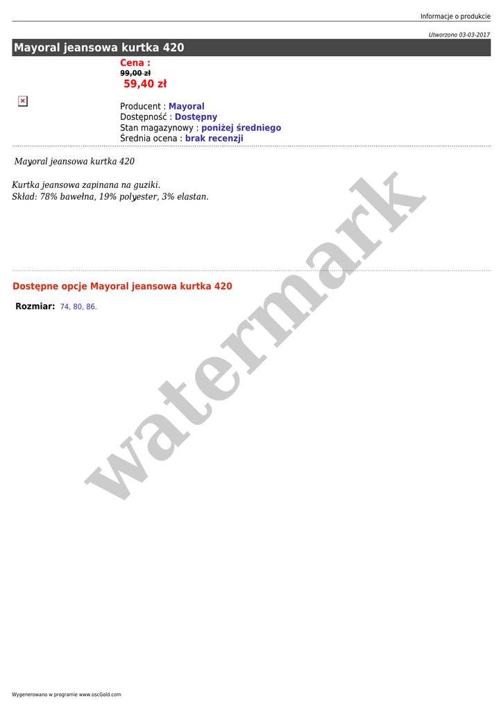 Informacje o produkcie Utworzono 03-03-2017 Mayoral jeansowa kurtka 420 Cena : 99,00 zł 59,40 zł Producent : Mayoral Dostępność : Dostępny Stan magazynowy : poniżej średniego Średnia ocena : brak recenzji Mayoral jeansowa kurtka 420 er m ar k Kurtka jeansowa zapinana na guziki. Skład: 78% bawełna, 19% polyester, 3% elastan. Dostępne opcje Mayoral jeansowa kurtka 420 w at Rozmiar: 74, 80, 86. Wygenerowano w programie www.oscGold.com