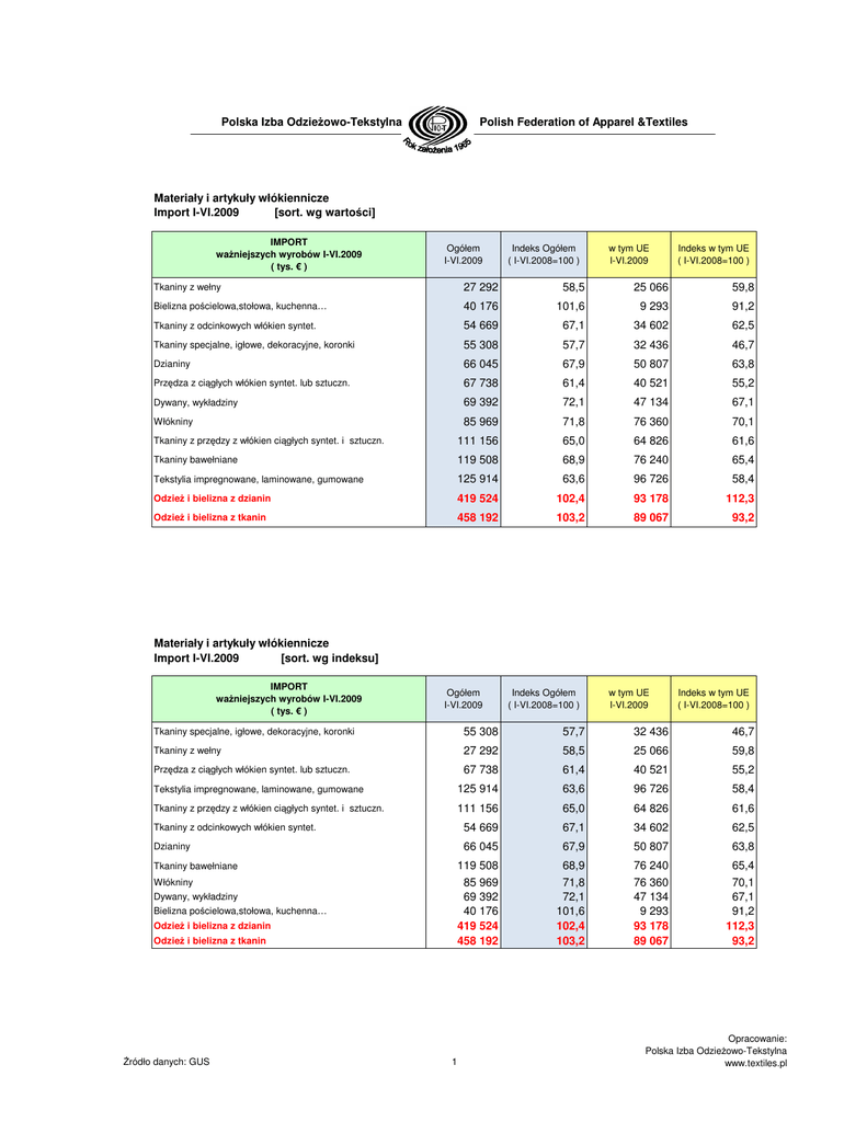 Polska Izba OdzieŜowo-Tekstylna Polish Federation of Apparel &Textiles Materiały i artykuły włókiennicze Import I-VI.2009 [sort. wg wartości] IMPORT waŜniejszych wyrobów I-VI.2009 ( tys. € ) Ogółem I-VI.2009 Indeks Ogółem ( I-VI.2008=100 ) w tym UE I-VI.2009 Indeks w tym UE ( I-VI.2008=100 ) Tkaniny z wełny 27 292 58,5 25 066 59,8 Bielizna pościelowa,stołowa, kuchenna… 40 176 101,6 9 293 91,2 Tkaniny z odcinkowych włókien syntet. 54 669 67,1 34 602 62,5 Tkaniny specjalne, igłowe, dekoracyjne, koronki 55 308 57,7 32 436 46,7 Dzianiny 66 045 67,9 50 807 63,8 Przędza z ciągłych włókien syntet. lub sztuczn. 67 738 61,4 40 521 55,2 Dywany, wykładziny 69 392 72,1 47 134 67,1 85 969 71,8 76 360 70,1 Tkaniny z przędzy z włókien ciągłych syntet. i sztuczn. 111 156 65,0 64 826 61,6 Tkaniny bawełniane 119 508 68,9 76 240 65,4 Tekstylia impregnowane, laminowane, gumowane 125 914 63,6 96 726 58,4 OdzieŜ i bielizna z dzianin 419 524 102,4 93 178 112,3 OdzieŜ i bielizna z tkanin 458 192 103,2 89 067 93,2 Włókniny Materiały i artykuły włókiennicze Import I-VI.2009 [sort. wg indeksu] IMPORT waŜniejszych wyrobów I-VI.2009 ( tys. € ) Ogółem I-VI.2009 Indeks Ogółem ( I-VI.2008=100 ) w tym UE I-VI.2009 Indeks w tym UE ( I-VI.2008=100 ) Tkaniny specjalne, igłowe, dekoracyjne, koronki 55 308 57,7 32 436 46,7 Tkaniny z wełny 27 292 58,5 25 066 59,8 Przędza z ciągłych włókien syntet. lub sztuczn. 67 738 61,4 40 521 55,2 Tekstylia impregnowane, laminowane, gumowane 125 914 63,6 96 726 58,4 Tkaniny z przędzy z włókien ciągłych syntet. i sztuczn. 111 156 65,0 64 826 61,6 54 669 67,1 34 602 62,5 66 045 67,9 50 807 63,8 119 508 85 969 69 392 40 176 419 524 458 192 68,9 71,8 72,1 101,6 102,4 103,2 76 240 76 360 47 134 9 293 93 178 89 067 65,4 70,1 67,1 91,2 112,3 93,2 Tkaniny z odcinkowych włókien syntet. Dzianiny Tkaniny bawełniane Włókniny Dywany, wykładziny Bielizna pościelowa,stołowa, kuchenna… OdzieŜ i bielizna z dzianin OdzieŜ i bielizna z tkanin Źródło danych: GUS 1 Opracowanie: Polska Izba OdzieŜowo-Tekstylna www.textiles.pl Import waŜniejszych towarów I-VI.2009 [ tys € ] 458 192 OdzieŜ i bielizna z tkanin 419 524 OdzieŜ i bielizna z dzianin Tekstylia impregnowane, laminowane, gumowane 125 914 Tkaniny bawełniane 119 508 Tkaniny z przędzy z włókien ciągłych syntet. i sztuczn. 111 156 85 969 Włókniny Dywany, wykładziny 69 392 Przędza z ciągłych włókien syntet. lub sztuczn. 67 738 Dzianiny 66 045 Tkaniny specjalne, igłowe, dekoracyjne, koronki 55 308 Tkaniny z odcinkowych włókien syntet. 54 669 40 176 Bielizna pościelowa,stołowa, kuchenna… 27 292 Tkaniny z wełny Indeks importu waŜniejszych towarów I-VI.2009 [I-VI.2008=100; tys.€ ] OdzieŜ i bielizna z tkanin 103,2 OdzieŜ i bielizna z dzianin 102,4 Bielizna pościelowa,stołowa, kuchenna… 101,6 Dywany, wykładziny 72,1 Włókniny 71,8 Tkaniny bawełniane 68,9 Dzianiny 67,9 Tkaniny z odcinkowych włókien syntet. 67,1 Tkaniny z przędzy z włókien ciągłych syntet. i sztuczn. 65,0 Tekstylia impregnowane, laminowane, gumowane 63,6 61,4 Przędza z ciągłych włókien syntet. lub sztuczn. Tkaniny z wełny 58,5 Tkaniny specjalne, igłowe, dekoracyjne, koronki 57,7 0 Źródło danych: GUS 2 100 Opracowanie: Polska Izba OdzieŜowo-Tekstylna www.textiles.pl
