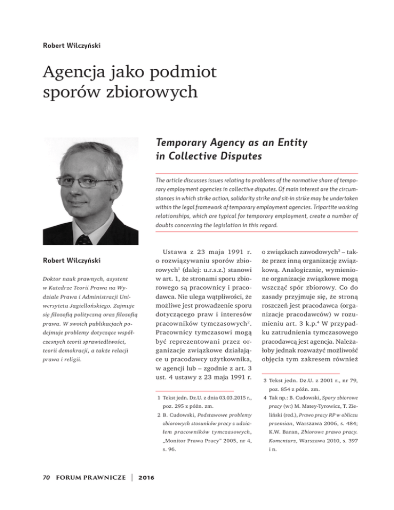 Robert Wilczyński Agencja jako podmiot sporów zbiorowych Temporary Agency as an Entity in Collective Disputes The article discusses issues relating to problems of the normative share of temporary employment agencies in collective disputes. Of main interest are the circumstances in which strike action, solidarity strike and sit-in strike may be undertaken within the legal framework of temporary employment agencies. Tripartite working relationships, which are typical for temporary employment, create a number of doubts concerning the legislation in this regard. Robert Wilczyński Doktor nauk prawnych, asystent w Katedrze Teorii Prawa na Wy- dziale Prawa i Administracji Uni- wersytetu Jagiellońskiego. Zajmuje się filozofią polityczną oraz filozofią prawa. W swoich publikacjach po- dejmuje problemy dotyczące współczesnych teorii sprawiedliwości, teorii demokracji, a także relacji prawa i religii. Ustawa z 23 maja 1991 r. o rozwiązywaniu sporów zbiorowych1 (dalej: u.r.s.z.) stanowi w art. 1, że stronami sporu zbiorowego są pracownicy i pracodawca. Nie ulega wątpliwości, że możliwe jest prowadzenie sporu dotyczącego praw i interesów pracowników tymczasowych 2 . Pracownicy tymczasowi mogą być reprezentowani przez organizacje związkowe działające u pracodawcy użytkownika, w agencji lub – zgodnie z art. 3 ust. 4 ustawy z 23 maja 1991 r. o związkach zawodowych3 – także przez inną organizację związkową. Analogicznie, wymienione organizacje związkowe mogą wszcząć spór zbiorowy. Co do zasady przyjmuje się, że stroną roszczeń jest pracodawca (organizacje pracodawców) w rozumieniu art. 3 k.p.4 W przypadku zatrudnienia tymczasowego pracodawcą jest agencja. Należałoby jednak rozważyć możliwość objęcia tym zakresem również 1 Tekst jedn. Dz.U. z dnia 03.03.2015 r., 4 Tak np.: B. Cudowski, Spory zbiorowe 3 Tekst jedn. Dz.U. z 2001 r., nr 79, poz. 854 z późn. zm. poz. 295 z późn. zm. 70 FORUM PR AWNICZE | 2016 pracy (w:) M. Matey-Tyrowicz, T. Zie- 2 B. Cudowski, Podstawowe problemy liński (red.), Prawo pracy RP w obliczu zbiorowych stosunków pracy z udzia- przemian, Warszawa 2006, s. 484; łem pracowników t ymczasowych, K.W. Baran, Zbiorowe prawo pracy. „Monitor Prawa Pracy” 2005, nr 4, Komentarz, Warszawa 2010, s. 397 s. 96. i n. prace drobne pracodawcę użytkownika. W literaturze dopuszcza się taką możliwość5. W pewnym zakresie takie podejście wpisuje się w postulaty strony związkowej zmierzające do pełnej synchronizacji prawa krajowego ze standardami MOP 6, poprzez dążenie do szerokiego ujęcia podmiotu sporu w ustawie o rozwiązywaniu sporów zbiorowych, tak aby strona pracownicza kierowała roszczenia wobec pracodawcy rzeczywistego. dzielnego zatrudniania pracowników oraz nawiązywania i rozwiązywania z nimi stosunku pracy8. Drugim argumentem na potwierdzenie tej tezy są względy praktyczne, ponieważ bez ścisłej współpracy agencji i pracodawcy użytkownika prowadzenie sporu zbiorowego oraz ewentualne jego rozwiązanie byłoby utrudnione. Przykładem to ilustrującym jest wymóg przeprowadzenia w oparciu o art. 20 u.r.s.z. referendum przedstrajkowego, w którym wy- Pracownicy tymczasowi mogą być reprezentowani przez organizacje związkowe działające u pracodawcy użytkownika, w agencji lub – zgodnie z art. 3 ust. 4 ustawy z 23 maja 1991 r. o związkach zawodowych – także przez inną organizację związkową. W konsekwencji przyjęcia dopuszczalności objęcia pracodawców użytkowników zakresem pojęcia pracodawcy użytym w u.r.s.z. konieczne jest rozważenie, czy po stronie pracodawczej mogłyby wystąpić oba podmioty zatrudniające pracowników tymczasowych. Żaden przepis u.r.s.z tego wprost nie zabrania7. Taką dopuszczalność potwierdza pośrednio także Sąd Najwyższy, przyjmując, że pracodawcą jest jednostka organizacyjna uprawniona do samo- magane jest uzyskanie zgody większości głosujących pracowników, jeżeli w głosowaniu wzięło udział co najmniej 50% pracowników zakładu pracy. Zgodnie z utrwalonym poglądem literatury 9 oraz orzecznictwa SN10 referendum strajkowe powinno być prze8 Zob. Uchwała SN z dnia 16.11.1977 roku, I PZP 47/77, OSPiKA 1979, z. 7–8, poz. 125 z glosą M. Piekarskiego. Zob. też glosę J. Brola: „Praca i Zabezpieczenie Społeczne” 1980, nr 7, s. 50. 9 M. Kurzynoga, Warunki legalności strajku, Warszawa 2011, s. 202–203; K.W. Baran, Zbiorowe prawo…, dz. cyt., s. 458– 5 B. Cudowski, Podstawowe problemy…, dz. cyt., s. 96; K.W. Ba- 459; E. Wronikowska, Problemy prawnej regulacji rozwią- ran, Zatrudnienie tymczasowe a zbiorowe prawo pracy (w:) zywania sporów zbiorowych na tle praktyki (w:) Jedność A. Sobczyk (red.), Z problematyki zatrudnienia tymczasowego, w różnorodności. Studia z zakresu prawa pracy, zabezpieczenia Warszawa 2011, s. 35 i n. społecznego i polityki społecznej. Księga pamiątkowa dedy- 6 Szerzej na ten temat por. E. Podgórska-Rakiel, Konieczność kowana Profesorowi Wojciechowi Muszalskiemu, Warszawa nowelizacji prawa polskiego w kwestii wolności związkowych 2009, s. 288–289. Odrębny pogląd prezentował H. Lewan- z perspektywy Międzynarodowej Organizacji Pracy, „Monitor dowski, Komentarz do ustawy o rozwiązywaniu sporów zbio- Prawa Pracy” 2014, nr 10, s. 510 i n. rowych (w:) Z. Salwa (red.), Prawo pracy, Warszawa 1998, 7 Por. A.M. Świątkowski, Komentarz do art. 2 (w:) J. Wratny, K. Walczak, Zbiorowe prawo pracy. Komentarz, Warszawa 2009, s. 296 i n. t. 3, s. III/E/158–57. 10Zob. teza 2 wyroku z dnia 7.03.2013 r. I PK 216/12, OSNP 2014/2/21. 2016 | FORUM PR AWNICZE 71 prace drobne prowadzone z uwzględnieniem liczby wszystkich pracowników zakładu pracy. W przypadku agencji zatrudniającej pracowników wykonujących pracę u różnych pracodawców użytkowników praktyczna realizacja tego wymogu wydaje się iluzoryczna. Nie wykluczając możliwości prowadzenia sporów zbiorowych z agencjami, można stwi