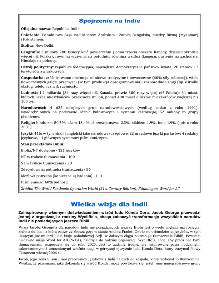 Spojrzenie na Indie Oficjalna nazwa: Republika Indii. Położenie: Południowa Azja, nad Morzem Arabskim i Zatoką Bengalską, między Birmą (Myanmar) i Pakistanem. Stolica: New Delhi. Geografia: 3 miliony 280 tysięcy km² powierzchni (jedna trzecia obszaru Kanady, dziesięciokrotnie więcej niż Polska); równina wyżynna na południu, równina wzdłuż Gangesu, pustynie na zachodzie, Himalaje na północy. Ustrój polityczny: republika federacyjna; największe demokratyczne państwo świata; 28 stanów i 7 terytoriów związkowych. Gospodarka: zróżnicowana; obejmuje rolnictwo tradycyjne i nowoczesne (60% siły roboczej), wiele nowoczesnych gałęzi przemysłu (w tym produkcja oprogramowania); różnorodne usługi (np. ośrodki obsługi telefonicznej); rzemiosło. Ludność: 1,1 miliarda (34 razy więcej niż Kanada, prawie 300 razy więcej niż Polska); 31 miast, których liczba mieszkańców przekracza milion, ponad 400 miast o liczbie mieszkańców większej niż 100 tys. Narodowości: 4 635 odrębnych grup narodowościowych (według badań z roku 1991), wyodrębnionych na podstawie różnic kulturowych i systemu kastowego; 52 miliony to grupy plemienne. Religie: hinduizm 80,5%, islam 13,4%, chrześcijaństwo 2,3%, sikhizm 1,9%, inne 1,9% (spis z roku 2001). Języki: 416; w tym hindi i angielski jako narodowe/urzędowe, 22 urzędowe języki pariasów; 4 rodziny językowe, 11 głównych systemów piśmienniczych. Stan przekładów Biblii: Biblia/NT dostępne - 121 języków NT w trakcie tłumaczenia - 100 ST w trakcie tłumaczenia - 28 Zdecydowana potrzeba tłumaczenia - 56 Możliwa potrzeba (konieczne są badania) - 111 Piśmienność: 60% ludności. Źródło: The World Factbook; Operation World (21st Century Edition); Ethnologue, Word for All Wielka wizja dla Indii Zainspirowany własnym doświadczeniem wśród ludu Konda Dora, Jacob George przewodzi jednej z organizacji z rodziny Wycliffe’a, chcąc zobaczyć transformację wszystkich narodów Indii nie posiadających jeszcze Biblii. Wizja Jacoba George’a dla narodów Indii nie posiadających jeszcze Biblii jest o wiele większa niŜ rozległa, zielona dolina, na którą patrzy ze zbocza góry w stanie Andhra Pradeś. Około sto osiemdziesiąt języków, w tym liczącym juŜ miliard ludzi kraju południowej Azji, w dalszym ciągu potrzebuje tłumaczenia Biblii. Powstała niedawno misja Word for All (WFA), naleŜąca do rodziny organizacji Wycliffe’a, chce, aby praca nad tymi tłumaczeniami rozpoczęła się do roku 2025. Jest to zadanie trudne, ale inspirowane pasją i oddaniem, zakorzenionymi i umocnionymi właśnie tutaj, w górzystej ojczyźnie ludu Konda Dora, który otrzymał Nowy Testament wiosną 2006 r. Jacob, jego Ŝona Susan i inni pracownicy językowi z Indii naleŜeli do zespołu, który wykonał to tłumaczenie. Wiedzą, Ŝe przemiana, jaka dokonała się wśród Konda, moŜe powtórzyć się, jeŜeli inne mniejszościowe grupy językowe otrzymają Słowo BoŜe. Jako przykład Jacob wskazuje na wioskę połoŜoną na górskim grzbiecie. MruŜymy oczy i wpatrujemy się w przepiękną, pokrytą lasem dolinę tuŜ obok Laxmipuram, jakieś sto kilometrów od Visakhapatnam. Jacob wyjaśnia, Ŝe ewangeliści docierali do tego narodu w przeszłości, jednak nie odnosili wielkich sukcesów. Wszystko zaczęło się zmieniać, gdy podczas dedykacji Nowego Testamentu dla ludu Konda, jeden z potrafiących czytać ludzi z tej wioski kupił Biblię, zabrał ją do domu i wieczorami zwoływał mieszkańców na wspólne czytanie. Jacob kontynuuje: „W czasie krótszym niŜ cztery miesiące niemal cała wioska postanowiła pójść za Jezusem. Sami załoŜyli kościół. Zupełnie sami – my nie zrobiliśmy nic! To pokazuje, w jaki sposób samo Pismo Święte moŜe zmieniać ludzi”. Ewangeliści z ludu Konda, wyposaŜeni w BoŜe Słowo w swoim języku, doprowadzili do powstania grupy wierzących w sąsiedniej wiosce. Chrześcijanie z tych dwóch wiosek połączyli się tworząc jeden kościół. Dzisiaj liderem tej grupy jest były szaman, który został pastorem. Biały budynek kościoła, połoŜony przy wznoszącej się w górę drodze, widocznej z naszego punktu obserwacyjnego, lśnił w promieniach porannego słońca (patrz zdjęcie). Tętniący Ŝyciem kościół zapuszcza głęboko korzenie pośród ludu Konda. „W wielu miejscach ludzie po raz pierwszy słyszą słowa Pisma we własnym języku” – słuchamy dalej Jacoba. „PoniewaŜ pierwsi ewangeliści nie mieli Biblii w języku ludu Konda Dora, uŜywali języka stanowego (telugu). Ludzie nie mogli zrozumieć tego, co słyszeli. Teraz wszyscy są poruszeni tym, Ŝe słyszą Pismo we własnym języku i wykorzystują Nowy Testament do nauczania”. Wolność o podwójnym ostrzu Konda Dora to tylko jedna grupa, licząca 20 tys. ludzi. Praca nad tłumaczeniem Biblii podjęta przez WFA koncentruje się na innych mniejszościowych plemiennych grupach w Indiach, liczących od kilku do kilkuset tysięcy, a nawet kilka milionów ludzi. Większość z nich wyznaje religie animistyczne, czasami przemieszane z elementami hinduizmu. Jacob uwaŜa, Ŝe ludzie ci mogą zrozumieć i prawdziwie przyjąć przesłanie BoŜego Słowa. Mówi, Ŝe ewangelia przynosi im wielką wolność. „Animistyczne religie zakuwają człowieka w kajdany. Ludzie tracą mnóstwo pieniędzy na składane ofiary. Popadają w biedę, poniewaŜ wydają wszystko. Gdy ktoś zachoruje, gdy pola nie dadzą plonów, gdy stanie się cokolwiek innego – wszystko jest powiązane z ofiarami. Trzeba zapłacić za to [szamanom]. Jezus zmienia wszystko. Nie trzeba juŜ składać ofiar”. „Po drugie” - dodaje - „choć grupy plemienne w Indiach prowadzą stosunkowo wolny od napięć, wiejski tryb Ŝycia, ich animistyczne wierzenia powodują silny i głęboki lęk przed złymi duchami. Mogliby mieć o wiele lepsze Ŝycie dzięki poznaniu prawdziwego Boga, fizycznie, ekonomicznie i społecznie – ich Ŝyci