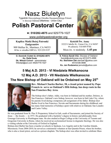 Nasz Biuletyn Tygodnik Diecezjalnego Ośrodka Duszpasterskiego Polonii w diecezji Oakland (Martinez - Union City) Polish Pastoral Center ?: 510/282-4875 and 925/779-1027 www.polishpastoralcenter.org Kaplica Matki Bożej Patronki Emigrantów 909 Mellus St., Martinez, CA 94553 Kościół Św. Anny 32223 Cabello St., Union City, CA 94587 ? cafeteria: 510/489-9784 ?/fax w ośrodku EBPAA: 925/229-9197 Msza św. w niedzielę - 1.45 pm O. Dominik Ciołek SJ (510)282-4875 Ks. Rafał Duda Dk. Witold Cichoń - administrator [email protected] ?925/779-1027 S. Felicia Sarati CSJ, Diocese of Oakland [email protected] ?510/273-4998 Ks. Stanisław Żak [email protected] ?510/336-0698 Ks. Jan Rudzewicz [email protected] 5 Maj A.D. 2013 - VI Niedziela Wielkanocna 12 Maj A.D. 2013 - VII Niedziela Wielkanocna The New Bishop of Oakland will be Ordained on May 25th Rev. Michael Charles Barber, 58, a Jesuit priest named by Pope Francis to serve as Oakland’s fifth bishop, has deep roots in the San Francisco Bay Area. The bishop-elect’s father, Adlai, was born in Oakland and his mother, Dolores, in San Francisco. Oakland’s new bishop, however, was born in Salt Lake City, where his parents lived during a temporary job assignment of his father. Bishop-elect Barber lived in San Francisco, Novato and Sacramento during his childhood, and has many fond memories of holidays spent with relatives in Oakland, San Leandro and Castro Valley. He was graduated from St. Pius X Preparatory School in Galt, south of Sacramento, and joined the Society of Jesus — the Jesuits — in 1973. He graduated with a bachelor’s degree in history and philosophy from Gonzaga University in Washington state. He also studied at Regis College at the University of Toronto and Gregorian University in Rome, where he received an ecclesiastical license in dogmatic theology. He was also a visiting scholar at the University of Oxford in England. Bishop-elect Barber has been a teacher at schools in Spokane, Los Angeles and in the Caroline Islands, Micronesia. From 2004-2010, he served as a ministerial volunteer at San Quentin Prison, where his brother, who is also a Jesuit priest, served as a prison chaplain. The bishop-elect was often invited to celebrate Mass and visit with prisoners. He has also been a member of the United States Navy Reserve since 1991. He was promoted to captain in October 2012 and has served in many assignments, currently as deputy force chaplain for reserve affairs, Marine Corps Forces Pacific, at Camp Smith, Hawaii. He has also served as command chaplain at Naval Base Guantánamo Bay, Cuba, and on two aircraft carriers, the USS Abraham Lincoln and the John C. Stennis. Locally, he was reserve chaplain for Marine Expeditionary Force 220 in Alameda, and chaplain for the 23rd Marine Regiment, Fourth Marine Division, San Bruno. In the Bay Area, the bishop-elect was director of the School of Pastoral Leadership in the Archdiocese of San Francisco. From 2003-2010 he taught at St. Patrick’s Seminary in Menlo Park and was director of spiritual formation there. At the time of his appointment, Bishop-elect Barber had been serving as director of spiritual formation at St. John’s Seminary in the Archdiocese of Boston. He is a magistral chaplain of the Order of Malta and a knight of the Holy Sepulchre. In addition to English, he speaks Italian, French, Samoan and liturgical Spanish. The Rev. Michael F. Weiler, SJ, provincial of the California Province of the Society of Jesus, said, “From its origin, the Society of Jesus was formed to be an instrument of Christ by serving the Church. Though Jesuits promise not to seek high office in the Church, when asked by the Holy Father, we respond to the call and serve as bishops. “We promise our brother Fr. Michael Barber our full support and continued affection as he continues to minister to the people of God in this new mission.” The bishop-elect said the assignment came as a surprise to him, and that he is one of three Jesuits in the United States named Michael Barber. One of the bishop-elect’s first questions to the apostolic nuncio, when they met in Washington, DC, recently, was: “Do you have the right Michael Barber, SJ?” He was assured he was the right one. . Zebrane składki kościelne w roku 2013. Za złożone ofiary składamy serdeczne Bóg zapłać: Martinez Union City 01/06/13 $218 $142 01/13/13 $291 $159 01/20/13 $400 $219 01/27/13 $227 $183 02/03/13 $367 $154 02/10/13 $290 $145 02/13/13 $128 ------ 02/17/13 $410 $187 02/24/13 $288 $189 03/03/13 $286 $209 03/10/13 $228 $174 03/17/13 $436 $162 03/24/13 $587 $243 03/28/13 $120 -------- 03/30/13 $327 -------- 03/31/13 $903 $397 04/07/13 $514 $144 Wierzbice $403(jalmuzna) -------- 04/14/13 $253 $190 04/21/13 $345 $212 04/28/13 $270 $179 Jak już wcześniej informowalem Zakład dla dzieci niepełnosprawnych w Wierzbicach otrzymał od nas około 2,600 zł oraz paczki, o ktore zadbali Panstwo Cela Barron z mężem Wojciechem Czarnieckim. Siostry już wcześniej pisały podziękowania za gotówkę, obecnie zaś pisząa swe podziękowania za otrzymane paczki wraz z ich zawartością. Zacytuje “ otrzymana od Was piękna odzież bardzo przydała się dzieciom, ponieważ znaczna część z nich, to sieroty wogóle nieznające swoich rodziców, albo dzieci z rodzin bardzo ubogich” Dalej Siostry pisza “ W obecnej chwili warunki mieszkaniowe i rehabilitacyjne mają dobre. Natomiast ogólne utrzymanie placówki jest dla nas bardzo drogie. Piszemy wnioski, prośby o pomoc do różnych miejsc. Dzięki między innymi pomocy z Waszej Parafii możemy sprawic, że buzie dzieci są uśmiechnięte. Z pozdrowieniami i wyrazami wdzięczności za wszelkie dobro czynione dla dzieci z Wierzbic, a także z wyrazami głębokiego szacunku i z zapewnieniem o naszej modlitewnej pamięci za Was. Podpis: Siostry Św. Józefa wraz z dziećmi z Wierzbic oraz Dyrektor Zakładu S. Agnieszka Perz. Z Sponsorzy “Naszego Biuletynu” Z Ogłoszenia ró