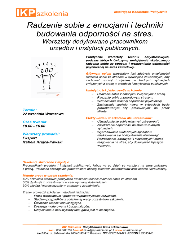 Inspirująco Konkretnie Praktycznie Radzenie sobie z emocjami i techniki budowania odporności na stres. Warsztaty dedykowane pracownikom urzędów i instytucji publicznych. Praktyczne warsztaty technik antystresowych, podczas których ćwiczymy umiejętność skutecznego radzenia sobie ze stresem i wzmacniania odporności psychicznej na stres zawodowy. Głównym celem warsztatów jest zdobycie umiejętności radzenia sobie ze stresem w sytuacjach zawodowych, aby zachować spokój i dystans w trudnych sytuacjach związanych z pracą w urzędach i instytucjach publicznych. Termin: 22 września Warszawa Czas trwania: 10.00 - 16.00 Warsztaty prowadzi: Ekspert Izabela Krejca-Pawski Umiejętności, jakie rozwija szkolenie: Radzenie sobie z emocjami związanymi z pracą. Radzenie sobie z zawodowym stresem. Wzmacnianie własnej odporności psychicznej. Zachowanie spokoju nawet w sytuacjach bycia prowokowanym czy „atakowanym” np. przez klienta. Efekty udziału w szkoleniu dla uczestników: Uświadomienie sobie własnych „stresorów”. Zwiększenie odporności na stres w trudnych sytuacjach. Wypracowanie skutecznych sposobów relaksowania się i odzyskiwania równowagi. Rozróżniania „zdrowych” i niezdrowych” metod reagowania na stres, aby dokonywać lepszych wyborów. Szkolenie stworzone z myślą o: Pracownikach urzędów i instytucji publicznych, którzy na co dzień są narażeni na stres związany z pracą. Polecane szczególnie pracownikom obsługi klientów, sekretariatów oraz kadrze kierowniczej. Metody pracy w czasie szkolenia: 40% szkolenia stanowią praktyczne ćwiczenia technik radzenia sobie ze stresem. 30% dyskusje z uczestnikami w celu wymiany doświadczeń. 30% wiedza i wprowadzenie w omawiane zagadnienia. Trener prowadzi szkolenie metodami takimi jak: Praca warsztatowa i grupowe wypracowywanie rozwiązań. Studium przypadków z codziennej pracy uczestników szkolenia. Ćwiczenia technik relaksacyjnych. Dyskusja moderowana i burza mózgów. Uzupełnione o mini-wykłady tam, gdzie jest to niezbędne. IKP Szkolenia Certyfikowana firma szkoleniowa kom. 606 302 180 I e-mail [email protected] l www.ikpszkolenia.pl siedziba: ul. Zakopiańska 103a/3 30-418 Kraków l NIP:6792814447 l REGON:123035440 Inspirująco Konkretnie Praktycznie Program szkolenia: 1 dzień (8 x 45 min) Moduł 1. Radzenie sobie ze stresem i emocjami w sytuacjach zawodowych. Rodzaje stresu związane ze specyfiką pracy w urzędach i instytucjach publicznych. Czynniki wywołujące stres i jak je rozpoznać: stres, przeciążenie czy zmęczenie. Studium przypadku: Co się z nami dzieje, gdy jesteśmy w stresie. „Niezdrowe” metody, które pogarszają sytuację: tłumienie emocji, wyładowywanie się, zajadanie stresu, oraz jak im przeciwdziałać. „Zdrowe” metody radzenia sobie ze stresem. Lista skutecznych metod. Test szkoleniowy: Jak radzisz sobie ze stresem i co Cię stresuje w pracy? Efekty modułu: uczestnicy uświadomią sobie, jakie czynniki są dla nich najbardziej stresujące i nauczą się je rozpoznawać. Moduł 2. Odporność psychiczna na zawodowy stres – jak ją wzmacniać? Kim jest osoba „odporna psychicznie”? Fakty i mity. Osobisty dobrostan – czym jest i jak o niego zadbać? 6 zasad wzmacniania odporności na zawodowy stres. Praktyczne wskazówki jak chronić siebie samego przed stresem zawodowym, takim jak: o Stres związany z emocjami: własnymi i u innych. o Stres związany z konfliktami z innymi (np. w obsłudze klienta, sekretariacie itp. ). o Stres związany z pracą pod presją czasu. o Stres związany z nadmiarem i przytłoczeniem ilością obowiązków do wykonania. o Stres związany z ciągłymi zmianami w pracy i zespole. o Stres związany z problemami z procedurami, przepisami i długim biegiem spraw. o Jak radzić sobie z natrętnymi myślami, których „nie da się wyłączyć”? o Jak radzić sobie z poczuciem bycia „napiętym i rozdrażnionym”? Efekty modułu: uczestnicy poznają zasady wzmacniania własnej odporności psychicznej na stresujące sytuacje zawodowe. Moduł 3. 8 skutecznych technik antystresowych do stosowania w pracy i poza nią – wykonujemy ćwiczenia. Technika oddechowa. Technika afirmacji. Technika wyciszania emocji. Techniki kreatywne. Techniki z praktyki mindfulness. Ćwiczenia relaksacyjne do stosowania w miejscu pracy. Trening relaksacyjny do stosowania w domu. „Relaksacyjne otoczenie” – jak je wykorzystywać do przywracania sobie spokoju. Efekty modułu: uczestnicy przećwiczą najważniejsze techniki relaksacyjne i nauczą się je stosować w praktyce. Moduł 4. Warsztaty – „Mój osobisty plan rozwijania odporności na stres”. Dopasowujemy techniki antystresowe do temperamentu, specyfiki i stylu pracy uczestników. Warsztaty tworzenia osobistego planu wzmacniania odporności na stres. Podsumowanie: 10 złotych metod radzenia sobie z zawodowym stresem. Efekty modułu: uczestnicy opracują gotowy do zastosowania po szkoleniu plan radzenia sobie ze stresem, dopasowanych do ich indywidulanych potrzeb. IKP Szkolenia Certyfikowana firma szkoleniowa kom. 606 302 180 I e-mail [email protected] l www.ikpszkolenia.pl siedziba: ul. Zakopiańska 103a/3 30-418 Kraków l NIP:6792814447 l REGON:123035440 Inspirująco Konkretnie Praktycznie Izabela Krejca-Pawski – trener pracowników administracji publicznej Certyfikowany trener, szkolący pracowników administracji publicznej. Specjalizuje się w szkoleniach z zakresu komunikacji i umiejętności miękkich, w tym szczególnie z obsługi klienta, negocjacji i zarządzania czasem. Wcześniej trener wewnętrzny z zakresu obsługi klienta, wspierający zarówno pracowników i kadrę kierowniczą w zwiększaniu efektywności działania. Przepracowała na salach szkoleniowych ponad 1400 godzin, co zapewnia jej duże doświadczenie w zakresie projektowania efektywnych szkoleń. Absolwentka studiów podyplomowych „Psychologia w biznesie” na Wyższej Szkole Europejskiej im. ks. Józ