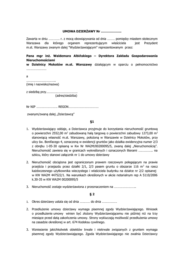 UMOWA DZIERŻAWY Nr ……………….. Zawarta w dniu …………. r. z mocą obowiązywania od dnia ……… pomiędzy miastem stołecznym Warszawa dla którego organem reprezentującym właściciela jest Prezydent m.st. Warszawy zwanym dalej "Wydzierżawiającym" reprezentowanym przez: Pana mgr inż. Waldemara Albińskiego – Dyrektora Zakładu Gospodarowania Nieruchomościami w Dzielnicy Mokotów m.st. Warszawy działającym w oparciu o pełnomocnictwo …………………… a …………………………….. (imię i nazwisko/nazwa) z siedzibą przy………………………………. (adres/siedziba) Nr NIP ……………………. REGON……………………………… zwanym/zwaną dalej „Dzierżawcą” §1 1. Wydzierżawiający oddaje, a Dzierżawca przyjmuje do korzystania nieruchomość gruntową o powierzchni 2552,00 m2 zabudowaną halą targową o powierzchni zabudowy 1273,00 m 2 stanowiącą własność m.st. Warszawy, położoną w Warszawie w Dzielnicy Mokotów, przy ulicy św. Bonifacego 4, oznaczoną w ewidencji gruntów jako działka ewidencyjna numer 2/3 z obrębu 1-05-30 opisaną w Kw Nr WA2M/00200095/5, zwaną dalej „Nieruchomością”. Nieruchomość zawiera się w granicach wykreślonych i oznaczonych literami …………….. na szkicu, który stanowi załącznik nr 1 do umowy dzierżawy 2. Nieruchomość obciążona jest ograniczonym prawem rzeczowym polegającym na prawie przejścia i przejazdu przez działki 2/1, 2/3 pasem gruntu o obszarze 116 m 2 na rzecz każdoczesnego użytkownika wieczystego i właściciela budynku na działce nr 2/2 opisanej w KW WA2M 447522/1. Na warunkach określonych w akcie notarialnym rep A 5110/2006 k.30-35 w KW WA2M 00200095/5 3. Nieruchomość zostaje wydzierżawiona z przeznaczeniem na …………………….. §2 1. Okres dzierżawy ustala się od dnia ………… do dnia ……………… 2. Przedłużenie umowy dzierżawy wymaga pisemnej zgody Wydzierżawiającego. Wniosek o przedłużenie umowy winien być złożony Wydzierżawiającemu nie później niż na trzy miesiące przed datą zakończenia umowy. Strony wykluczają możliwość przedłużenia umowy na zasadzie określonej w art. 674 Kodeksu cywilnego. 3. Wzniesienie jakichkolwiek obiektów trwale i nietrwale związanych z gruntem wymaga pisemnej zgody Wydzierżawiającego. Zgoda Wydzierżawiającego nie zwalnia Dzierżawcy 2 z obowiązku uzyskania wymaganych prawem zgód, pozwoleń, zezwoleń i uzgodnień. Wysokość ani charakter nakładów poniesionych na zagospodarowanie terenu nie będzie stanowić podstawy do domagania się przedłużenia umowy dzierżawy, jak również do zgłaszania przez Dzierżawcę jakichkolwiek innych roszczeń wobec Wydzierżawiającego po wygaśnięciu umowy. 4. W przypadku nie wyrażenia zgody na przedłużenie umowy dzierżawy Dzierżawcy nie będzie przysługiwać roszczenie o wskazanie terenu zamiennego. §3 Strony ustalają miesięczną stawkę czynszu dzierżawnego w kwocie netto ………..zł. (słownie …………………………………..), co odpowiada stawce netto …… zł. (słownie ………………………………………..) za 1 m² dzierżawionego gruntu zabudowanego halą oraz miesięczną stawkę czynszu dzierżawnego w kwocie netto ………..zł. (słownie …………………………………..), co odpowiada stawce netto …… zł. (słownie ………………………………………..) za 1 m² dzierżawionego gruntu niezabudowanego. Kwota czynszu będzie każdorazowo powiększona o podatek VAT, ustalony według obowiązującej stawki, która w dniu zawarcia umowy wynosi 23%. Kwota miesięcznego czynszu wraz z podatkiem VAT wynosi ……….. (słownie ………………………………………….) zł., w tym VAT ……….. zł. (słownie……………………………………………) Wpłat z tytułu czynszu należy dokonywać z góry przelewem na rachunek bankowy Zakładu Gospodarowania Nieruchomościami Dzielnicy Mokotów m.st. Warszawy nr ……………………………………………….w terminie do dnia 21-tego każdego miesiąca, ( niezależnie od terminu doręczenia faktury). Przy dokonywaniu wpłat należy podać numer umowy dzierżawy. Dzierżawca oświadcza, że posiada NIP nr-……………. §4 1. W przypadku opóźnienia w zapłacie czynszu Wydzierżawiający będzie upoważniony do naliczenia odsetek ustawowych. Dokonane przez Dzierżawcę wpłaty Wydzierżawiający ma prawo zaliczyć w pierwszej kolejności na odsetki ustawowe z tytułu opóźnienia, następnie na czynsz i opłaty zaległe, a dopiero w ostatniej kolejności na czynsz i opłaty bieżące. 2. Dwumiesięczne opóźnienie w zapłacie czynszu, w tym odmowa zapłaty czynszu podwyższonego zgodnie z § 5 stanowić będzie podstawę do rozwiązania umowy bez zachowania okresu wypowiedzenia, jeżeli dzierżawca po udzieleniu mu dodatkowego miesięcznego terminu nie dokona zapłaty zaległego czynszu wraz z odsetkami. 3. W przypadku korzystania z nieruchomości bez tytułu prawnego korzystający zobowiązuje się do zapłaty odszkodowania w wysokości 200% czynszu brutto miesięcznie, naliczanego zgodnie z dotychczasową umową (kwota netto + VAT), w okresie od dnia zakończenia umowy do dnia wydania nieruchomości. 3 4. W razie złożenia przez Dzierżawcę wniosku o zawarcie kolejnej umowy dzierżawy, zgodnie z § 2 ust. 2 niniejszej umowy i nie poinformowania przez Wydzierżawiającego o odmowie zawarcia kolejnej umowy, wynagrodzenie za bezumowne korzystanie z nieruchomości do czasu zawarcia nowej umowy, równe będzie kwocie czynszu brutto naliczanego zgodnie z dotychczasową umową (kwota netto + VAT). Strony zgodnie oświadczają, że korzystanie przez Dzierżawcę z nieruchomości w powyższym okresie nie oznacza przedłużenia umowy na podstawie art. 674 Kodeksu cywilnego. 5. Dzierżawca nie jest uprawniony do dokonywania potrąceń z czynszu dzierżawnego żadnych sum z tyt