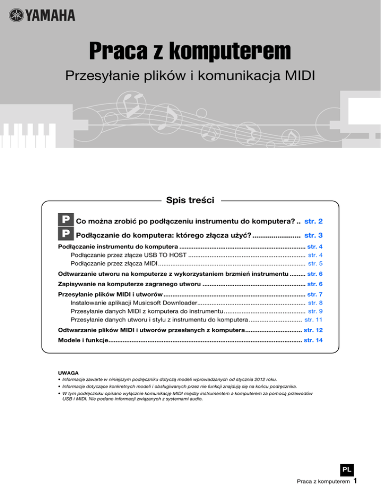 Praca z komputerem Przesyłanie plików i komunikacja MIDI Spis treści P P Co można zrobić po podłączeniu instrumentu do komputera? .. str. 2 Podłączanie do komputera: którego złącza użyć? ....................... str. 3 Podłączanie instrumentu do komputera ....................................................................... str. 4 Podłączanie przez złącze USB TO HOST .................................................................. str. 4 Podłączanie przez złącza MIDI................................................................................... str. 5 Odtwarzanie utworu na komputerze z wykorzystaniem brzmień instrumentu ......... str. 6 Zapisywanie na komputerze zagranego utworu .......................................................... str. 6 Przesyłanie plików MIDI i utworów ................................................................................ str. 7 Instalowanie aplikacji Musicsoft Downloader............................................................. str. 8 Przesyłanie danych MIDI z komputera do instrumentu.............................................. str. 9 Przesyłanie danych utworu i stylu z instrumentu do komputera .............................. str. 11 Odtwarzanie plików MIDI i utworów przesłanych z komputera................................ str. 12 Modele i funkcje............................................................................................................. str. 14 UWAGA • Informacje zawarte w niniejszym podręczniku dotyczą modeli wprowadzanych od stycznia 2012 roku. • Informacje dotyczące konkretnych modeli i obsługiwanych przez nie funkcji znajdują się na końcu podręcznika. • W tym podręczniku opisano wyłącznie komunikację MIDI między instrumentem a komputerem za pomocą przewodów USB i MIDI. Nie podano informacji związanych z systemami audio. PL Praca z komputerem 1 Co można zrobić po podłączeniu instrumentu do komputera? Wiele cyfrowych instrumentów muzycznych obsługuje system MIDI (ang.: Musical Instrument Digital Interface — cyfrowy interfejs instrumentów muzycznych). Umożliwia on komunikację i wymianę danych MIDI z komputerem, w tym informacji dotyczących danego wykonania i danych odtwarzanego utworu. UWAGA • W tym podręczniku opisano wyłącznie komunikację MIDI między instrumentem a komputerem za pomocą przewodów USB i MIDI. Nie podano informacji związanych z systemami audio. • Szczegółowe informacje na temat standardu MIDI można znaleźć w podręczniku „MIDI Basics” (Podstawy standardu MIDI) w witrynie http://download.yamaha.com/ W witrynie wprowadź nazwę modelu i na liście powiązanych podręczników wybierz „MIDI Basics” (Podstawy standardu MIDI). Przesyłanie plików MIDI i utworów … str. 7 Dane utworu nagranego na instrumencie (User Song) można przenosić do komputera i zapisywać w postaci plików. Natomiast dane utworu pobrane z Internetu (pliki MIDI) można przesyłać i przechowywać w pamięci instrumentu. Dzięki temu utwory można przesłuchiwać i ćwiczyć w późniejszym czasie. Dane można przenosić za pomocą bezpłatnego programu Musicsoft Downloader. Instrument Przesyłanie UWAGA • Po podłączeniu instrumentu do komputera dostępne są różne funkcje, w zależności od modelu. Szczegółowe informacje można znaleźć na końcu tego podręcznika lub w podręczniku użytkownika dostarczonym wraz z instrumentem. Odtwarzanie utworu na komputerze z wykorzystaniem brzmień instrumentu … str. 6 Pliki MIDI z utworami można odtwarzać przy użyciu brzmień instrumentu, korzystając ze specjalnego oprogramowania zainstalowanego na komputerze. Instrument Odtwarzanie Zapisywanie na komputerze zagranego utworu … str. 6 Utwór zagrany na instrumencie może zostać zapisany na komputerze jako plik MIDI. W zależności od oprogramowania można go edytować na różne sposoby, a nawet przekształcić na zapis nutowy. Instrument Nagrywanie Praca z komputerem 2 Podłączanie do komputera: którego złącza użyć? Większość instrumentów MIDI wyposażona jest w złącza MIDI lub USB TO HOST, dzięki którym można podłączyć je do komputera. Należy sprawdzić, jakie złącze znajduje się w instrumencie. W przypadku złącza USB TO HOST: … str. 4 Instrument można podłączyć do komputera za pomocą przewodu USB typu AB o maksymalnej długości 3 m. W przypadku złączy MIDI: … str. 5 Instrument można podłączyć do komputera za pomocą przewodu MIDI i interfejsu USB-MIDI (na przykład Yamaha UX16). Jeżeli instrument wyposażony jest w obydwa złącza, zaleca się podłączenie go do komputera za pomocą złącza USB TO HOST. Zaletą takiego rozwiązania jest użycie jednego przewodu i możliwość obsługi wielu portów. Praca z komputerem 3 Podłączanie instrumentu do komputera Podłączanie przez złącze USB TO HOST Środki ostrożności, które należy zachować podczas korzystania ze złącza USB TO HOST Podłączając komputer do złącza USB TO HOST, należy przestrzegać następujących zasad. Zlekceważenie ich może spowodować zawieszenie się komputera i uszkodzenie lub utratę danych. Jeśli instrument lub komputer zawiesi się, ponownie włącz oprogramowanie lub system operacyjny komputera, wyłącz zasilanie instrumentu i ponownie uruchom komputer. NOTYFIKACJA • Należy używać przewodów USB typu AB o długości maksymalnie 3 m. Nie można korzystać z przewodów USB 3.0. • Przed podłączeniem komputera do złącza USB TO HOST wyłącz wszelkie tryby oszczędzania energii komputera (takie jak wstrzymanie, uśpienie lub oczekiwanie). • Przed włączeniem zasilania instrumentu podłącz komputer do złącza USB TO HOST. • W czasie podłączania komputera do instrumentu odczekaj co najmniej sześć sekund między następującymi czynnościami: (1) przy wyłączaniu i ponownym włączaniu instrumentu lub (2) przy podłączaniu i odłączaniu przewodu USB. System operacyjny (OS) Windows Vista w