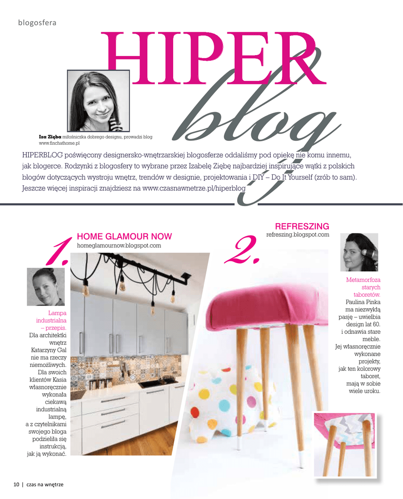 blogosfera 1. blog HIPER Iza Zięba miłośniczka dobrego designu, prowadzi blog www.finchathome.pl 2. HIPERBLOG poświęcony designersko-wnętrzarskiej blogosferze oddaliśmy pod opiekę nie komu innemu, jak blogerce. Rodzynki z blogosfery to wybrane przez Izabelę Ziębę najbardziej inspirujące wątki z polskich blogów dotyczących wystroju wnętrz, trendów w designie, projektowania i DIY – Do It Yourself (zrób to sam). Jeszcze więcej inspiracji znajdziesz na www.czasnawnetrze.pl/hiperblog Lampa industrialna – przepis. Dla architektki wnętrz Katarzyny Gal nie ma rzeczy niemożliwych. Dla swoich klientów Kasia własnoręcznie wykonała ciekawą industrialną lampę, a z czytelnikami swojego bloga podzieliła się instrukcją, jak ją wykonać. 10 | czas na wnętrze HOME GLAMOUR NOW homeglamournow.blogspot.com REFRESZING refreszing.blogspot.com Metamorfoza starych taboretów. Paulina Pinka ma niezwykłą pasję – uwielbia design lat 60. i odnawia stare meble. Jej własnoręcznie wykonane projekty, jak ten kolorowy taboret, mają w sobie wiele uroku. Drabina na taras – DIY. Dorota Lewandowska to prawdziwa złota rączka, a jej blog to istna kopalnia ciekawych projektów w stylu „zrób to sam”. Drabina na taras wykonana według pomysłu blogerki może posłużyć jako podpora dla roślin lub lampek ogrodowych. 5. 3. BABA MA DOM babamadom.pl homelikeilike.com HOME LIKE I LIKE Biurko IKEA na koralowych nogach – DIY. Luiza Wyganowska jest fanką amerykańskiej estetyki we wnętrzach, pozostaje jej wierna również we własnym domu. Blogerka pięknie przerabia i stylizuje meble, tak aby odzwierciedlały jej ulubiony klimat. 4. 6. ZOYKA HOME zoykahome.pl Podnóżek – DIY Kto by pomyślał, że ten piękny podnóżek został wykonany ze skrzynki po winie? Jego autorka Marta Michalak uwielbia styl glamour, a na swoim blogu udowadnia, że elegancja nie musi być droga. ALE TU ŁADNIE aletuladnie.blogspot.com Komoda w nowym outficie. U Karoliny Augustyn jest naprawdę ładnie. Znalazło się tu miejsce na niebanalną aranżacje przestrzeni dla dzieci, ciekawą kolorystykę oraz znane modele mebli w całkowicie nowych odsłonach. Zdjęcia i teksty z tych i wielu innych polskich i zagranicznych blogów obejrzyj na: czasnawnetrze.pl/hiperblog
