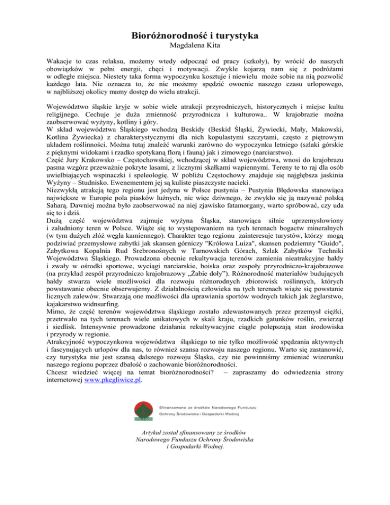 BioróŜnorodność i turystyka Magdalena Kita Wakacje to czas relaksu, moŜemy wtedy odpocząć od pracy (szkoły), by wrócić do naszych obowiązków w pełni energii, chęci i motywacji. Zwykle kojarzą nam się z podróŜami w odległe miejsca. Niestety taka forma wypoczynku kosztuje i niewielu moŜe sobie na nią pozwolić kaŜdego lata. Nie oznacza to, Ŝe nie moŜemy spędzić owocnie naszego czasu urlopowego, w najbliŜszej okolicy mamy dostęp do wielu atrakcji. Województwo śląskie kryje w sobie wiele atrakcji przyrodniczych, historycznych i miejsc kultu religijnego. Cechuje je duŜa zmienność przyrodnicza i kulturowa.. W krajobrazie moŜna zaobserwować wyŜyny, kotliny i góry. W skład województwa Śląskiego wchodzą Beskidy (Beskid Śląski, śywiecki, Mały, Makowski, Kotlina śywiecka) z charakterystycznymi dla nich kopulastymi szczytami, często z piętrowym układem roślinności. MoŜna tutaj znaleźć warunki zarówno do wypoczynku letniego (szlaki górskie z pięknymi widokami i rzadko spotykaną florą i fauną) jak i zimowego (narciarstwo). Część Jury Krakowsko – Częstochowskiej, wchodzącej w skład województwa, wnosi do krajobrazu pasma wzgórz przewaŜnie pokryte lasami, z licznymi skałkami wapiennymi. Tereny te to raj dla osób uwielbiających wspinaczki i speleologię. W pobliŜu Częstochowy znajduje się najgłębsza jaskinia WyŜyny – Studnisko. Ewenementem jej są kuliste piaszczyste nacieki. Niezwykłą atrakcją tego regionu jest jedyna w Polsce pustynia – Pustynia Błędowska stanowiąca największe w Europie pola piasków luźnych, nic więc dziwnego, Ŝe zwykło się ją nazywać polską Saharą. Dawniej moŜna było zaobserwować na niej zjawisko fatamorgany, warto spróbować, czy uda się to i dziś. DuŜą część województwa zajmuje wyŜyna Śląska, stanowiąca silnie uprzemysłowiony i zaludniony teren w Polsce. WiąŜe się to występowaniem na tych terenach bogactw mineralnych (w tym duŜych złóŜ węgla kamiennego). Charakter tego regionu zainteresuje turystów, którzy mogą podziwiać przemysłowe zabytki jak skansen górniczy "Królowa Luiza", skansen podziemny "Guido", Zabytkowa Kopalnia Rud Srebronośnych w Tarnowskich Górach, Szlak Zabytków Techniki Województwa Śląskiego. Prowadzona obecnie rekultywacja terenów zamienia nieatrakcyjne hałdy i zwały w ośrodki sportowe, wyciągi narciarskie, boiska oraz zespoły przyrodniczo-krajobrazowe (na przykład zespół przyrodniczo krajobrazowy „śabie doły”). RóŜnorodność materiałów budujących hałdy stwarza wiele moŜliwości dla rozwoju róŜnorodnych zbiorowisk roślinnych, których powstawanie obecnie obserwujemy. Z działalnością człowieka na tych terenach wiąŜe się powstanie licznych zalewów. Stwarzają one moŜliwości dla uprawiania sportów wodnych takich jak Ŝeglarstwo, kajakarstwo widnsurfing. Mimo, Ŝe część terenów województwa śląskiego zostało zdewastowanych przez przemysł cięŜki, przetrwało na tych terenach wiele unikatowych w skali kraju, rzadkich gatunków roślin, zwierząt i siedlisk. Intensywnie prowadzone działania rekultywacyjne ciągle polepszają stan środowiska i przyrody w regionie. Atrakcyjność wypoczynkowa województwa śląskiego to nie tylko moŜliwość spędzania aktywnych i fascynujących urlopów dla nas, to równieŜ szansa rozwoju naszego regionu. Warto się zastanowić, czy turystyka nie jest szansą dalszego rozwoju Śląska, czy nie powinniśmy zmieniać wizerunku naszego regionu poprzez dbałość o zachowanie bioróŜnorodności. Chcesz wiedzieć więcej na temat bioróŜnorodności? – zapraszamy do odwiedzenia strony internetowej www.pkegliwice.pl. Artykuł został sfinansowany ze środków Narodowego Funduszu Ochrony Środowiska i Gospodarki Wodnej.