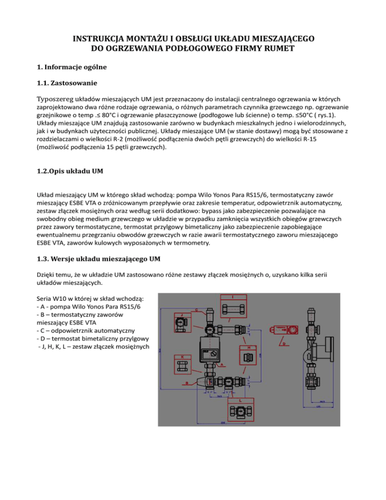 INSTRUKCJA MONTAŻU I OBSŁUGI UKŁADU MIESZAJĄCEGO DO OGRZEWANIA PODŁOGOWEGO FIRMY RUMET 1. Informacje ogólne 1.1. Zastosowanie Typoszereg układów mieszających UM jest przeznaczony do instalacji centralnego ogrzewania w których zaprojektowano dwa różne rodzaje ogrzewania, o różnych parametrach czynnika grzewczego np. ogrzewanie grzejnikowe o temp .≤ 80°C i ogrzewanie płaszczyznowe (podłogowe lub ścienne) o temp. ≤50°C ( rys.1). Układy mieszające UM znajdują zastosowanie zarówno w budynkach mieszkalnych jedno i wielorodzinnych, jak i w budynkach użyteczności publicznej. Układy mieszające UM (w stanie dostawy) mogą być stosowane z rozdzielaczami o wielkości R-2 (możliwość podłączenia dwóch pętli grzewczych) do wielkości R-15 (możliwość podłączenia 15 pętli grzewczych). 1.2.Opis układu UM Układ mieszający UM w którego skład wchodzą: pompa Wilo Yonos Para RS15/6, termostatyczny zawór mieszający ESBE VTA o zróżnicowanym przepływie oraz zakresie temperatur, odpowietrznik automatyczny, zestaw złączek mosiężnych oraz według serii dodatkowo: bypass jako zabezpieczenie pozwalające na swobodny obieg medium grzewczego w układzie w przypadku zamknięcia wszystkich obiegów grzewczych przez zawory termostatyczne, termostat przylgowy bimetaliczny jako zabezpieczenie zapobiegające ewentualnemu przegrzaniu obwodów grzewczych w razie awarii termostatycznego zaworu mieszającego ESBE VTA, zaworów kulowych wyposażonych w termometry. 1.3. Wersje układu mieszającego UM Dzięki temu, że w układzie UM zastosowano różne zestawy złączek mosiężnych o, uzyskano kilka serii układów mieszających. Seria W10 w której w skład wchodzą: - A - pompa Wilo Yonos Para RS15/6 - B – termostatyczny zaworów mieszający ESBE VTA - C – odpowietrznik automatyczny - D – termostat bimetaliczny przylgowy - J, H, K, L – zestaw złączek mosiężnych Seria W11 w której w skład wchodzą: - A - pompa Wilo Yonos Para RS15/6 - B – termostatyczny zaworów mieszający ESBE VTA - C – odpowietrznik automatyczny - D – termostat bimetaliczny przylgowy - E - bypass - H, I, J, K, L – zestaw złączek mosiężnych Seria W40 w której w skład wchodzą: - A - pompa Wilo Yonos Para RS15/6 - B – termostatyczny zaworów mieszający ESBE VTA - C – odpowietrznik automatyczny - D – termostat bimetaliczny przylgowy - F, G – zawory kulowe z termometrami - H, I, J, K, L – zestaw złączem mosiężnych Seria WE40 w której w skład wchodzą: - A - pompa Wilo Yonos Para RS15/6 - B – termostatyczny zaworów mieszający ESBE VTA - C – odpowietrznik automatyczny - H, I, J, K, L – zestaw złączek mosiężnych Seria W41 w której w skład wchodzą: - A - pompa Wilo Yonos Para RS15/6 - B – termostatyczny zaworów mieszający ESBE VTA - C – odpowietrznik automatyczny - D – termostat bimetaliczny przylgowy - F, G – zawory kulowe z termometrami - E - bypass - H, I, J, K, L – zestaw złączem mosiężnych 1.4.Zasada działania układu mieszającego UM Układ mieszający jest urządzeniem obniżającym temperaturę czynnika grzewczego np. wody z instalacji centralnego ogrzewania do temperatury odpowiedniej dla instalacji ogrzewania podłogowego. Po otwarciu zaworów odcinających na zasilaniu i powrocie układu i uruchomieniu pompy, woda z obiegu źródła ciepła (lub instalacji c.o.) w termostatycznym zaworze mieszającym jest mieszana z wodą wracającą z pętli ogrzewania podłogowego (płaszczyznowego). Element termostatyczny zaworu mieszającego ustala wielkość strumienia wody o wyższej temperaturze tak aby woda opuszczająca termostatyczny zawór mieszający miała temperaturę zbliżoną do wartości nastawionej na pokrętle zaworu. Pompa obiegowa podaje wodę o zadanej temperaturze do belki rozdzielacza, a równoważna objętość wody o wyższej temp. doprowadzonej do zaworu mieszającego jest odprowadzana przez króciec do przewodu powrotnego instalacji c.o. W celu zabezpieczenia płyty grzewczej przed ewentualnym przegrzaniem w przypadku awarii zaworu mieszającego na elemencie łączącym pompę z górną belką rozdzielacza zainstalowany jest termostat przylgowy ( o ile wybrana została seria zawierająca go w zestawie) na którym nastawiamy temperaturę wyższą o 5°C od maksymalnej temp. pracy instalacji ogrzewania podłogowego. Jeżeli temp. ta zostanie przekroczona termostat wyłączy zasilanie pompy obiegowej. 1.5. Dane techniczne Maksymalne ciśnienie robocze 1,0 MPa ( 10 bar) Ciśnienie różnicowe, mieszania maks . 0,3 MPa ( 3 bar) Maksymalna temp. medium 95°C Zakres regulacji temperatury 20°C ÷ 43°C, 35 ÷ 60°C Zakres temp. termostatu przylgowego 20°C ÷ 90°C Stabilność temperatury medium zmieszanego ±2°C Napięcie zasilania układu 1 ~230V ±10% Dopuszczalne media : woda spełniająca wymagania dla wody w instalacjach zamkniętych, woda z dodatkiem zapobiegającym zamarzaniu (zawartość glikolu <50% mieszaniny). 1.6. Stan dostawy Układ mieszający UM jest dostarczany do Nabywcy w opakowaniu kartonowym , gotowy do montażu w instalacji . 2. Bezpieczeństwo Przed montażem układu mieszającego należy zapoznać się z załączoną do niniejszej instrukcji pompy Wilo Yonos Para RS15/6 i skrupulatnie przestrzegać zawartych w niej zaleceń w czasie montażu układu UM i jego eksploatacji. 3. Montaż 1. Nyple wyposażone w uszczelkę stożkową odkręcić od układu mieszania, a następnie przykręcić je do belek rozdzielacza (stroną z uszczelką stożkową). Cały układ następne przykręcić za pomocą nakrętek obrotowych do nypli zamontowanych uprzednio bo belek rozdzielacza. 2. Na termostacie przylgowym bimetalicznym ustawić temperaturę o 5°C wyższą od maksymalnej temperatury czynnika grzewczego w instalacji ogrzewania podłogowego. 3. Zestaw układ mieszający – rozdzielacz zamontować w szafce tak aby był zapewniony swobodny dostęp do wszelkich pokręteł regulacyjnych i przyłączamy go d