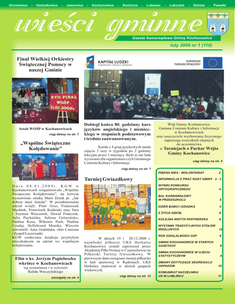 Droniowice - Harbułtowice - Jawornica - Kochanowice - Kochcice - Lubecko - Lubockie - Ostrów - Pawełki wieści gminne Gazeta Samorządowa Gminy Kochanowice luty 2009 nr 1 (110) Finał Wielkiej Orkiestry Świątecznej Pomocy w naszej Gminie Sztab WOŚP w Kochanowicach ciąg dalszy na str. 7 „Wspólne Świąteczne Kolędowanie” Dobiegł końca 80. godzinny kurs języków angielskiego i niemieckiego w stopniach podstawowym i średnio zaawansowanym. Każda z 4 grup językowych miała zajęcia 2 razy w tygodniu po 2 godziny lekcyjne przez 5 miesięcy. Było to nie lada wyzwanie dla organizatora czyli Gminnego Centrum Kultury i Informacji. Wójt Gminy Kochanowice, Gminne Centrum Kultury i Informacji w Kochanowicach oraz nauczyciele wychowania fizycznego zapraszają wszystkich chętnych do uczestnictwa w Turniejach o Puchar Wójta Gminy Kochanowice ciąg dalszy na str. 4 ciąg dalszy na str. 7 PIĘKNA IDEA - WOLONTARIAT Turniej Gwiazdkowy Dnia 04.01.2009r. KGW w Kochanowicach zorganizowało „Wspólne Świąteczne Kolędowanie”, na którym wystawiono sztukę Marii Dziuk pt. „Jak dobrze mieć Anioła”. W przedstawieniu udział wzięli: Piotr Grus, Franciszek Machnik, Franciszek Kuderski oraz Sara i Szymon Wieczorek, Dawid Franczok, Julia Puchalska, Sabina Galusińska, Paulina Kosa, Wiktoria Pach, Paulina Czudaj, Hellebrand Monika. Wieczór uświetnili: Ania Grabińska, chór Canzona i Zespół Lisowianki. KGW serdecznie dziękuje przybyłym mieszkańcom za udział we wspólnym kolędowaniu. Film o ks. Jerzym Popiełuszko wkrótce w Kochanowicach wg scenariusza i w reżyserii Rafała Wieczyńskiego szczegóły na str. 4 W dniach 19 i 20.12.2008 r. najmłodsi piłkarze UKS Herkules Kochanowice zostali zaproszeni przez Akademię Piłki Nożnej w Częstochowie na Piłkarski Turniej Gwiazdkowy. W pierwszym dniu rozegrano turniej piłkarski w hali sportowej w Rędzinach. UKS Herkules startował w dwóch grupach wiekowych. ciąg dalszy na str. 12 2 INFORMACJA Z PRAC RADY GMINY 2 - 3 WYNIKI KONKURSU ORTOGRAFICZNEGO 4 BAL KARNAWAŁOWY W PRZEDSZKOLU 5 DZIEŃ BABCI I DZIADKA 5 Z ŻYCIA SZKÓŁ 6 KOLEJNA WIZYTA PARTNERSKA 6 WYSTAWA TRADYCYJNYCH STOŁÓW WIGILIJNYCH 12 ROK DZIAŁALNOŚCI OSP 8 GMINA KOCHANOWICE W STARYCH GAZETACH 9 GMINA KOCHANOWICE W UJĘCIU STATYSTYCZNYM 9 ZMIANY DOTYCZĄCE SEGREGACJI ODPADÓW 10 KOMUNIKAT NACZELNIKA US W LUBLIŃCU 11 Piękna idea - wolontariat Z końcem stycznia, w ramach współpracy Gminnego Ośrodka Pomocy Społecznej w Kochanowicach z Zespołem Szkół w Kochanowicach , ruszył program wolontariatu pod nazwą: „I Ty możesz zostać wolontariuszem”. Celem tego przedsięwzięcia jest współpraca z uczniami szkół w zakresie nawiązania wolontariatu na rzecz podopiecznych GOPS w Kochanowicach. Młodych ludzi nie trzeba było długo namawiać. Zgłosiło się kilkunastu ochotników , którzy wyrazili gotowość do poświęcenia swojego wolnego czasu na rzecz innych. Podstawową cechą, która odróżnia wolontariusza od pracownika płatnego jest motywacja, wolna od potrzeby zarabiania pieniędzy i innych życiowych konieczności. Wolontariusze, którzy kierują się wrażliwością i troską o człowieka, niosą bezinteresowną pomoc, służąc potrzebującym. Gimnazjaliści dyżurują od poniedziałku do piątku w świetlicy środowiskowej, działającej przy GOPS w Kochanowicach, ofiarując swą pomoc młodszym kolegom. Pomagają dzieciom w odrabianiu zadań domowych, uczą je obsługi komputera, angażują się w prowadzenie zajęć świetlicowych, a także służą pomocą podczas przygotowywania posiłków i pracach porządkowych. Idea wolontariatu daje obopólne korzyści - z jednej strony podopiecznym ze świetlicy środowiskowej, którzy chętnie korzystają z pomocy starszych kolegów, z drugiej strony samym wolontariuszom. Działania jakie podejmują mogą mieć ogromny wpływ na ich postawy, system wartości w dorosłym życiu. Okres nauki w szkole wydaje się być najwłaściwszy dla kreowania postaw altruistycznych. Młodych ludzi cechuje bowiem poczucie wspólnoty. Są oni skłonni akceptować te same normy i zasady, wykazywać otwartość i ciekawość świata. Wolontariat odciska swoje dobroczynne piętno we wszystkich dziedzinach życia, jest jedyną w swoim rodzaju formą kształcenia. Młodzież ma szansę uczestniczyć w zajęciach zgodnie z zainteresowaniami, podjąć się zadań wzbogacających jej doświadczenia i umiejętności. Udział w wolontariacie w wyniku nabytych doświadczeń pozwala sprecyzować zainteresowania, znaleźć pomysł na zawód, studia, a czasem po prostu dorosnąć. Program wolontariatu w Kochanowicach, poprzez projekt: „I Ty możesz zostać wolontariuszem”, dopiero „raczkuje”, ale młodzież już przymierza się do świadczenia pomocy osobom starszym, samotnym i chorym. Miejmy nadzieje, że to dobry wstęp do szeroko zakrojonej aktywności społecznej naszej młodzieży na terenie gminy. Izabela Koślik 2 INFORMACJA Z PRAC RADY GMINY W dniu 13 listopada 2008 roku Rada Gminy podjęła uchwały w sprawie wysokości stawek podatków i opłat lokalnych na 2009 rok, których wysokość przedstawia się następująco: 1. od budynków mieszkalnych lub ich części 0,57 zł od 1m2 powierzchni użytkowej, 2. od garaży 4,85 zł za 1m2, 3. od pozostałych gospodarczych 3,88 zł za 1m2, 4. od budynków letniskowych 6,10 zł za 1m2, 5. od budynków lub ich części zajętych pod działalność gospodarczą z tyt. obrotu materiałem siewnym 9,24 zł, 6. od budynków lub ich części zajętych pod działalność gospodarczą z tyt. świadczeń zdrowotnych 4,00 zł, 7. od budynków lub ich części zajętych pod działalność gospodarczą pozostałą 17,00 zł za 1 m2. 8. od budowli 2% ich wartości, 9. od gruntów: - związanych z prowadzeniem działalności gospodarczej 0,72 zł od 1m2 powierzchni, - od gruntów pozostałych 0,18 zł od 1m2 powierzchni, - od gruntów oznaczonych w ewidencji jako dr bez klasyfi