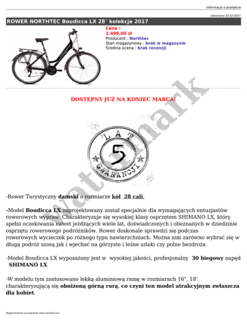 Informacje o produkcie Utworzono 03-03-2017 ROWER NORTHTEC Boudicca LX 28″ kolekcja 2017 Cena : 2.499,00 zł er m ar k Producent : Northtec Stan magazynowy : brak w magazynie Średnia ocena : brak recenzji at DOSTĘPNY JUŻ NA KONIEC MARCA! -Rower Turystyczny damski o rozmiarze kół 28 cali. w -Model Boudicca LX zaprojektowany został specjalnie dla wymagających entuzjastów rowerowych wypraw. Charakteryzuje się wysokiej klasy osprzętem SHIMANO LX, który spełni oczekiwania nawet jeżdżących wiele lat, doświadczonych i obeznanych w dziedzinie osprzętu rowerowego podróżników. Rower doskonale sprawdzi się podczas rowerowych wycieczek po różnego typu nawierzchniach. Można nim zarówno wybrać się w długą podróż szosą jak i wjechać na górzyste i leśne szlaki czy polne bezdroża. -Model Boudicca LX wyposażony jest w wysokiej jakości, profesjonalny 30 biegowy napęd SHIMANO LX -W modelu tym zastosowano lekką aluminiową ramę w rozmiarach 16", 18″ charakteryzującą się obniżoną górną rurą, co czyni ten model atrakcyjnym zwłaszcza dla kobiet. Wygenerowano w programie www.oscGold.com - Nowy projekt ramy dodatkowo zmodernizowano o wewnętrzne prowadzenie pancerzy linek zapewniające precyzyjne działanie zmiany przełożeń oraz ochronę przed zabrudzeniami. -Dodatkowo zamontowane w tym modelu hamulce aluminiowe typu V-Brake, zapewnią bezpieczne i natychmiastowe hamowanie. -Ponadto do roweru zamontowany jest solidny (nośność 25 kg) aluminiowy bagażnik, lekkie i wytrzymałe plastikowe błotniki. er m ar k -Rower posiada tylne i przednie oświetlenie LED, a także amortyzator sztycy podsiodłowej oraz regulowany wspornik kierownicy, które z pewnością poprawiają komfort jazdy. -Model Boudicca LX został wyposażony również w jeden z najlepszych na rynku, przedni, amortyzator CR-8V HLO 700C 50mm z hydrauliczną blokadą skoku, który doskonale wytłumia wszelkie wstrząsy i drgania jakie mogą wystąpić podczas jazdy nawet po pełnych dziur i kolein szosach czy kamienistych lub żwirowych drogach. -Stosunek jakości osprzętu do ceny czyni model Boudicca LX ekskluzywnym rowerem Trekkingowym w niezwykle niskiej cenie! w at Gwarantujemy szybką wysyłkę i pełną satysfakcję z naszych produktów! Geometria ramy Informacje o produkcie 16" 578 562 455 73* 71* 406 172 1081 18" 588 566 455 73* 71* 457 172 1091 er m ar k A A* B C D E F G specyfikacja osprzętu: 30 Alu 16", 18" SR Suntour CR-8V HLO 700C 50mm Shimano LX RD-T670-A at Shimano LX FD-T670 Shimano LX SL-T670 Shimano Deore FC-T521 48x36x26 T 175mm OCTALINK & HOLLOWTECH w Shimano (11-32) Deore CS-HG500-10rz Shimano Deore CN-HG54 VB Tektro Alu Shimano HT-X800 F-R 32H QR TrilogyVB 622x19 Sapim ZINK Kenda 700x38c Northtec Comfort Northtec 25,4 620mm Northtec regulowany 110mm Northtec 350mm 27,2 amortyzowany Wygenerowano w programie www.oscGold.com 14,6 kg Dostępne opcje ROWER NORTHTEC Boudicca LX 28″ kolekcja 2017 w at er m ar k » Kolor Ramy: biało fioletowy połysk, srebrno-niebieski matowy, czarno-czerwony matowy. » Rama: 16'', 18".