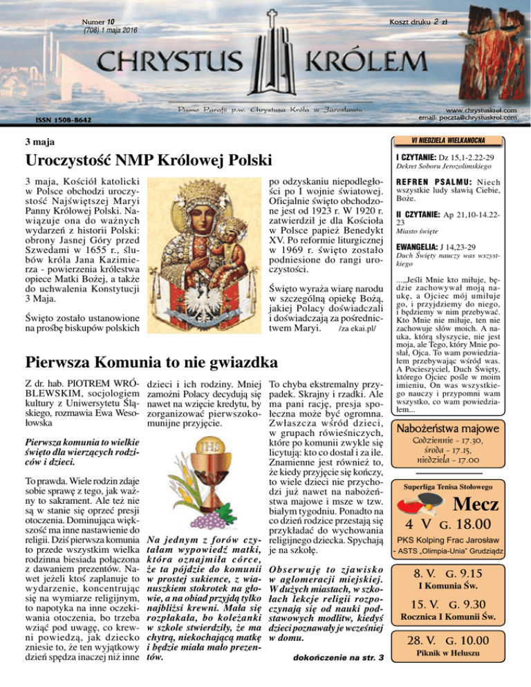 2 10 (708) 1 maja 2016 VI NIEDZIELA WIELKANOCNA 3 maja Uroczystość NMP Królowej Polski I CZYTANIE: Dz 15,1-2.22-29 3 maja, Kościół katolicki w Polsce obchodzi uroczystość Najświętszej Maryi Panny Królowej Polski. Nawiązuje ona do ważnych wydarzeń z historii Polski: obrony Jasnej Góry przed Szwedami w 1655 r., ślubów króla Jana Kazimierza - powierzenia królestwa opiece Matki Bożej, a także do uchwalenia Konstytucji 3 Maja. R E F R E N P S A L M U : Niech wszystkie ludy sławią Ciebie, Boże. po odzyskaniu niepodległości po I wojnie światowej. Oficjalnie święto obchodzone jest od 1923 r. W 1920 r. zatwierdził je dla Kościoła w Polsce papież Benedykt XV. Po reformie liturgicznej w 1969 r. święto zostało podniesione do rangi uroczystości. Święto wyraża wiarę narodu w szczególną opiekę Bożą, jakiej Polacy doświadczali i doświadczają za pośrednictwem Maryi. /za ekai.pl/ Święto zostało ustanowione na prośbę biskupów polskich Pierwsza Komunia to nie gwiazdka Z dr. hab. PIOTREM WRÓBLEWSKIM, socjologiem kultury z Uniwersytetu Śląskiego, rozmawia Ewa Wesołowska Pierwsza komunia to wielkie święto dla wierzących rodziców i dzieci. To prawda. Wiele rodzin zdaje sobie sprawę z tego, jak ważny to sakrament. Ale też nie są w stanie się oprzeć presji otoczenia. Dominująca większość ma inne nastawienie do religii. Dziś pierwsza komunia to przede wszystkim wielka rodzinna biesiada połączona z dawaniem prezentów. Nawet jeżeli ktoś zaplanuje to wydarzenie, koncentrując się na wymiarze religijnym, to napotyka na inne oczekiwania otoczenia, bo trzeba wziąć pod uwagę, co krewni powiedzą, jak dziecko zniesie to, że ten wyjątkowy dzień spędza inaczej niż inne dzieci i ich rodziny. Mniej zamożni Polacy decydują się nawet na wzięcie kredytu, by zorganizować pierwszokomunijne przyjęcie. Dekret Soboru Jerozolimskiego II CZYTANIE: Ap 21,10-14.2223 Miasto święte EWANGELIA: J 14,23-29 Duch Święty nauczy was wszystkiego ...„Jeśli Mnie kto miłuje, będzie zachowywał moją naukę, a Ojciec mój umiłuje go, i przyjdziemy do niego, i będziemy w nim przebywać. Kto Mnie nie miłuje, ten nie zachowuje słów moich. A nauka, którą słyszycie, nie jest moja, ale Tego, który Mnie posłał, Ojca. To wam powiedziałem przebywając wśród was. A Pocieszyciel, Duch Święty, którego Ojciec pośle w moim imieniu, On was wszystkiego nauczy i przypomni wam wszystko, co wam powiedziałem... To chyba ekstremalny przypadek. Skrajny i rzadki. Ale ma pani rację, presja społeczna może być ogromna. Zwłaszcza wśród dzieci, w grupach rówieśniczych, Nabożeństwa majowe Codziennie - 17.30, które po komunii zwykle się środa - 17.15, licytują: kto co dostał i za ile. niedziela - 17.00 Znamienne jest również to, że kiedy przyjęcie się kończy, to wiele dzieci nie przychoSuperliga Tenisa Stołowego dzi już nawet na nabożeństwa majowe i msze w tzw. białym tygodniu. Ponadto na co dzień rodzice przestają się 4 V g. 18.00 przykładać do wychowania Na jednym z forów czy- religijnego dziecka. Spychają PKS Kolping Frac Jarosław tałam wypowiedź matki, je na szkołę. - ASTS „Olimpia-Unia” Grudziądz która oznajmiła córce, że ta pójdzie do komunii Obserwuję to zjawisko 8. V. g. 9.15 w prostej sukience, z wia- w aglomeracji miejskiej. I Komunia Św. nuszkiem stokrotek na gło- W dużych miastach, w szkowie, a na obiad przyjdą tylko łach lekcje religii rozpo15. V. g. 9.30 najbliżsi krewni. Mała się czynają się od nauki podRocznica I Komunii Św. rozpłakała, bo koleżanki stawowych modlitw, kiedyś w szkole stwierdziły, że ma dzieci poznawały je wcześniej chytrą, niekochającą matkę w domu. 28. V. g. 10.00 i będzie miała mało prezenPiknik w Heluszu tów. dokończenie na str. 3 Mecz 2 Chrystus Królem Ikona z cerkwi Chrystus Królem Pierwsza Komunia to nie Religijna uczta eucharystyczna, jaką jest pierwsza gwiazdka komunia, przemienia się dokończenie ze str. 1 w rodzinną biesiadę, w której uczestnicy zapominają Kapłani i katechetki starają o religijnym wymiarze się jak najlepiej przygotować święta, bo nie uczestniczą dzieci do pełnego uczestnic- w nim w pełni, czyli nie twa w Mszy św., ale mają przystępują z dzieckiem do słabe wsparcie ze strony ro- komunii. dzin. Można zauważyć swoisty analfabetyzm religijny Niektórzy twierdzą, że korodziców. Po pierwsze, nie perta to wcale nie taki zły znają prawd wiary, po dru- pomysł, bo dziecko w porogie, nie starają się według zumieniu z rodzicami może nich żyć. kwotę przeznaczyć na to, czego naprawdę pragnie. Wielu rodziców chce, żeby Albo może poprosić o załoich pociechy w tym dniu żenie sobie konta w banku wyglądały wyjątkowo. Jed- i uczyć się oszczędzać. na ze znajomych matek powiedziała, że woli wydać Może i tak. Naprawdę nie 250 zł na garnitur niż 120 chcę nikogo pouczać. Moim zł na albę, której dzieciak zdaniem upominki w tym nigdy więcej nie włoży. dniu powinny mieć charakter symboliczny. Dla Dostępna dla wszystkich, wielu rodzin komunia jest niezależnie od zamożno- ostatnim takim wielkim spości, alba, czyli biała szata tkaniem rodzinnym, które z długimi rękawami, sym- gromadzi wszystkich przy bol czystości duszy, jest jednym stole. Później często ubiorem liturgicznym, który jest tak, że nie ma ślubu ani powszechnie noszą dzieci kościelnego, ani cywilnego. przystępujące do pierwszej Proszę zwrócić uwagę, że komunii. To nowy unifor- obecnie do bierzmowania mizujący strój, element re- przystępuje stosunkowo ligijnej ceremonii. Proszę mała grupa młodych luzauważyć, jak zmieniła się dzi spośród tych, którzy forma prezentów. Kiedyś byli w pierwszej komunii. normą było, że dziecko do- Przed 10-15 laty było inastawało medalik, różaniec czej, gdyż część młodzieży czy Biblię lub zegarek. Dziś przynajmniej uważała, że daje się w prez