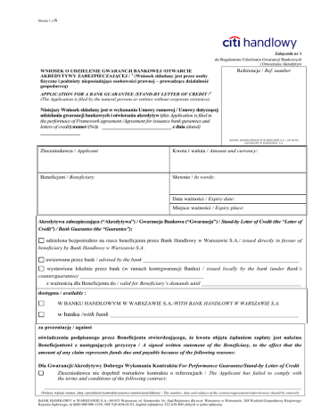 Strona 1 z 6 Załącznik nr 1 do Regulaminu Udzielania Gwarancji Bankowych i Otwierania Akredytyw Referencje / Ref. number WNIOSEK O UDZIELENIE GWARANCJI BANKOWEJ /OTWARCIE AKREDYTYWY ZABEZPIECZAJĄCEJ / 1 (Wniosek składany jest przez osoby fizyczne i podmioty nieposiadające osobowości prawnej – prowadzące działalność gospodarczą) APPLICATION FOR A BANK GUARANTEE /STAND-BY LETTER OF CREDIT /1 (The Application is filed by the natural persons or entities without corporate existence) Niniejszy Wniosek składany jest w wykonaniu Umowy ramowej / Umowy dotyczącej udzielania gwarancji bankowych i otwierania akredytyw (this Application is filed in the performace of Framework agreement /Agreement for issuance bank gurantees and letters of credit) numer/(No): ____________________________ z dnia (dated) ________________ BANKU HANDLOWEGO W WARSZAWIE S.A. / OF BANK HANDLOWY W WARSZAWIE S.A. Zleceniodawca / Applicant Kwota i waluta / Amount and currency: Beneficjent / Beneficiary Słownie / In words: Data ważności / Expiry date: Miejsce ważności / Expiry place: Akredytywa zabezpieczająca (“Akredytywa”) / Gwarancja Bankowa (“Gwarancja”) / Stand-by Letter of Credit (the “Letter of Credit”) / Bank Guarantee (the “Guarantee”): udzielona bezpośrednio na rzecz beneficjenta przez Bank Handlowy w Warszawie S.A./ issued directly in favour of beneficiary by Bank Handlowy w Warszawie S.A. awizowana przez bank / advised by the bank __________________________________________________________ wystawiona lokalnie przez bank (w ramach kontrgwarancji Banku) / issued locally by the bank (under Bank’s counterguarantee) ______________________________________________ z ważnością dla Beneficjenta do / valid for Beneficiary’s demands until _____________________________________ dostępna / available : W BANKU HANDLOWYM W WARSZAWIE S.A./WITH BANK HANDLOWY W WARSZAWIE S.A. w banku /with bank ______________________________________________________________________ za prezentację / against oświadczenia podpisanego przez Beneficjenta stwierdzającego, że kwota objęta żądaniem zapłaty jest należna Beneficjentowi z następujących przyczyn / A signed written statement of the Beneficiary, to the effect that the amount of any claim represents funds due and payable because of the following reasons: Dla Gwarancji/Akredytywy Dobrego Wykonania Kontraktu/For Performance Guarantee/Stand-by Letter of Credit Zleceniodawca nie dopełnił warunków kontraktu o referencjach / The Applicant has failed to comply with the terms and conditions of the following contract: __________________________________________________________________________________________________________ (Należy wpisać numer, datę i przedmiot kontraktu/umowy/zamówienia/faktury / The number, date and subject of the contract/agreement/order/invoice should be entered) BANK HANDLOWY w WARSZAWIE S.A.; 00-923 Warszawa; ul. Senatorska 16; ;Sąd Rejonowy dla m.st. Warszawy w Warszawie, XII Wydział Gospodarczy Krajowego Rejestru Sądowego, nr KRS 000 000 1538; NIP 526-030-02-91; kapitał zakładowy 522.638.400 złotych w pełni opłacony. Strona 2 z 6 __________________________________________________________________________________________________________ Dla Gwarancji/Akredytywy Przetargowej / For Bid Bond Guarantee/Stand-by Letter of Credit Zleceniodawca wygrał przetarg na wykonanie kontraktu, ale nie dopełnił zobowiązania zawarcia kontraktu / The Applicant has been awarded a contract pursuant to a bid and has failed to become a party to the related contract: __________________________________________________________________________________________________________ (Należy wpisać numer i przedmiot przetargu / The number and subject of a tender should be entered) __________________________________________________________________________________________________________ Dla Gwarancji/Akredytywy Płatności / For Payment Guarantee/Stand-by Letter of Credit Zleceniodawca nie dokonał płatności z tytułu / The Applicant has failed to make payments under: __________________________________________________________________________________________________________ (Należy wpisać numer, datę i przedmiot kontraktu/umowy/zamówienia/faktury / The number, date and subject of the contract/agreement/order/invoice should be entered) _______________________________________________________________________________________________ Gwarancja Płatności nie obejmuje zapłaty odsetek za opóźnienia w zapłacie za przedmiot Kontraktu / Payment Guarantee does not cover any payment of interest for delay in payment for the Contract deliverable, Gwarancja Płatności obejmuje oprócz zapłaty za przedmiot Kontraktu także odsetki za opóźnienie / In addition to the payment for the Contract deliverable, this Payment Guarantee also covers default interest ______________________________________________________________________________________________ Dla Gwarancji/Akredytywy Zwrotu Zaliczki / For Advanced Payment Guarantee/Stand-by Letter of Credit Zleceniodawca nie dokonał terminowego zwrotu zaliczki otrzymanej z tytułu / The Applicant has failed to repay, in due time, the advance payment received under: __________________________________________________________________________________________________________ (Należy wpisać numer, datę i przedmiot kontraktu/umowy/zamówienia/faktury / The number, date and subject of the contract/agreement/order/invoice should be entered) __________________________________________________________________________________________________________ Wnioskujemy o udzielenie gwarancji zabezpieczającej płatności podatku akcyzowego wg wzoru określonego w Rozporządzeniu Ministra Finansów z dnia 15.12.20140r. w sprawie wzorów treści gwarancji bankowych i ubezpieczeniowych składanych jako zabezpieczenie akcyzowe (Dz.U poz. 1837) /We apply for excise duty guarantee according to the template specified in Order of Minister