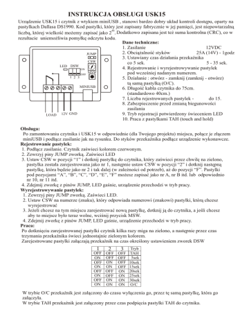 INSTRUKCJA OBSŁUGI USK15 Urządzenie USK15 i czytnik z wtykiem miniUSB , stanowi bardzo dobry układ kontroli dostępu, oparty na pastylkach Dallasa DS1990. Kod pastylki, który jest zapisany fabrycznie w jej pamięci, jest niepowtarzalną 48 liczbą, której wielkość możemy zapisać jako 2 . Dodatkowo zapisana jest też suma kontrolna (CRC), co w rezultacie uniemożliwia pomyłkę odczytu kodu. Dane techniczne: 1. Zasilanie 12VDC 2. Obciążalność styków 25A (14V) - 1godz JUMP 3. Ustawiany czas działania przekaźnika CSW co 5 sek. 5 - 35 sek. LED DSW 4. Rejestrowanie i wyrejestrowywanie pastylek ON MSW pod wcześniej nadanym numerem. OFF 1 2 3 5. Działanie : otwórz - zamknij (zamknij - otwórz) tą samą pastylką (O/C). MINIUSB 6. Długość kabla czytnika do 75cm. (standardowo 40cm.) 7. Liczba rejestrowanych pastylek do 15. 8. Zabezpieczenie przed zmianą biegunowości zasilania GND 12V 9. Tryb rejestracji potwierdzony świeceniem LED LOAD 10. Praca z pastylkami TAH (touch and hold) Obsługa: Po zamontowaniu czytnika i USK15 w odpowiednie (dla Twojego projektu) miejsca, połącz je złączem miniUSB i podłącz zasilanie jak na rysunku. Do styków przekaźnika podłącz urządzenie wykonawcze. Rejestrowanie pastylek: 1. Podłącz zasilanie. Czytnik zaświeci kolorem czerwonym. 2. Zewrzyj piny JUMP zworką. Zaświeci LED 3. Ustaw CSW w pozycji “1” i dotknij pastylkę do czytnika, który zaświeci przez chwilę na zielono, pastylka została zarejestrowana jako nr 1, następnie ustaw CSW w pozycji “2” i dotknij następną pastylkę, która będzie jako nr 2 i tak dalej (w zależności od potrzeb), aż do pozycji “F”. Pastylki pod pozycjami “A”, “B”, “C”, “D”, “E”, “F” możesz zapisać jako nr A, nr B itd. lub odpowiednio nr 10, nr 11 itd. 4. Zdejmij zworkę z pinów JUMP, LED gaśnie, urządzenie przechodzi w tryb pracy. Wyrejestrowywanie pastylek: 1. Zewrzyj piny JUMP zworką. Zaświeci LED. 2. Ustaw CSW na numerze (znaku), który odpowiada numerowi (znakowi) pastylki, którą chcesz wyrejestrować 3. Jeżeli chcesz na tym miejscu zarejestrować nową pastylkę, dotknij ją do czytnika, a jeśli chcesz aby to miejsce było teraz wolne, wciśnij przycisk MSW. 4. Zdejmij zworkę z pinów JUMP, LED gaśnie, urządzenie przechodzi w tryb pracy. Praca: Po dotknięciu zarejestrowanej pastylki czytnik kilka razy miga na zielono, a następnie przez czas trzymania przekaźnika świeci jednostajnie zielonym kolorem. Zarejestrowane pastylki załączają przekaźnik na czas określony ustawieniem zworek DSW 1 2 3 OFF ON OFF ON OFF ON OFF ON OFF OFF ON ON OFF OFF ON ON OFF OFF OFF OFF ON ON ON ON Tryb TAH 5sek 10sek 15sek 20sek 25sek 30sek O/C W trybie O/C przekaźnik jest załączony do czasu wyłączenia go, przez tę samą pastylkę, która go załączyła. W trybie TAH przekaźnik jest załączony przez czas podpięcia pastylki TAH do czytnika.