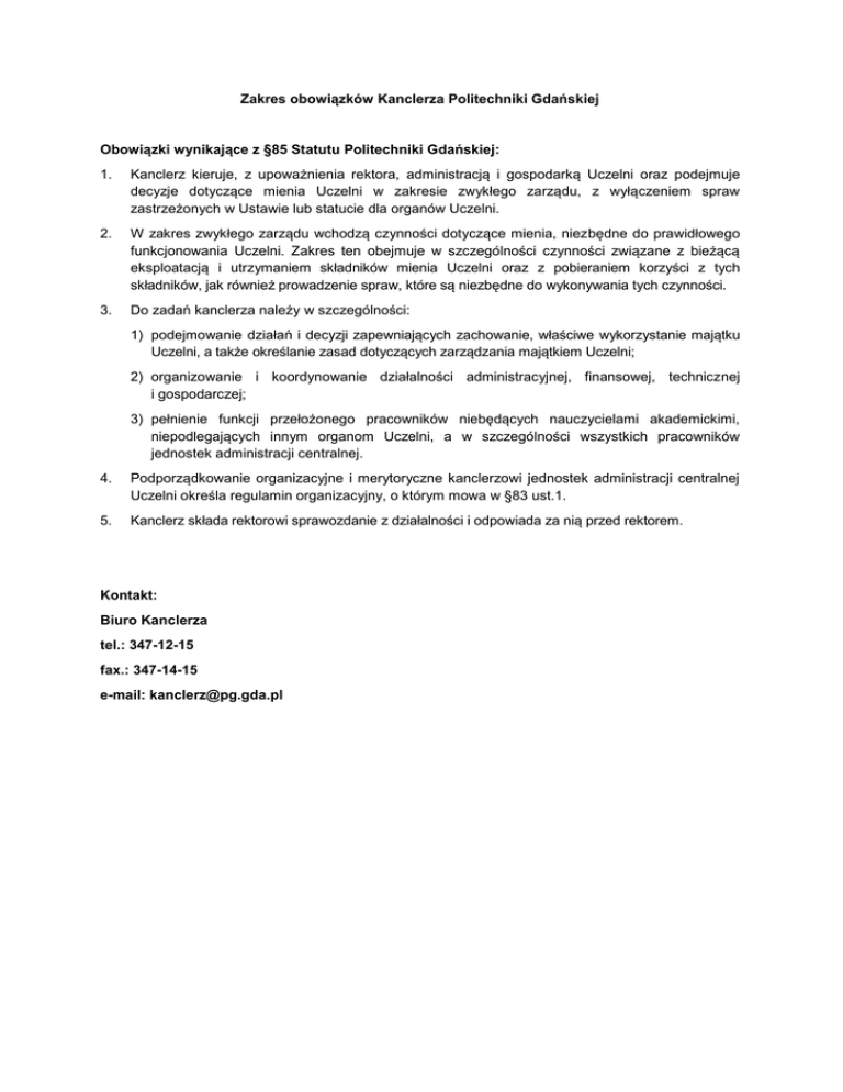 Zakres obowiązków Kanclerza Politechniki Gdańskiej Obowiązki wynikające z §85 Statutu Politechniki Gdańskiej: 1. Kanclerz kieruje, z upoważnienia rektora, administracją i gospodarką Uczelni oraz podejmuje decyzje dotyczące mienia Uczelni w zakresie zwykłego zarządu, z wyłączeniem spraw zastrzeżonych w Ustawie lub statucie dla organów Uczelni. 2. W zakres zwykłego zarządu wchodzą czynności dotyczące mienia, niezbędne do prawidłowego funkcjonowania Uczelni. Zakres ten obejmuje w szczególności czynności związane z bieżącą eksploatacją i utrzymaniem składników mienia Uczelni oraz z pobieraniem korzyści z tych składników, jak również prowadzenie spraw, które są niezbędne do wykonywania tych czynności. 3. Do zadań kanclerza należy w szczególności: 1) podejmowanie działań i decyzji zapewniających zachowanie, właściwe wykorzystanie majątku Uczelni, a także określanie zasad dotyczących zarządzania majątkiem Uczelni; 2) organizowanie i koordynowanie działalności administracyjnej, finansowej, technicznej i gospodarczej; 3) pełnienie funkcji przełożonego pracowników niebędących nauczycielami akademickimi, niepodlegających innym organom Uczelni, a w szczególności wszystkich pracowników jednostek administracji centralnej. 4. Podporządkowanie organizacyjne i merytoryczne kanclerzowi jednostek administracji centralnej Uczelni określa regulamin organizacyjny, o którym mowa w §83 ust.1. 5. Kanclerz składa rektorowi sprawozdanie z działalności i odpowiada za nią przed rektorem. Kontakt: Biuro Kanclerza tel.: 347-12-15 fax.: 347-14-15 e-mail: [email protected]
