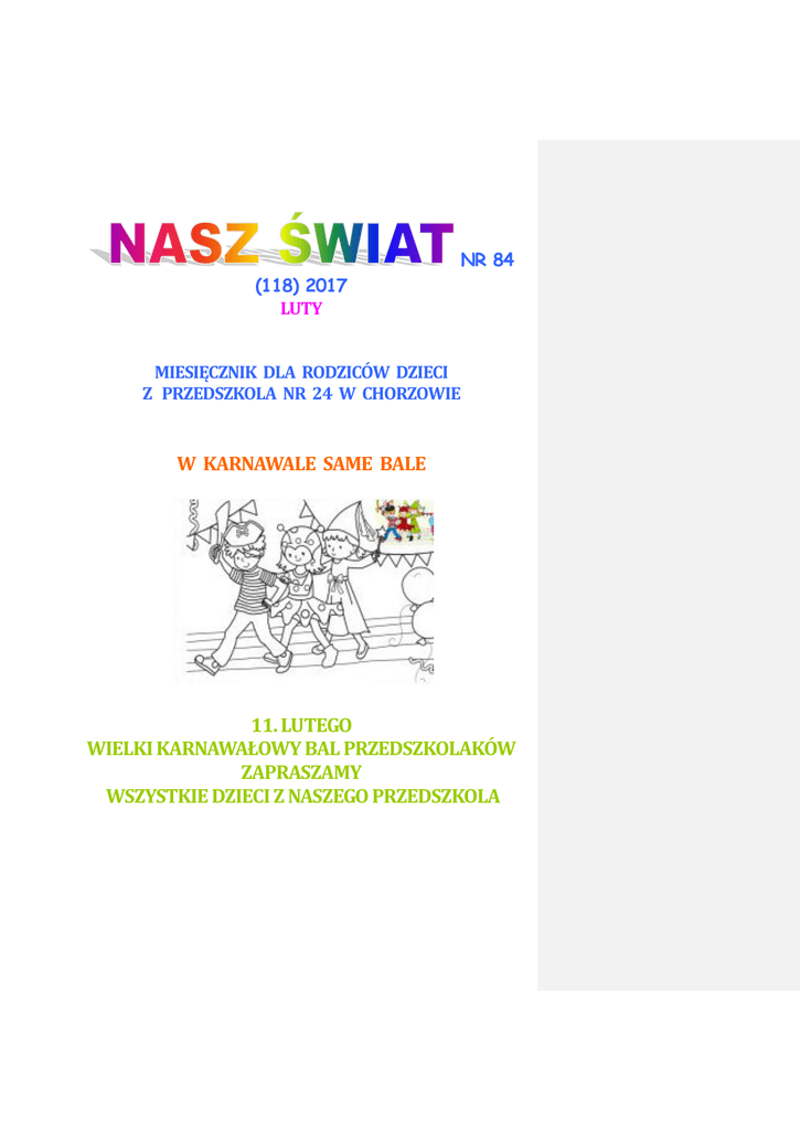 NR 84 (118) 2017 LUTY MIESIĘCZNIK DLA RODZICÓW DZIECI Z PRZEDSZKOLA NR 24 W CHORZOWIE W KARNAWALE SAME BALE 11. LUTEGO WIELKI KARNAWAŁOWY BAL PRZEDSZKOLAKÓW ZAPRASZAMY WSZYSTKIE DZIECI Z NASZEGO PRZEDSZKOLA AKTUALNOŚCI 30.01.2017 warsztaty plastyczne: kolorowe świeczki – prezenty dla babci i dziadka 1. i 2.02.2017 uroczystość przedszkolna Dzień babci i dziadka 11.02.2017 wielki karnawałowy bal przedszkolaków 8.02.2017 zajęcia organizowane we współpracy z Urzędem Miasta dla dzieci z grupy Pszczółki promocja lekkoatletyki w przedszkolu, zajęcia prowadzone przez panią Agnieszkę Gortel – Maciuk 1. i 2 LUTEGO NASZE PRZEDSZKOLE ORGANIZUJE W MŁODZIEŻOWYM DOMU KULTURY UROCZYSTOŚĆ Z OKAZJI ŚWIĘTA BABCI I DZIADKA SERDECZNIE ZAPRASZMY WSZYSTKIE KOCHANE BABCIE I DROGICH DZIADKÓW I SKŁADAMY IM NAJSERDECZNIEJSZE ŻYCZENIA : ZDROWIA, MIŁOŚCI I 200 LAT . Z komentarzem [KA1]: KILKA SŁÓW O TRADYCJI DZIEŃ BABCI obchodzony jest w Polsce co roku 21 stycznia, jako wyraz szacunku do naszych babć. Natomiast DZIEŃ DZIADKA obchodzimy dnia następnego, czyli 22 stycznia. ………………………………………………….. W tych dniach odwiedzamy swoich dziadków i babcie, składamy im życzenia, obdarowujemy kwiatami, prezentami, a mniejsze wnuczęta podarowują również laurki zrobione własnoręcznie. ………………………………………………… Święto babci i dziadka obchodzimy dopiero od około 30 lat, więc jest ono stosunkowo młode. ……………………………………………………………. W Polsce obchodzone 21. stycznia, w tym samym dniu w Bułgarii i Brazylii, a w Hiszpanii – 26 lipca. Pomysł utworzenia święta w Polsce pojawił się w tygodniku „Kobieta i Życie” w 1964 roku. Już rok później święto to zaczął popularyzować „Express Poznański”, a jego głównym pomysłodawcą był Kazimierz Flieger (zm. 1985). W roku 1966 również „Express Wieczorny” ogłosił dzień 21 stycznia „dniem babci”. Później powstała również tradycja obchodzenia Dnia Dziadka. We Francji Jest to święto ruchome i obchodzone jest w pierwszą niedzielę marca. Powstało jako rozwinięcie pomysłu na popularną kawę Babci czyli Café Grand'Mère. Była to w północnej Francji lat 50. XX w. bardzo popularna kawa, stworzona i sprzedawana przez małżeństwo Monnier z Roubaix, właścicieli delikatesów. Święto jest okazją do wielu konkursów na najpiękniejsze laurki dla babć, najładniejsze życzenia, wspomnienia o babciach, oraz spotkania z babciami, przy ciastku i kawie. Działa także stowarzyszenie "Fête des grand-mères" które m.in. organizuje pochody ku czci babć, zwane "Mamif'estation". W Rosji W Rosji, jesienią 2009 roku, pojawiło się nowe, rodzinne święto – „Dzień babci i dziadka” (ros. День бабушек и дедушек). Jednakże, jak podaje Press-Center (ros. пресс-центр „АиФ”) 15 października 2009, jest to Rosyjski Dzień Babci (ros. Российский День Бабушки). Brak oficjalnej daty obchodów. W Ameryce Amerykańskim (w USA i Kanadzie) odpowiednikiem dni dziadka i babci jest Narodowy Dzień Dziadków, ang. National Grandparents Day. Nie jest więc świętem rozdzielonym na dwa dni. W USA jest to święto oficjalnie zatwierdzone przez Kongres i prezydenta, ustanowione w 1978 roku przez Jimmy’ego Cartera na pierwszą niedzielę po Święcie Pracy Labour Day, które obchodzone jest w pierwszy poniedziałek września zarówno w USA, jak i Kanadzie. Tak więc Dzień Dziadków w obu krajach również obchodzony jest we wrześniu. Dzień ten ma swój oficjalny hymn A Song for Grandma and Grandpa („Piosenka dla Babci i Dziadka”), a symbolem tego dnia jest niezapominajka. W szkołach, kościołach i domach spokojnej starości organizowane są uroczystości. Święto celebruje się także w gronie rodzinnym przy ogniskach, czy grillach. Dzień ten ma za zadanie uświadomić dzieciom, jak wiele zawdzięczają swoim dziadkom. Wnuki są zachęcane do pomocy najstarszym członkom rodziny. W Wielkiej Brytanii W Wielkiej Brytanii National Grandparents Day obchodzony jest w pierwszą niedzielę października. KĄCIK PRZEDSZKOLAKA Redaktor naczelny: mgr Małgorzata Nowak Tel./faks: (32)249 30 71